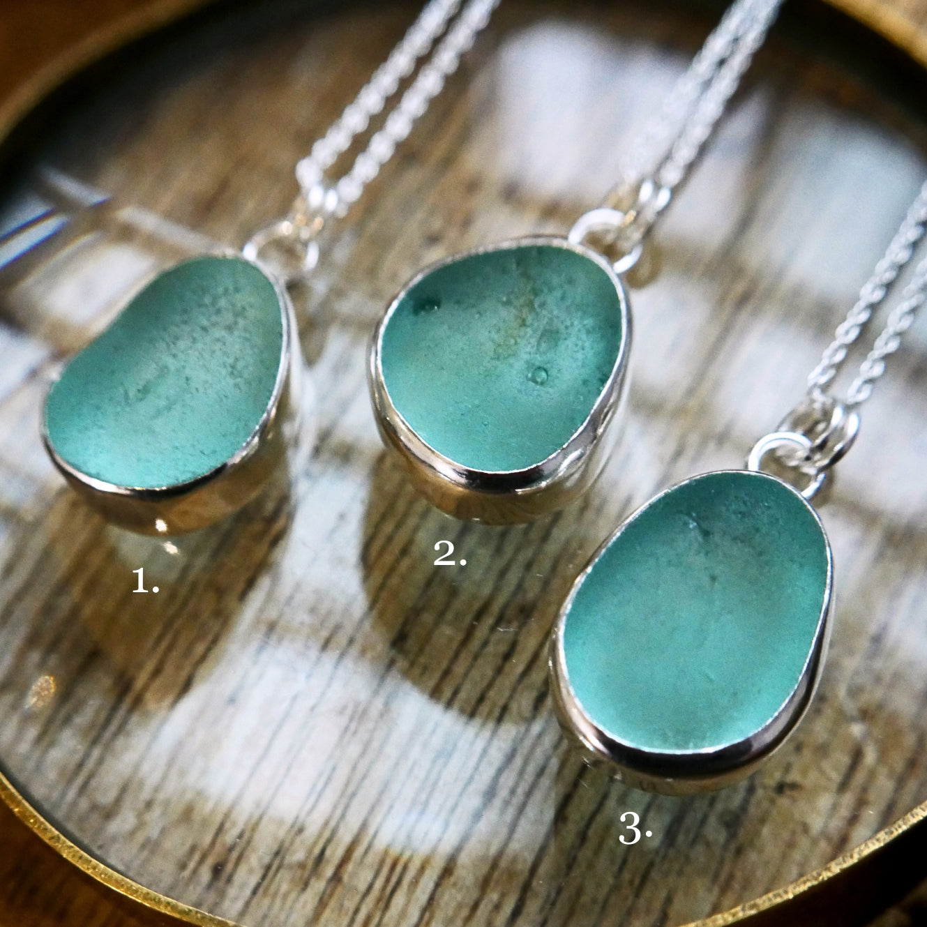 Each of our classic sea glass necklaces are completely unique and come in a wide variety of shapes and colours, all of which have been hand collected and found on shores all over Scotland by us. 100% hand crafted in beautiful, bright sterling silver in our Glasgow shop.