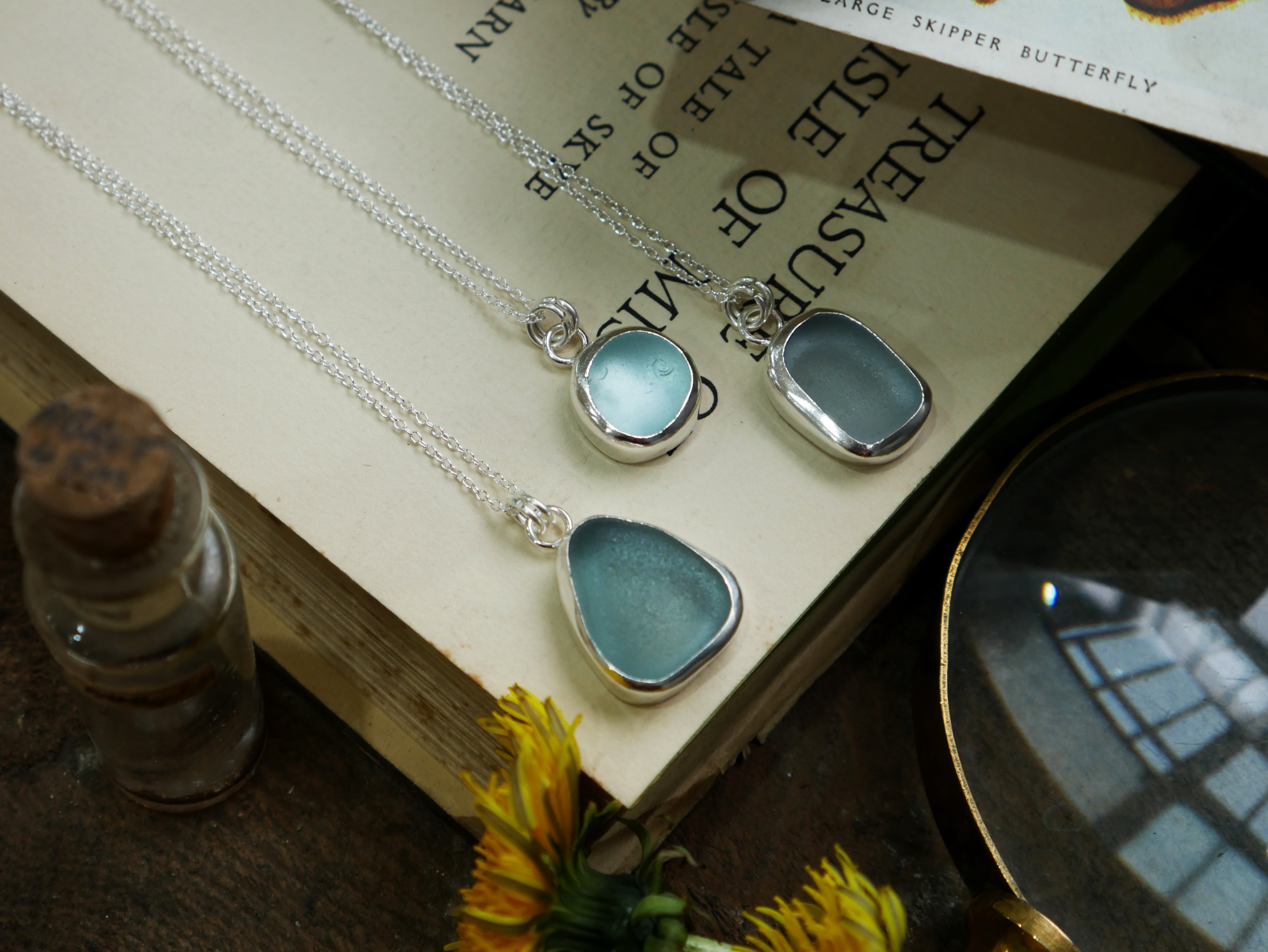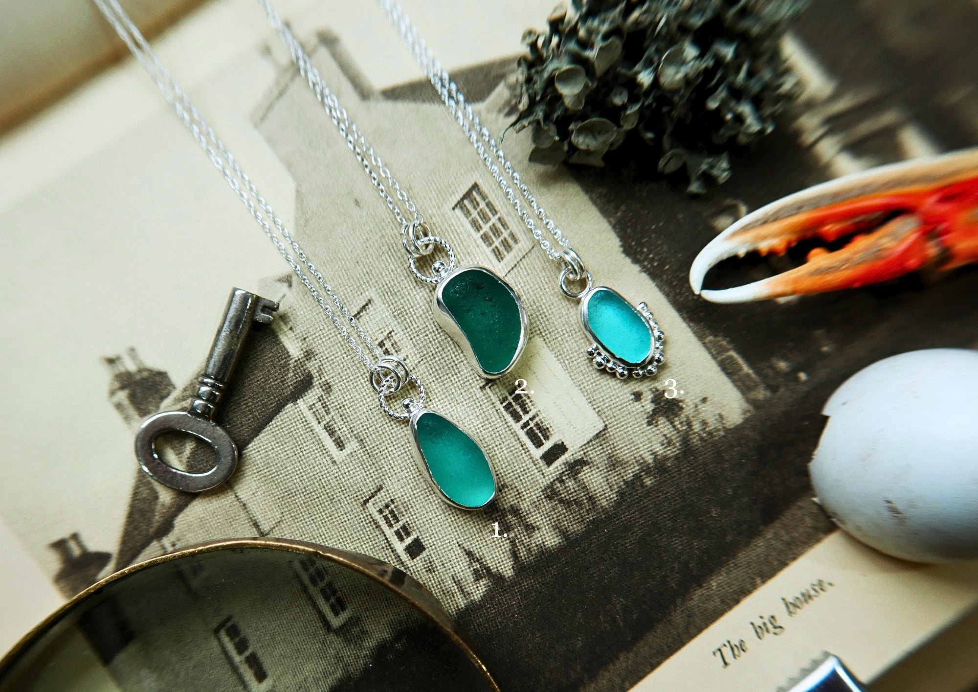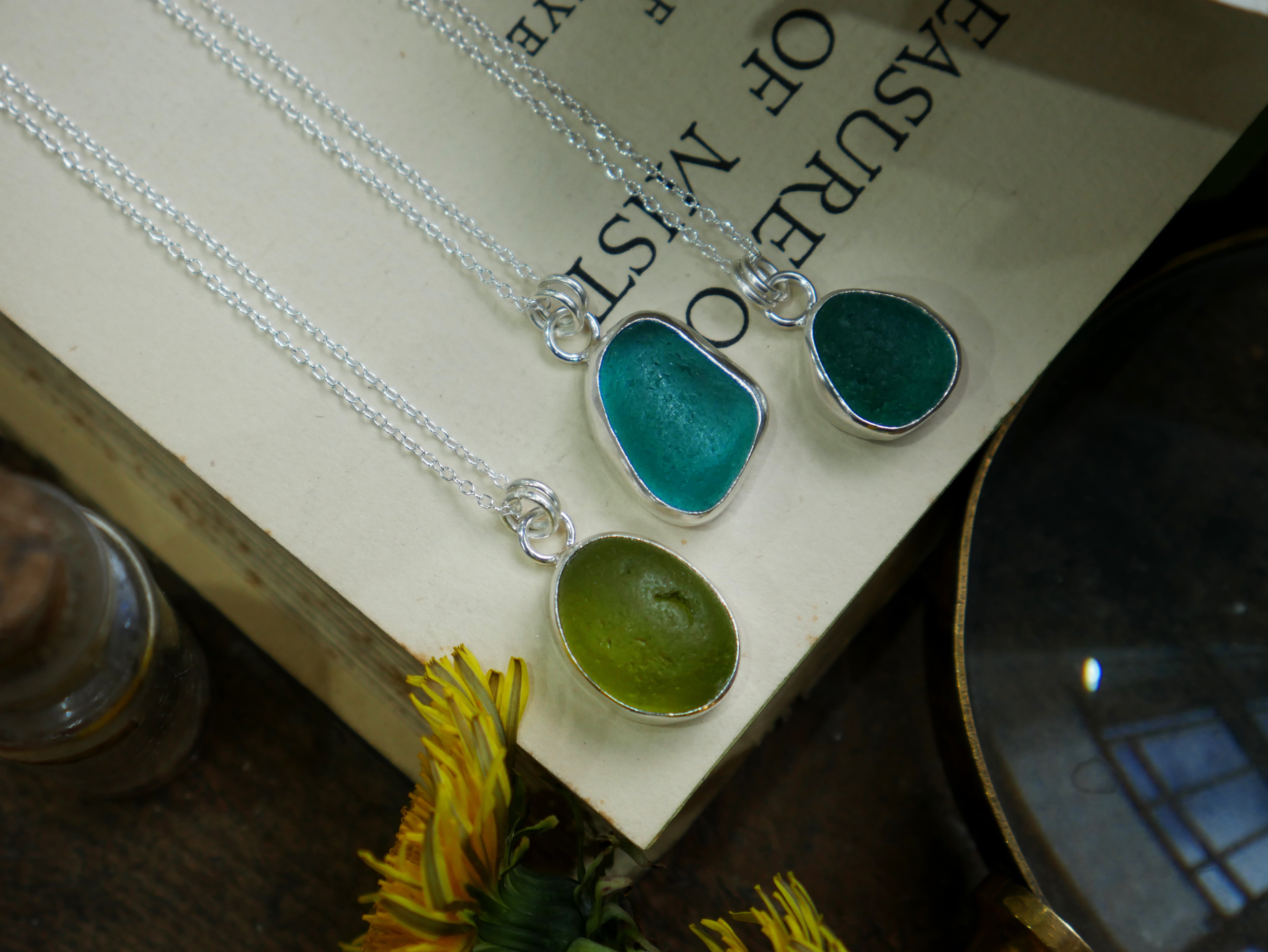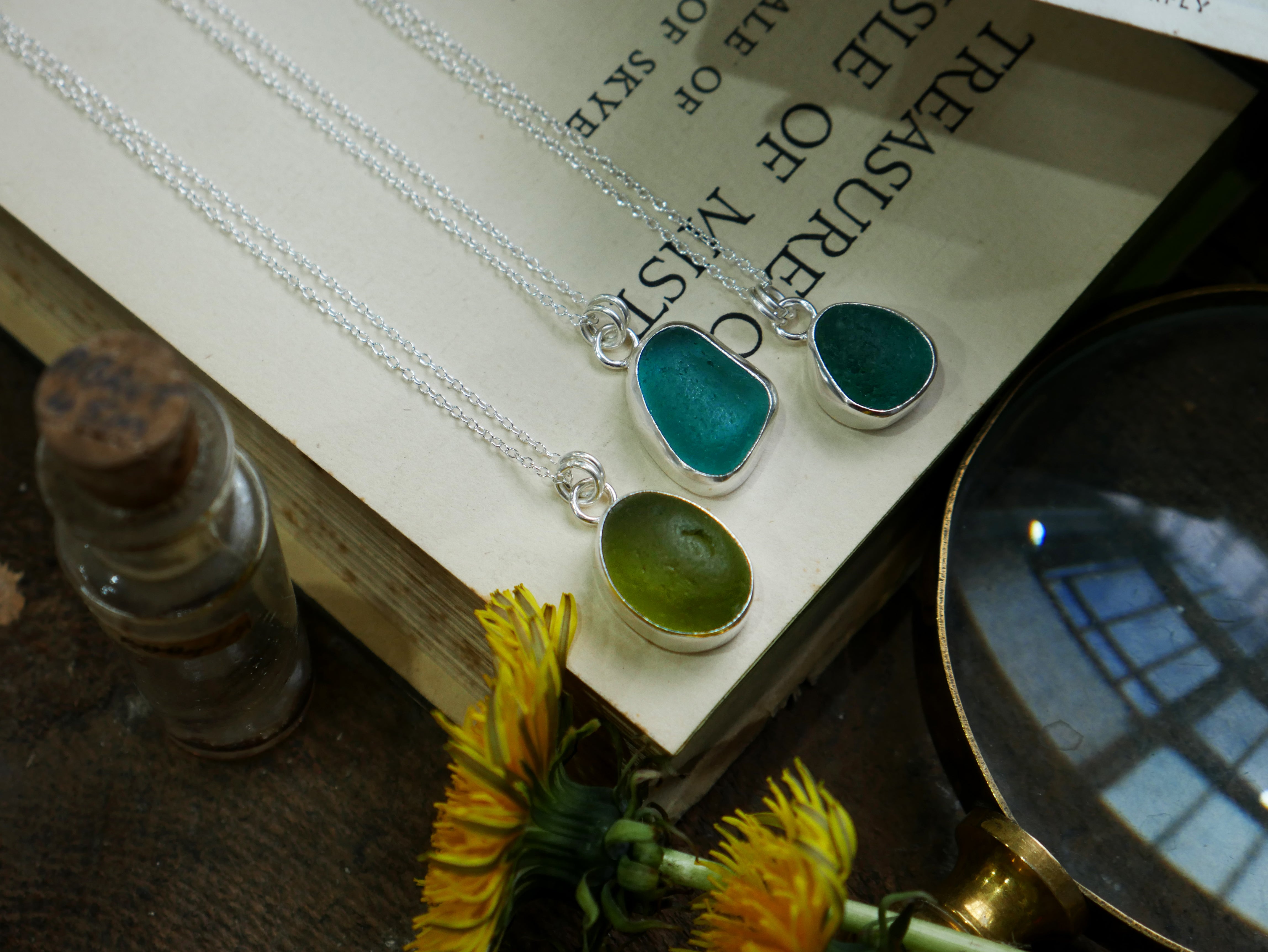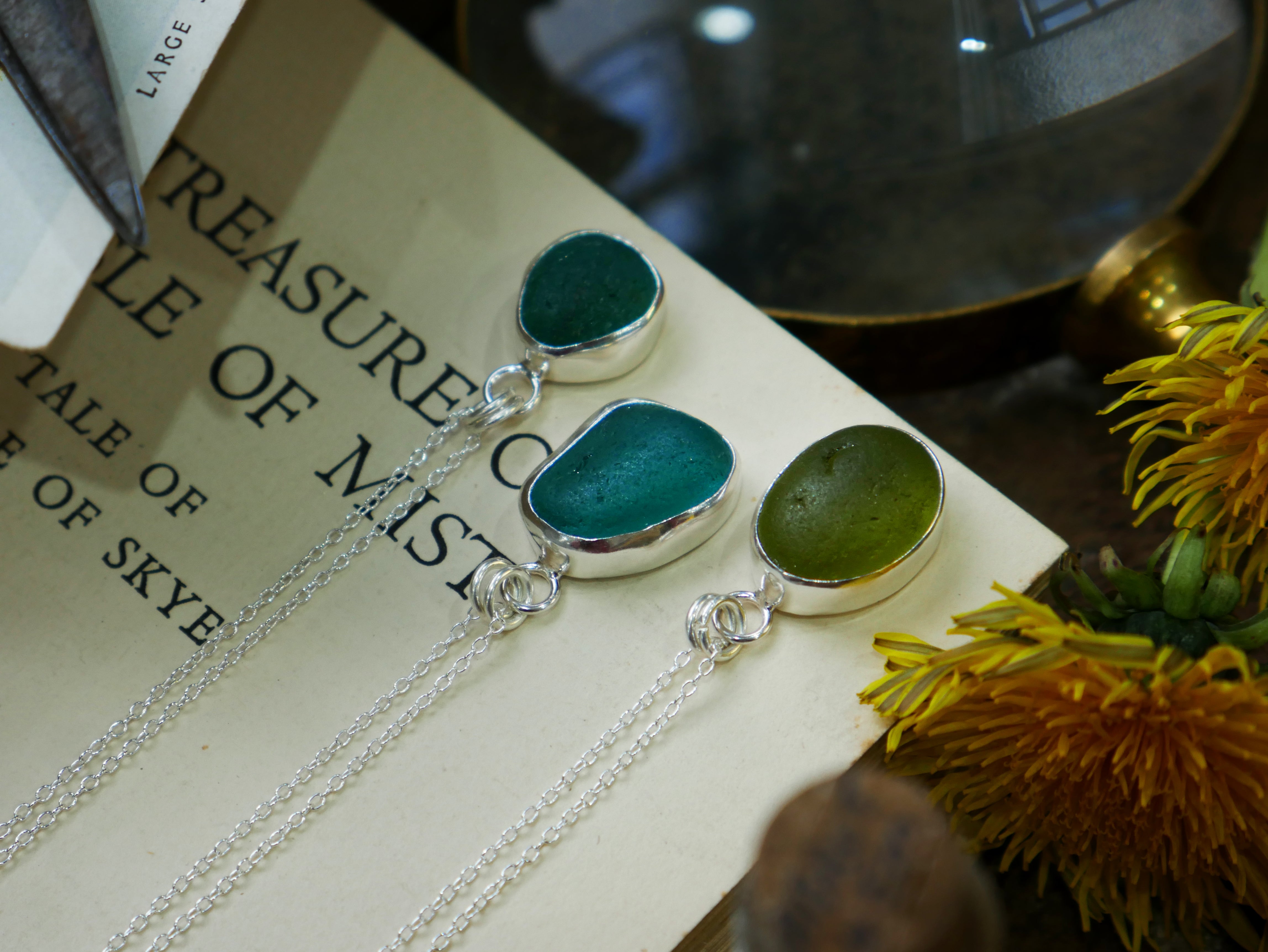 Each of our classic sea glass necklaces are completely unique and come in a wide variety of shapes and colours, all of which have been hand collected and found on shores all over Scotland by us. 100% hand crafted in beautiful, bright sterling silver in our Glasgow shop.