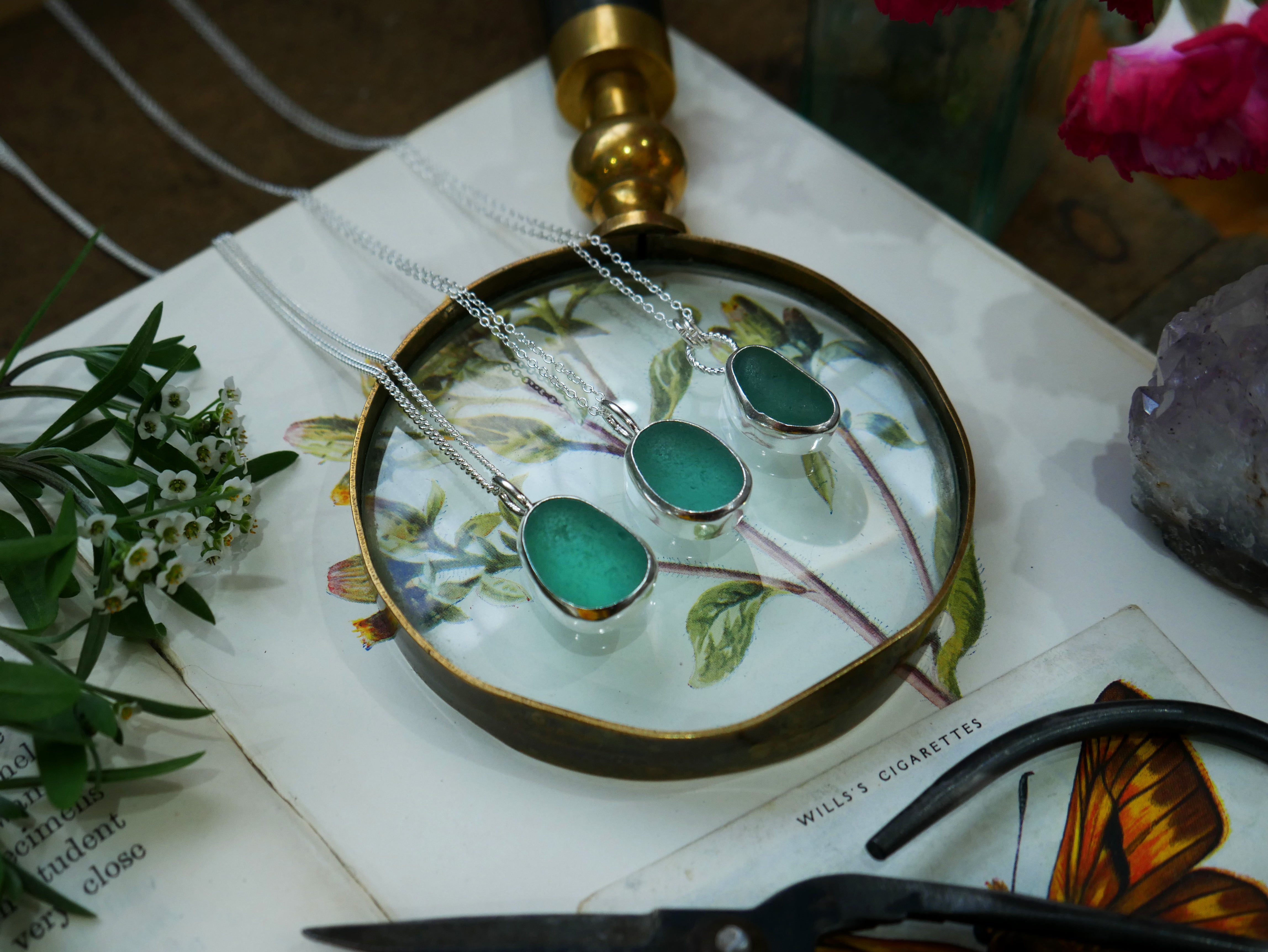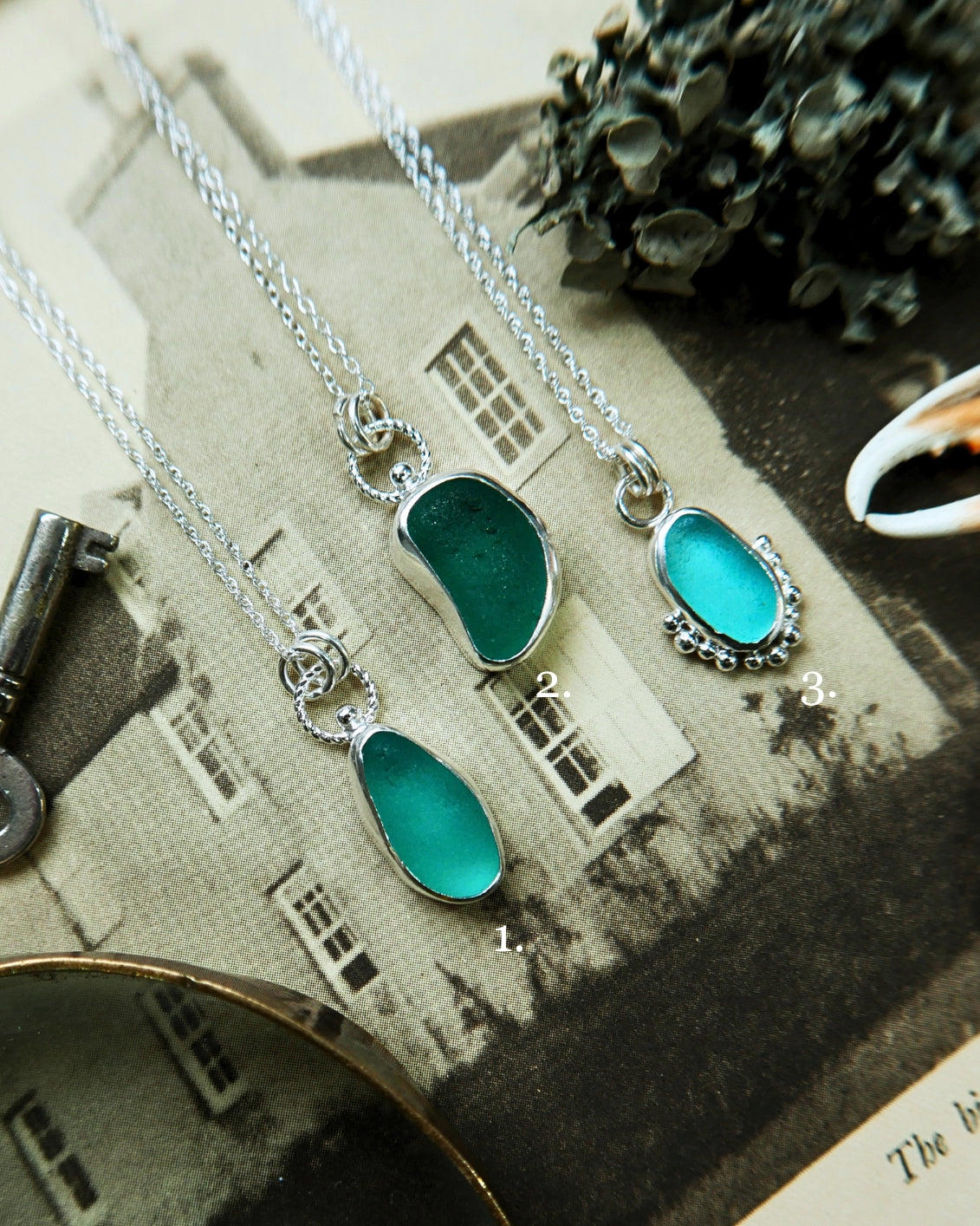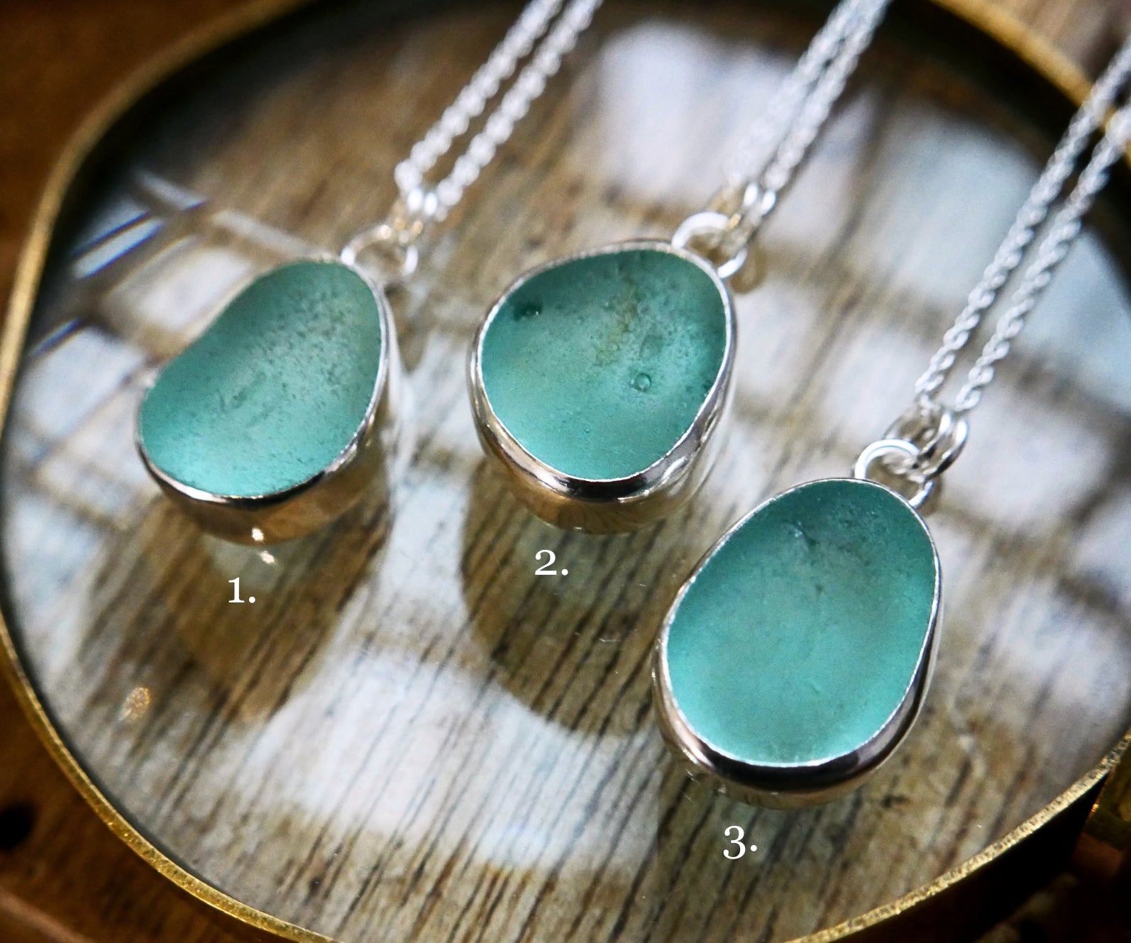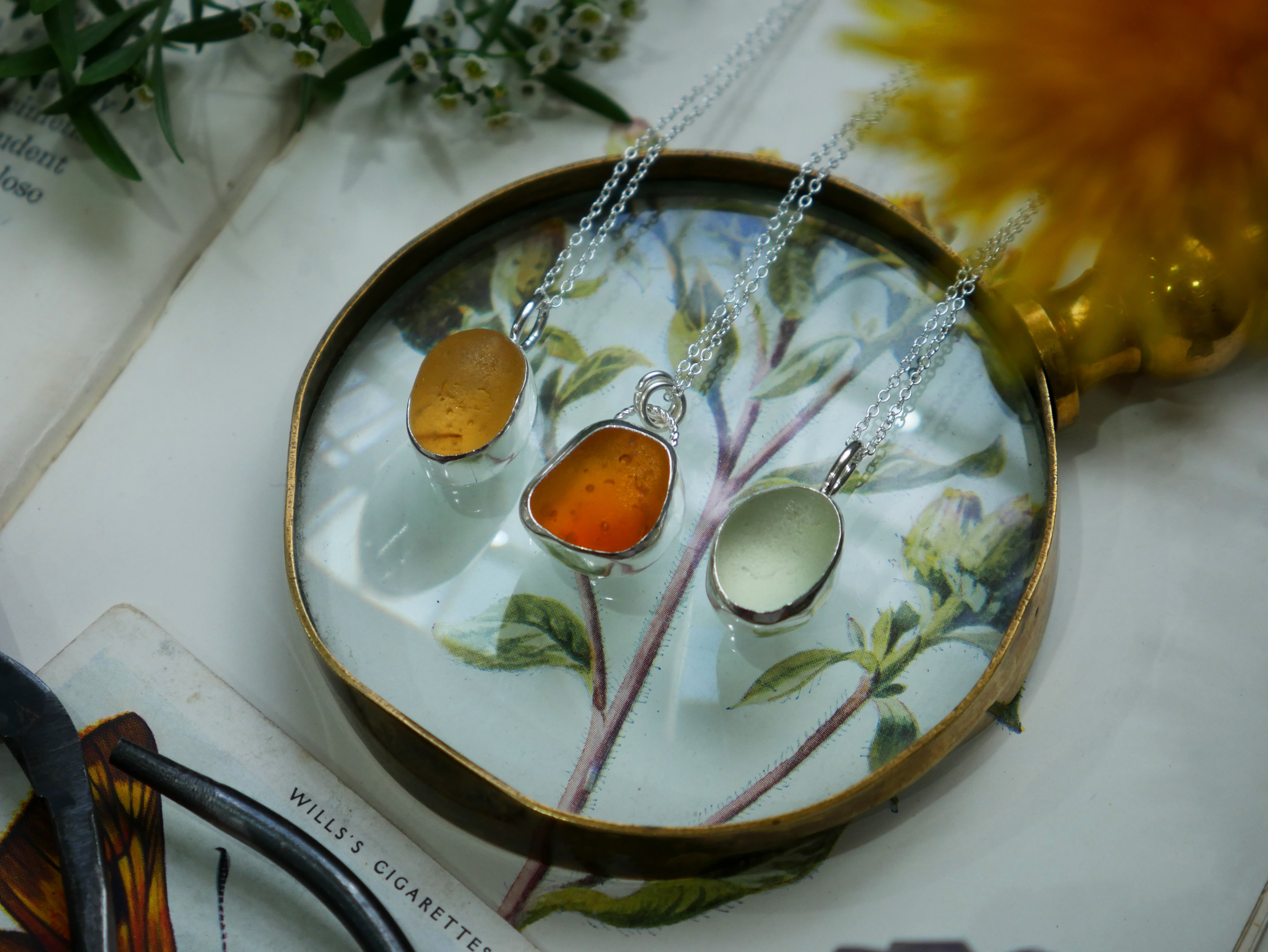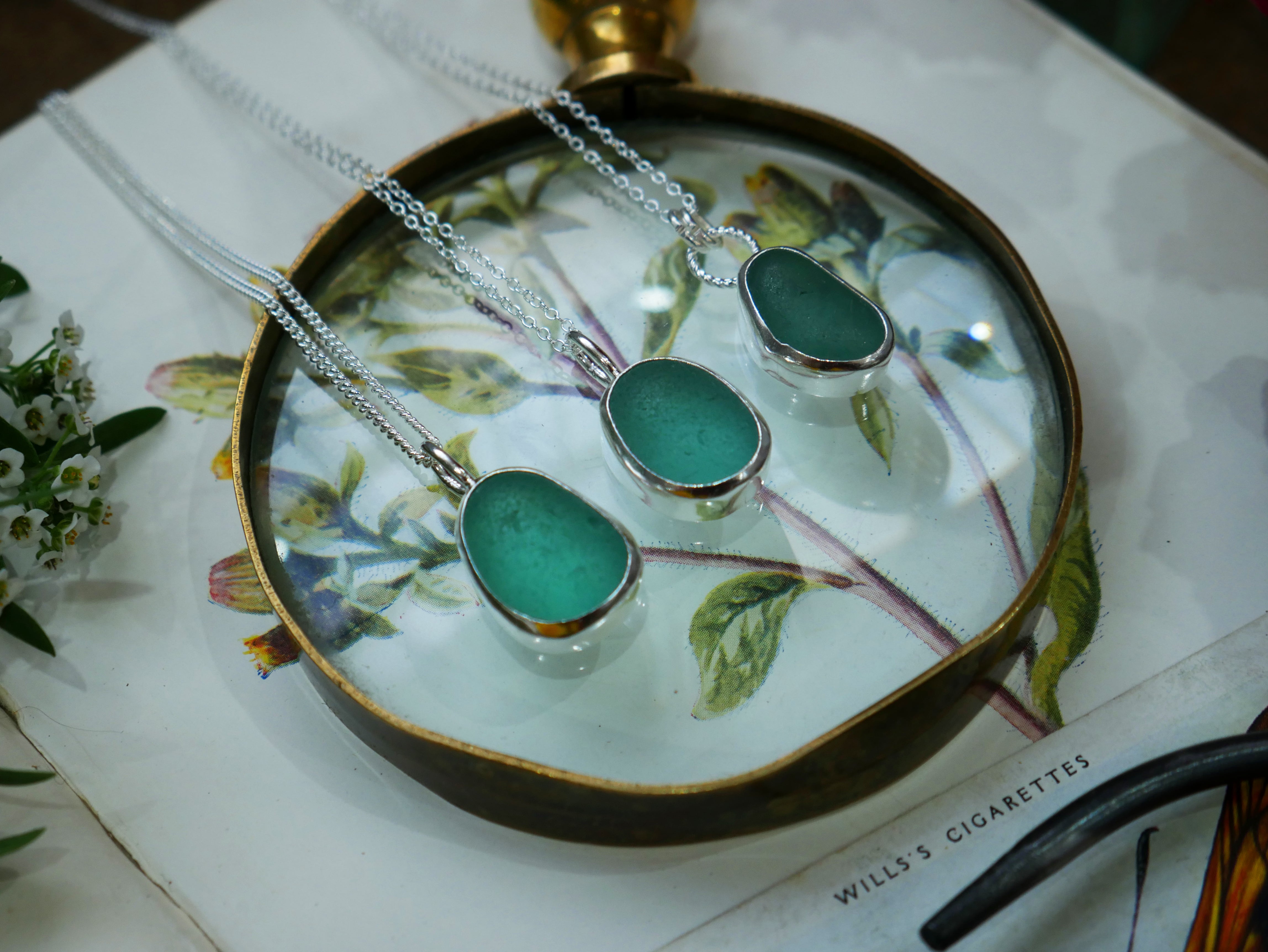 Each of our classic sea glass necklaces are completely unique and come in a wide variety of shapes and colours, all of which have been hand collected and found on shores all over Scotland by us. 100% hand crafted in beautiful, bright sterling silver in our Glasgow shop.
