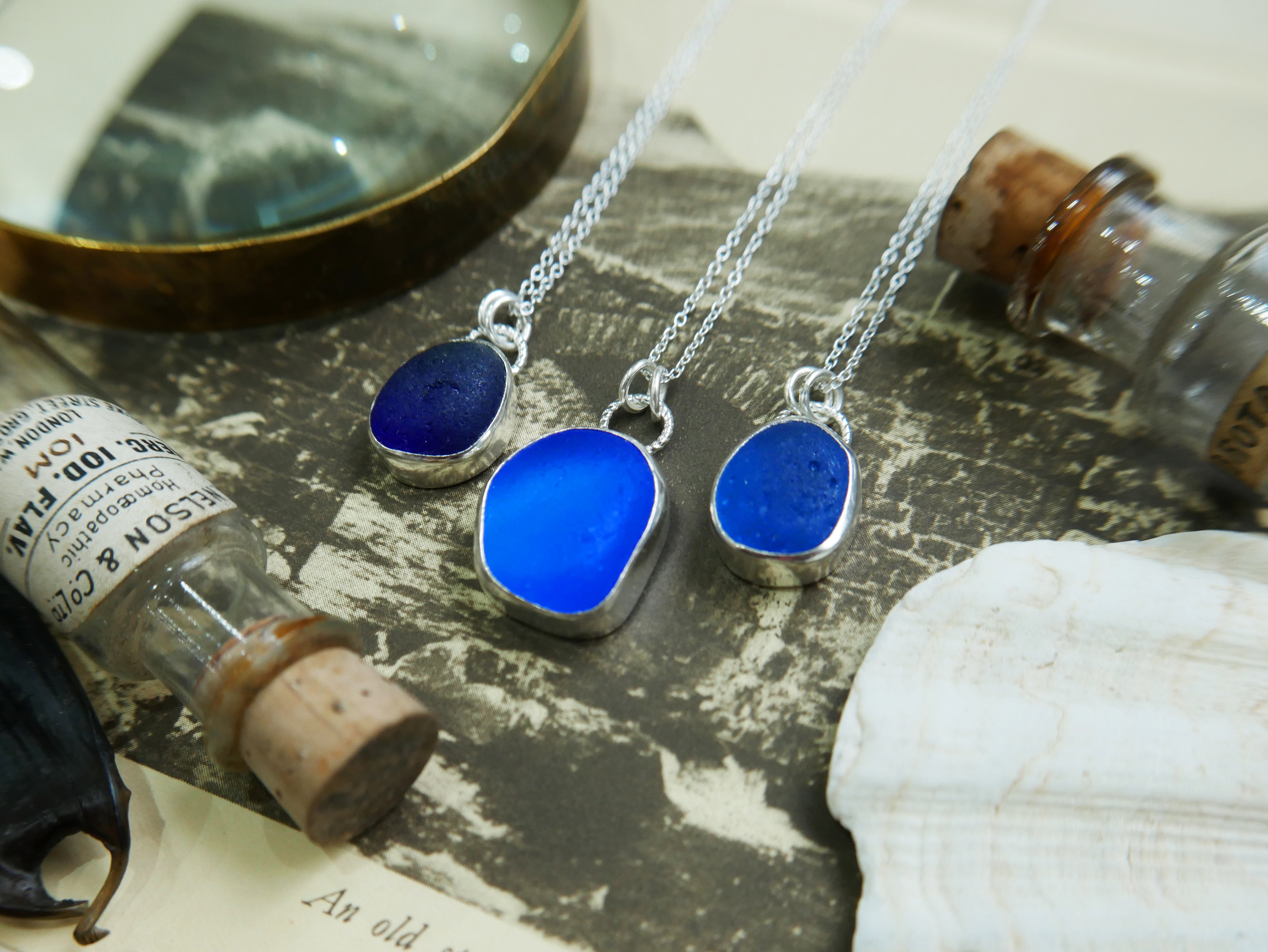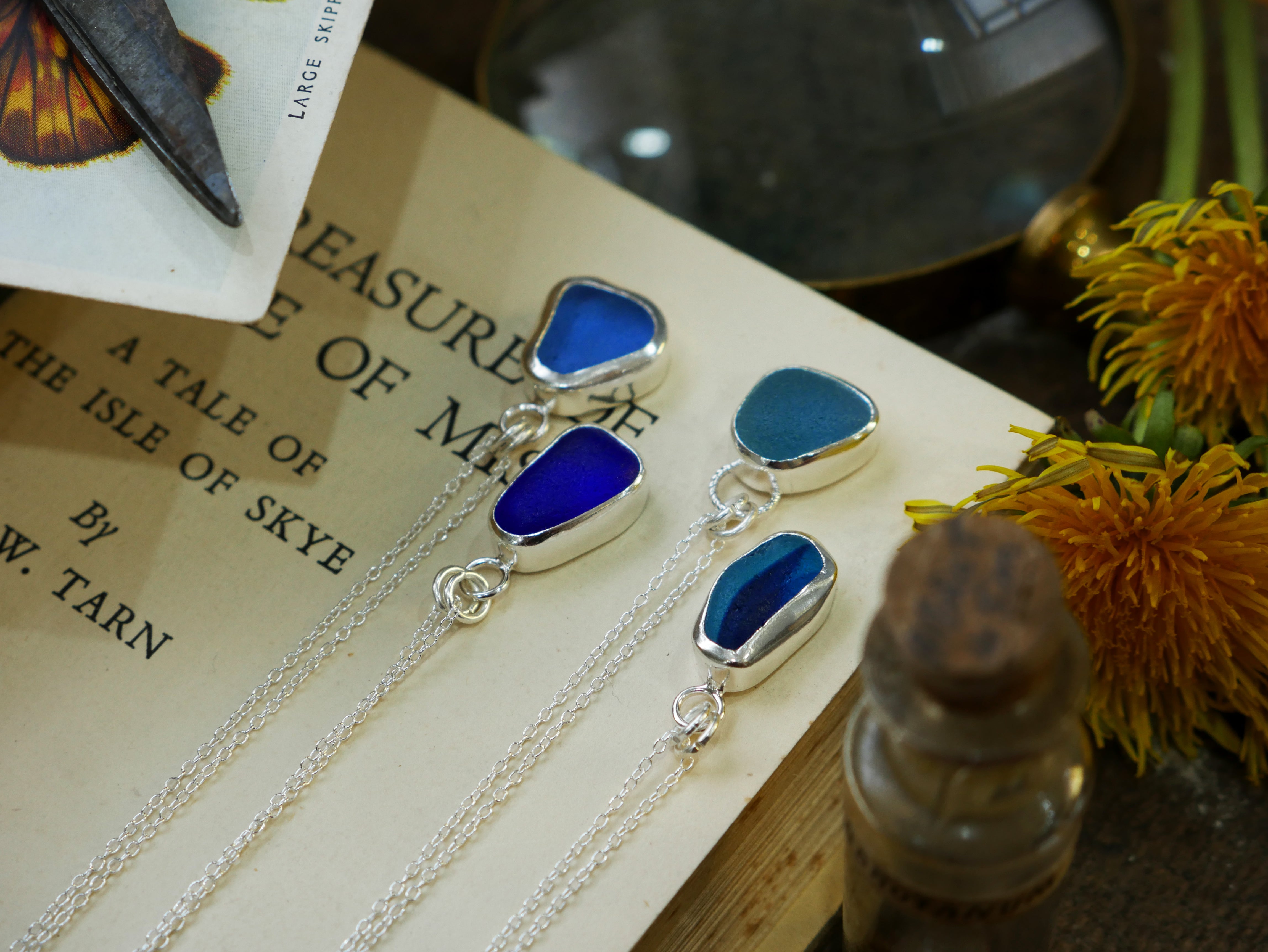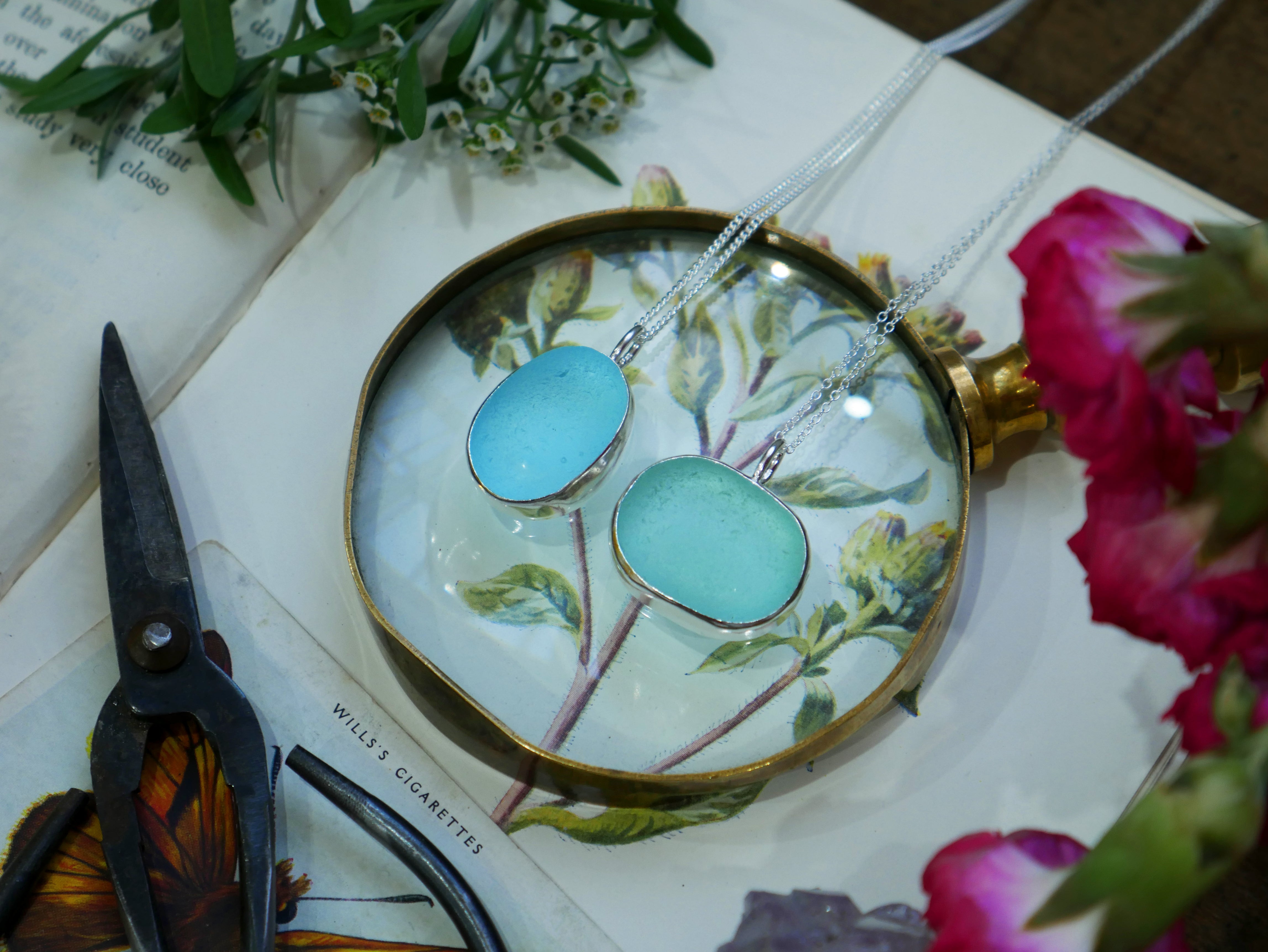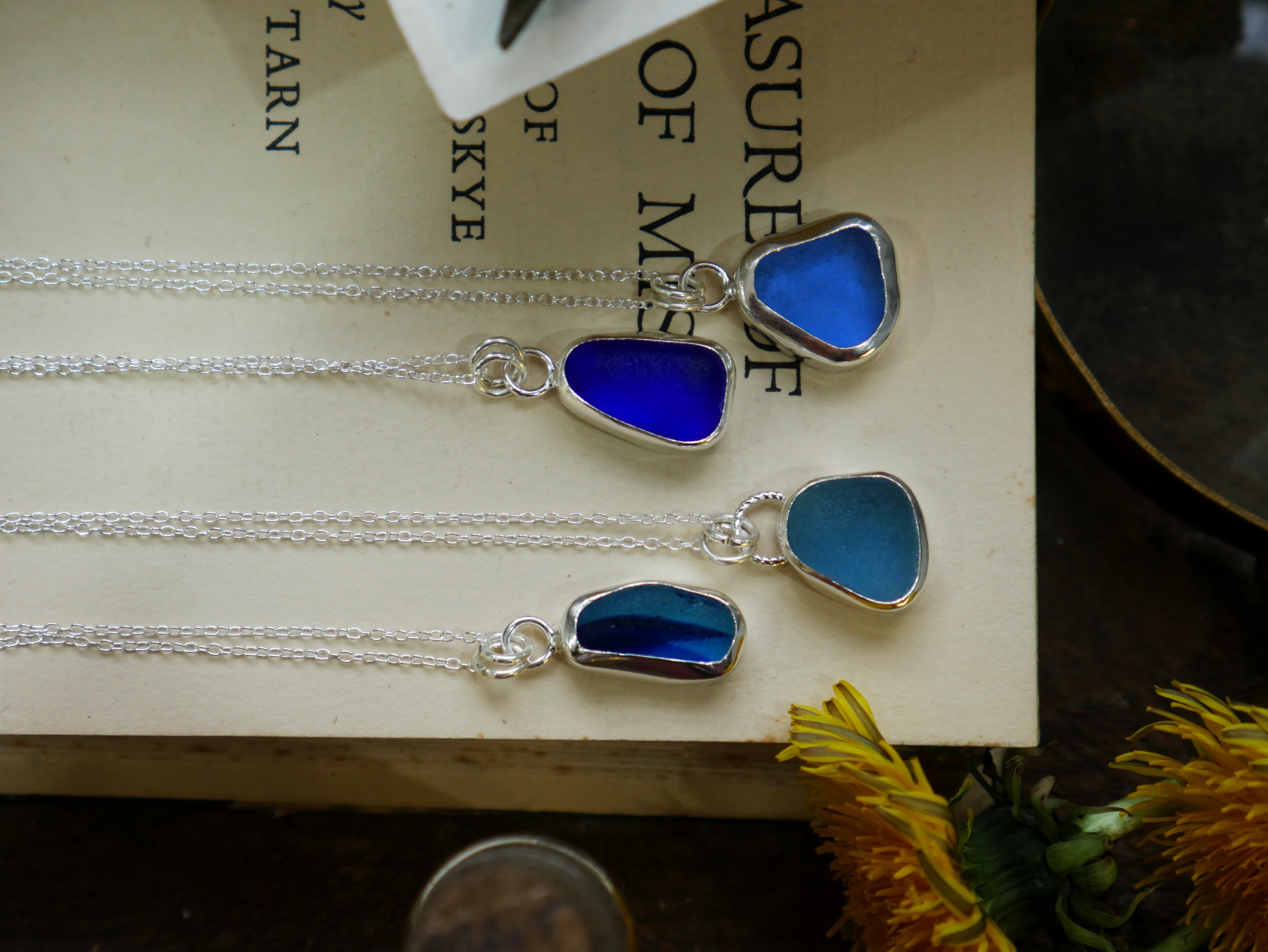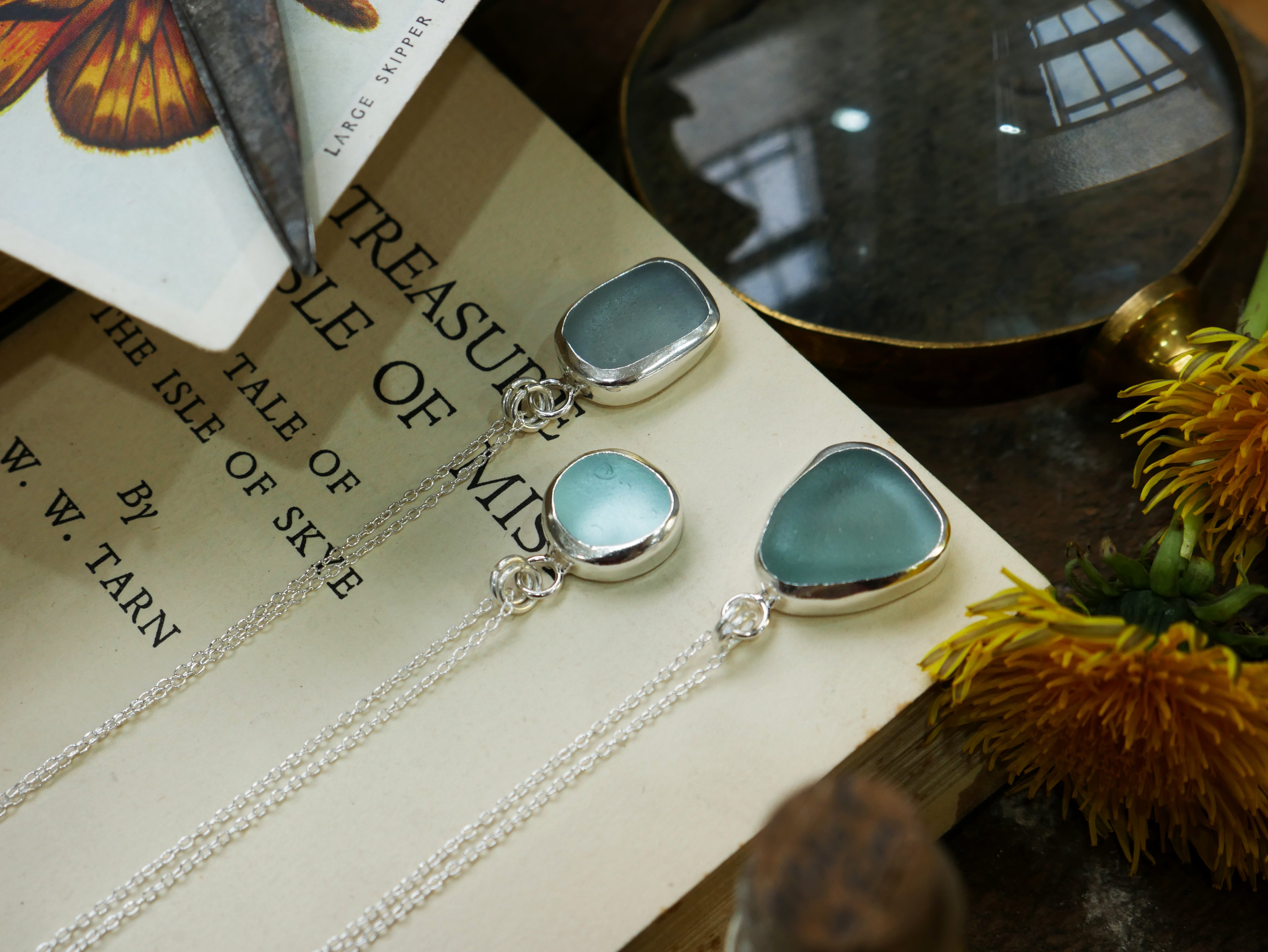 Each of our classic sea glass necklaces are completely unique and come in a wide variety of shapes and colours, all of which have been hand collected and found on shores all over Scotland by us. 100% hand crafted in beautiful, bright sterling silver in our Glasgow shop.