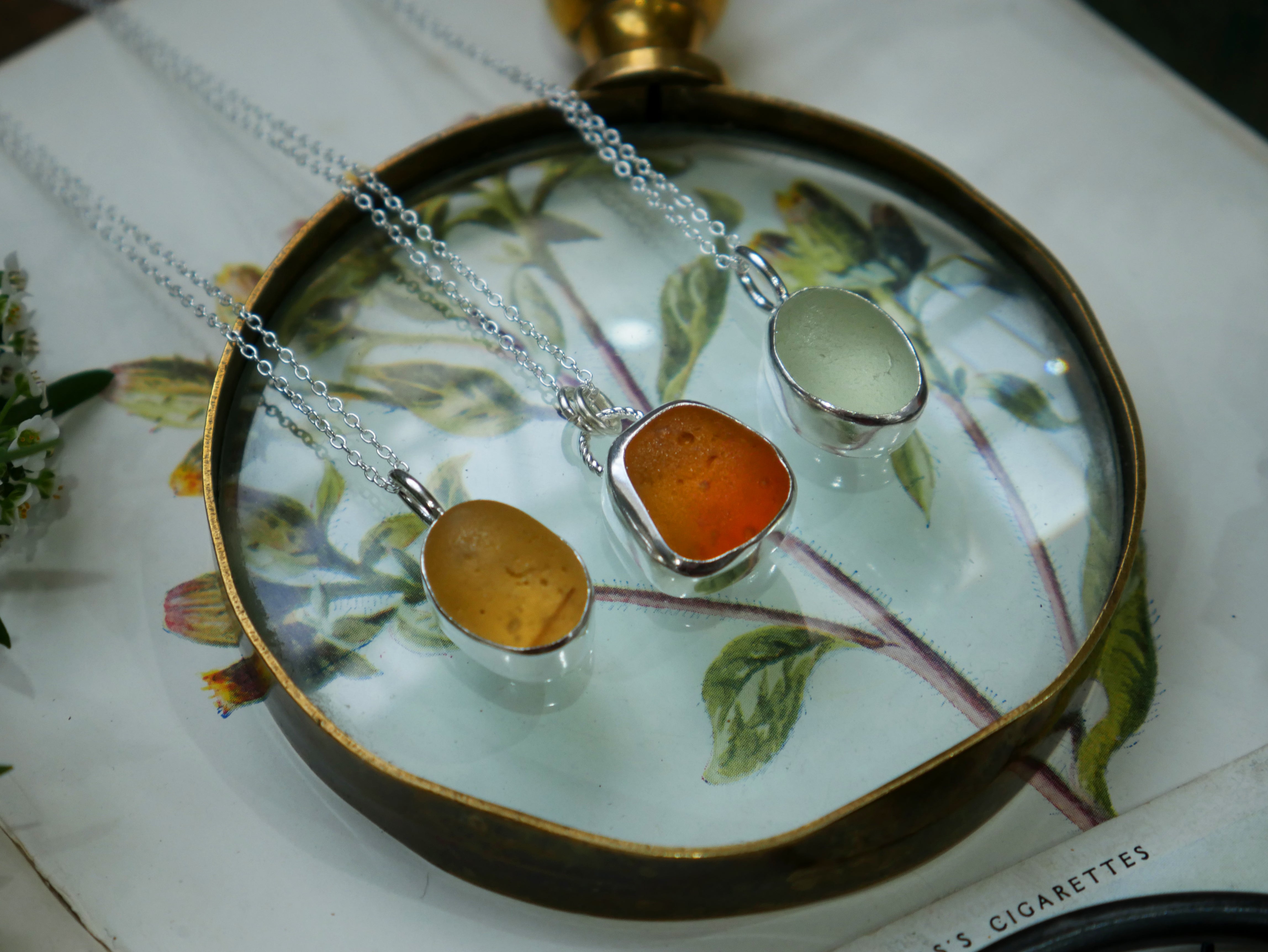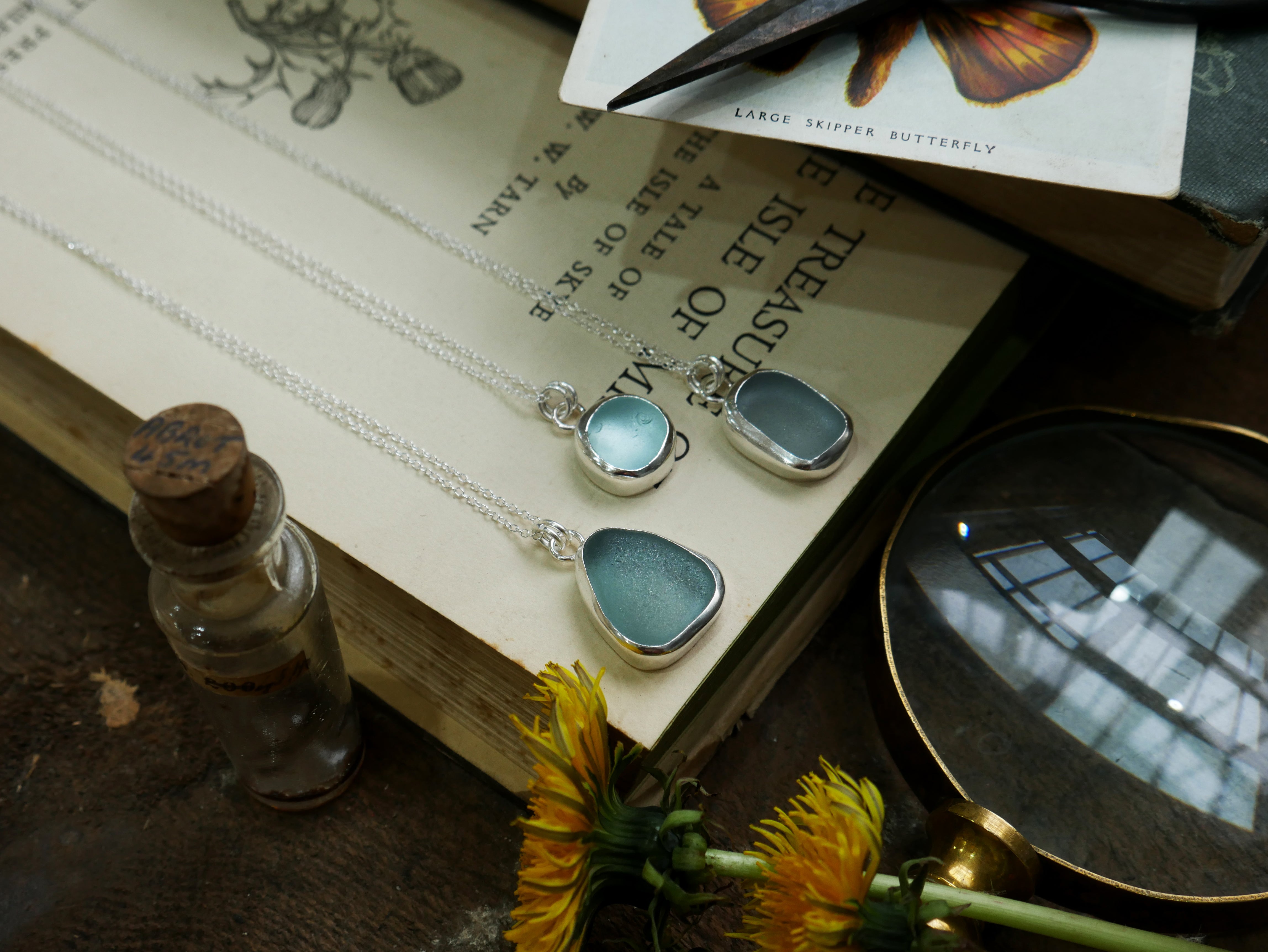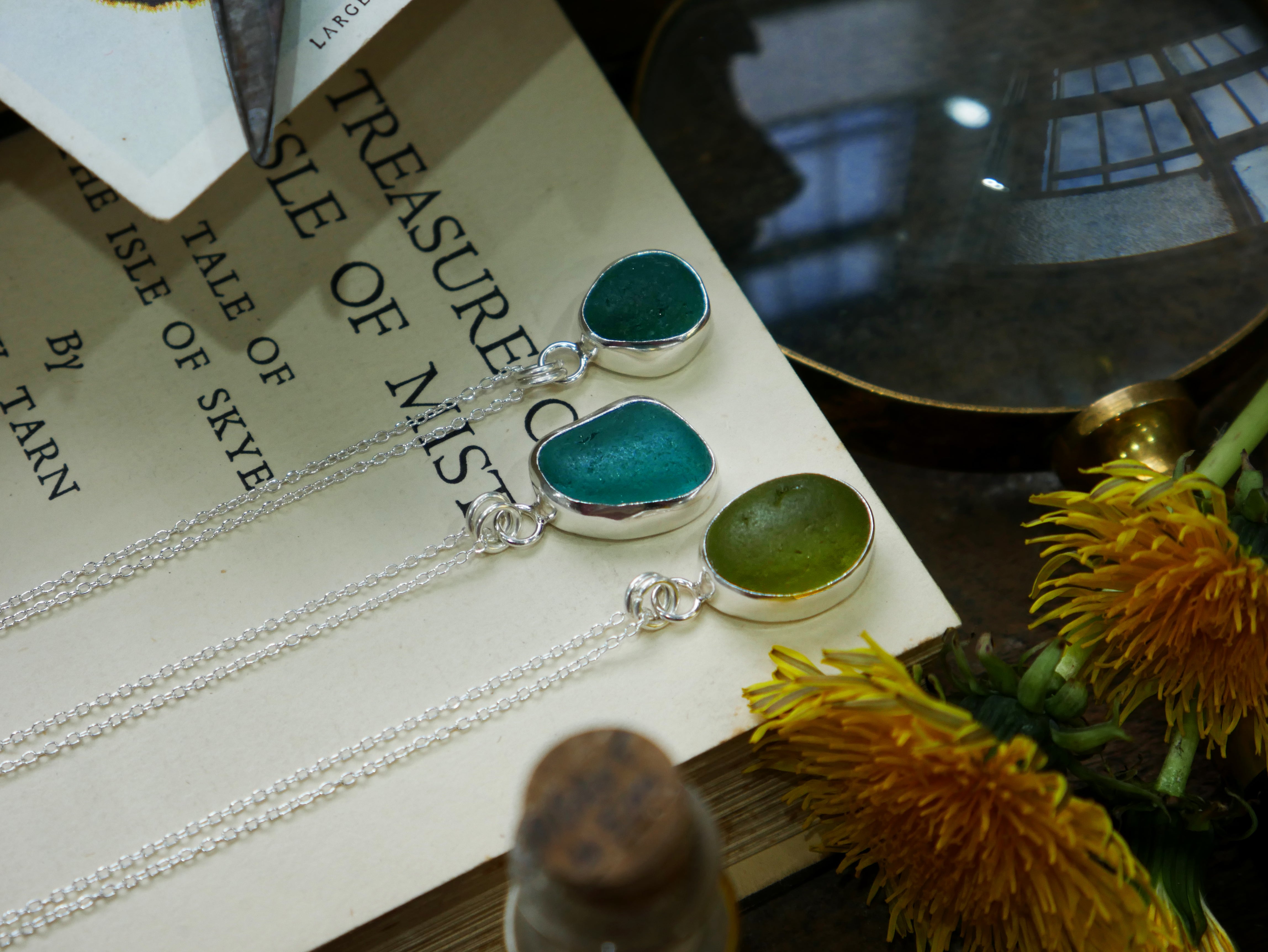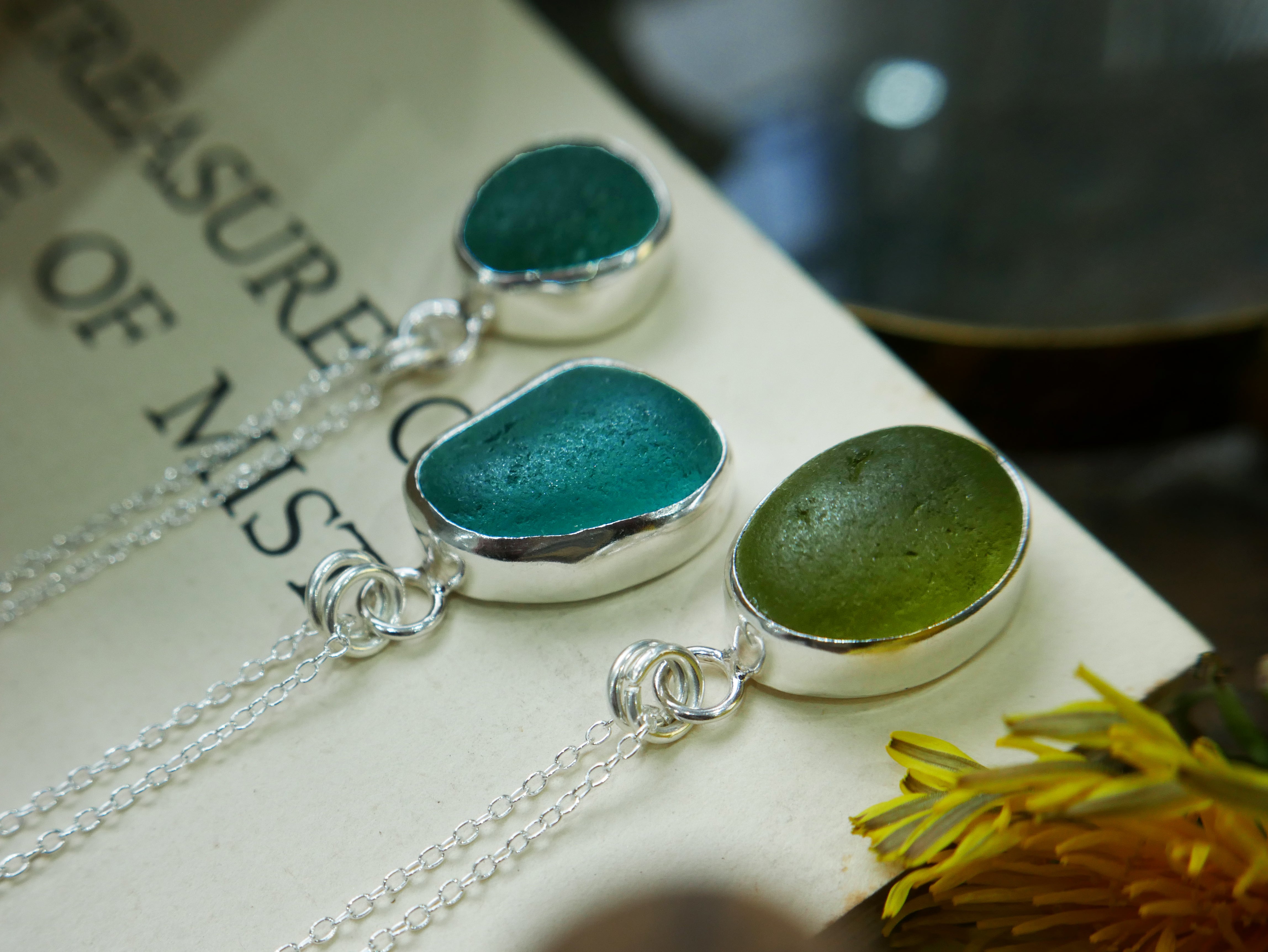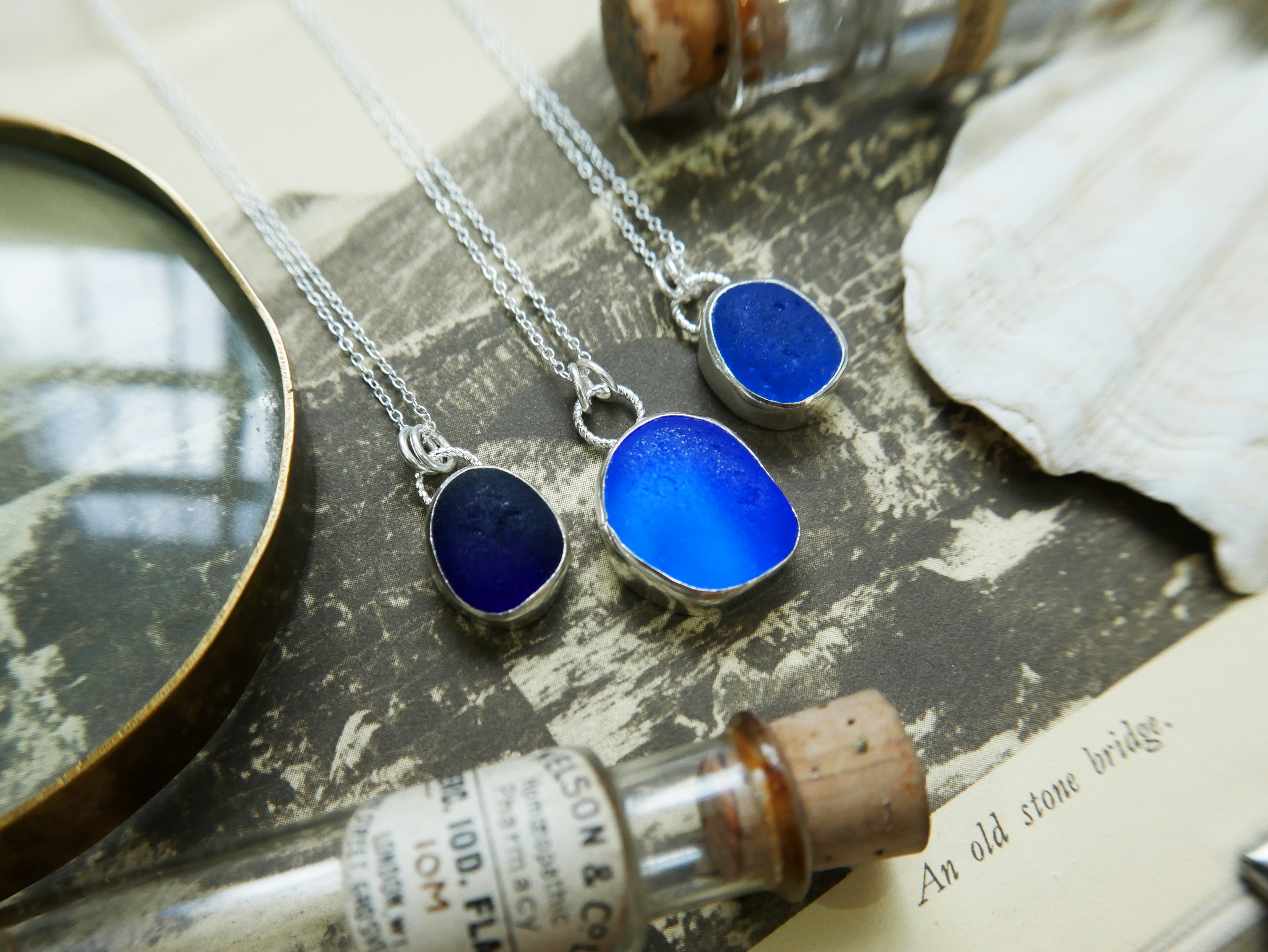 Each of our classic sea glass necklaces are completely unique and come in a wide variety of shapes and colours, all of which have been hand collected and found on shores all over Scotland by us. 100% hand crafted in beautiful, bright sterling silver in our Glasgow shop.