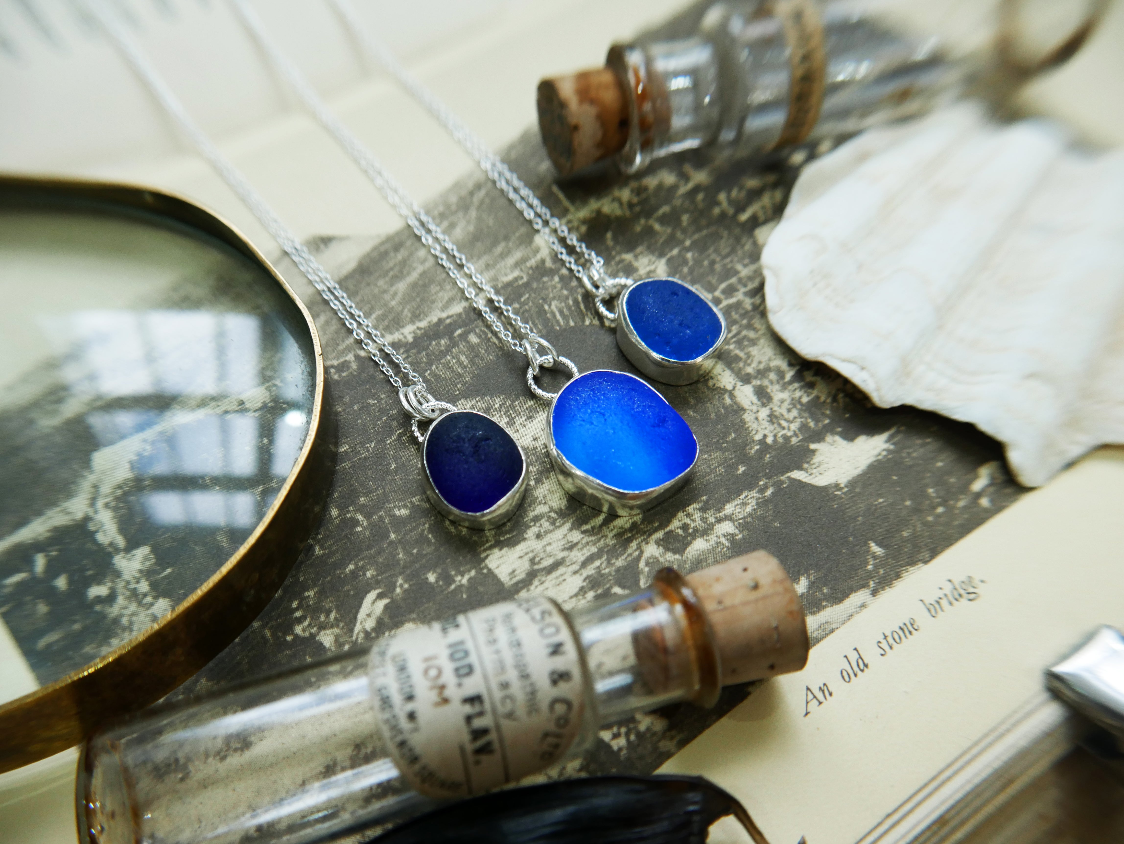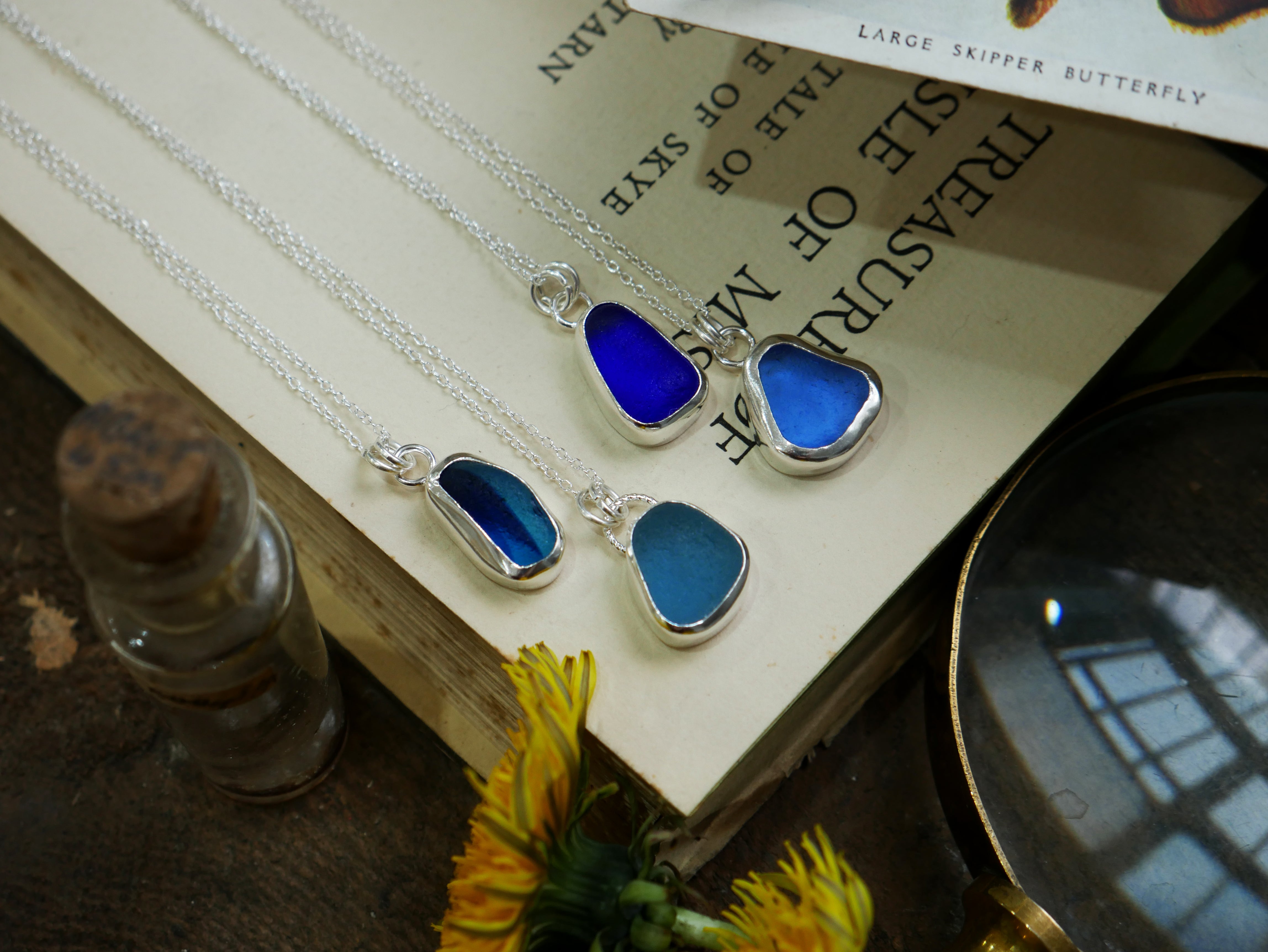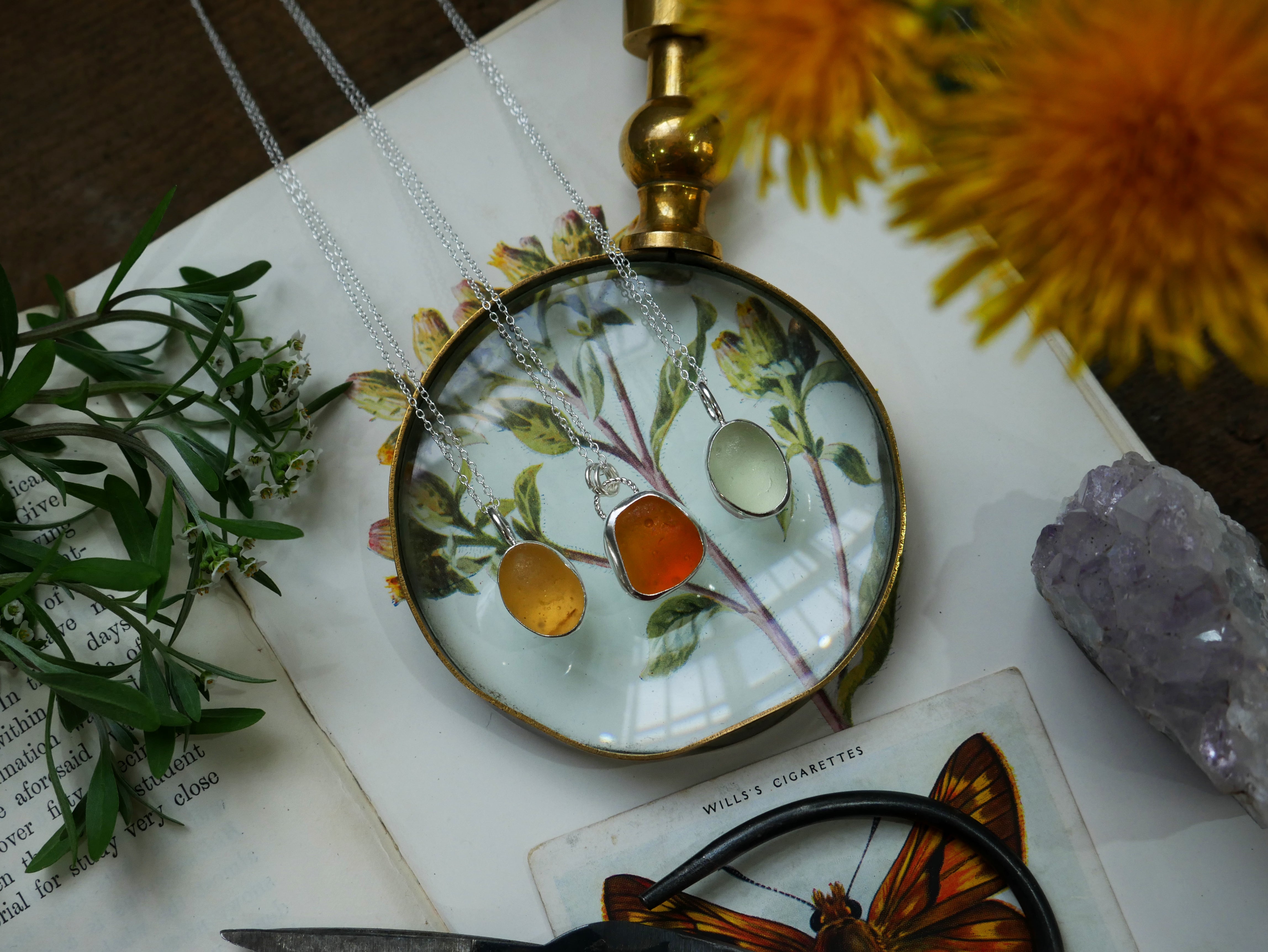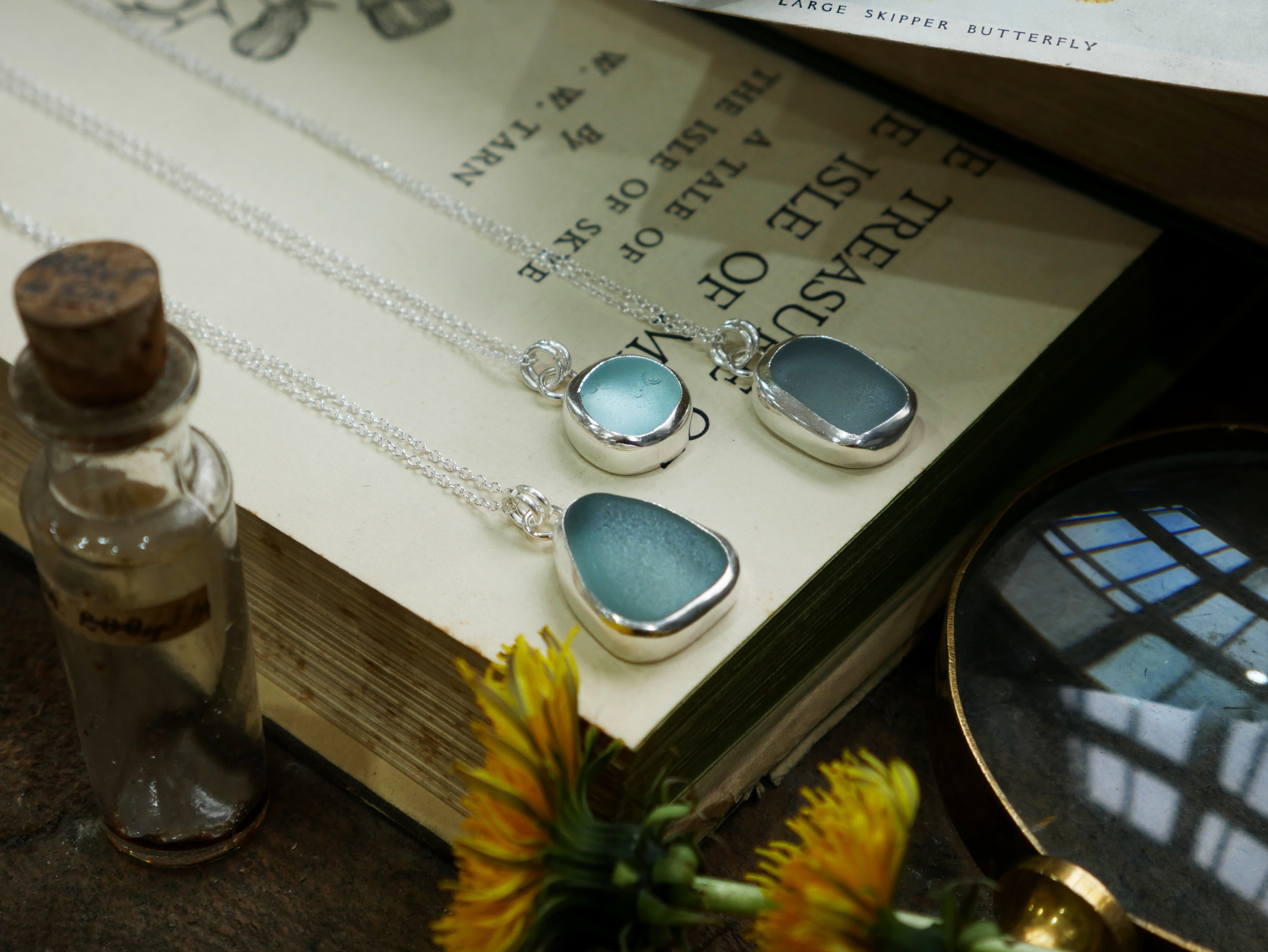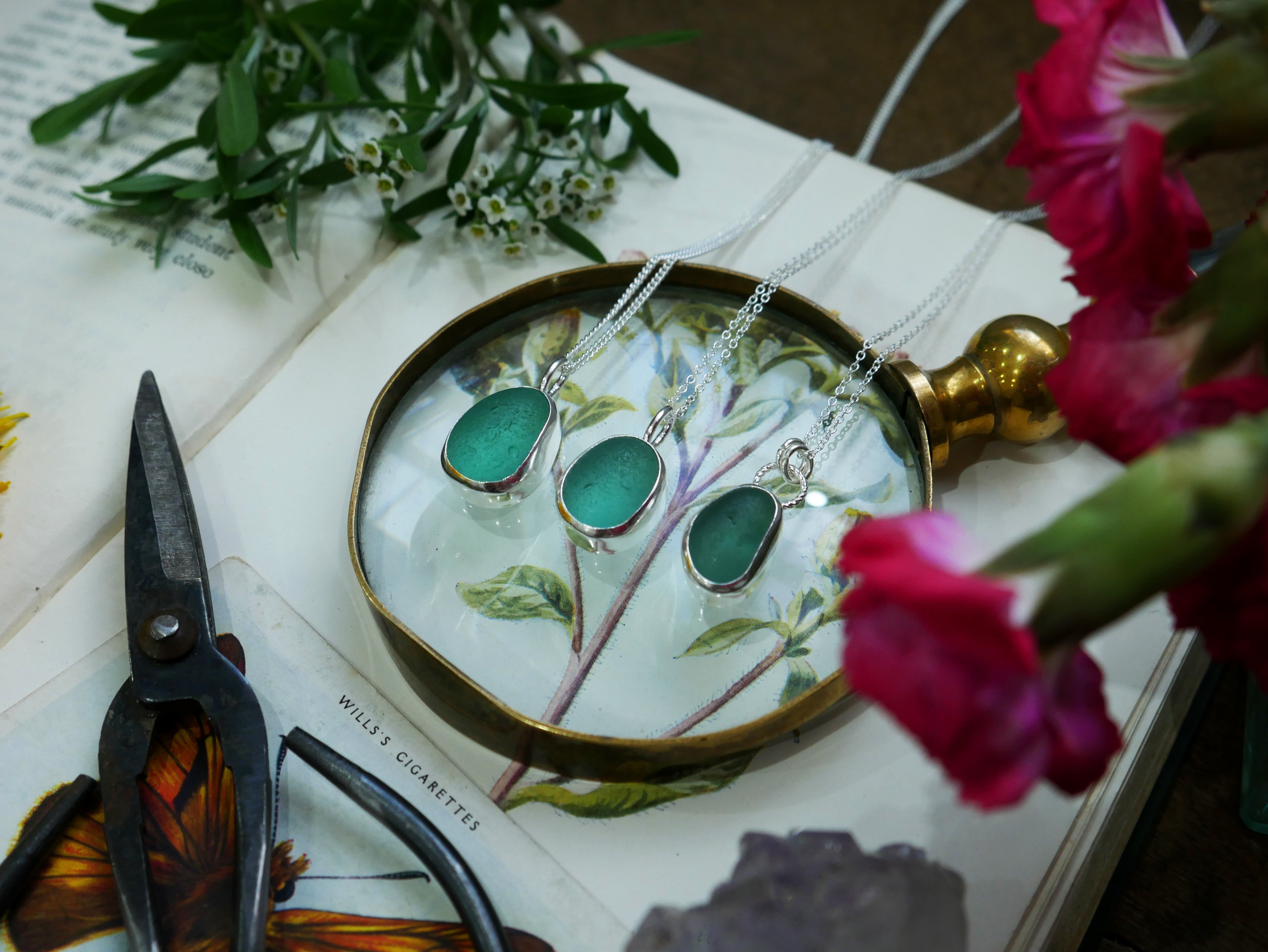 Each of our classic sea glass necklaces are completely unique and come in a wide variety of shapes and colours, all of which have been hand collected and found on shores all over Scotland by us. 100% hand crafted in beautiful, bright sterling silver in our Glasgow shop.