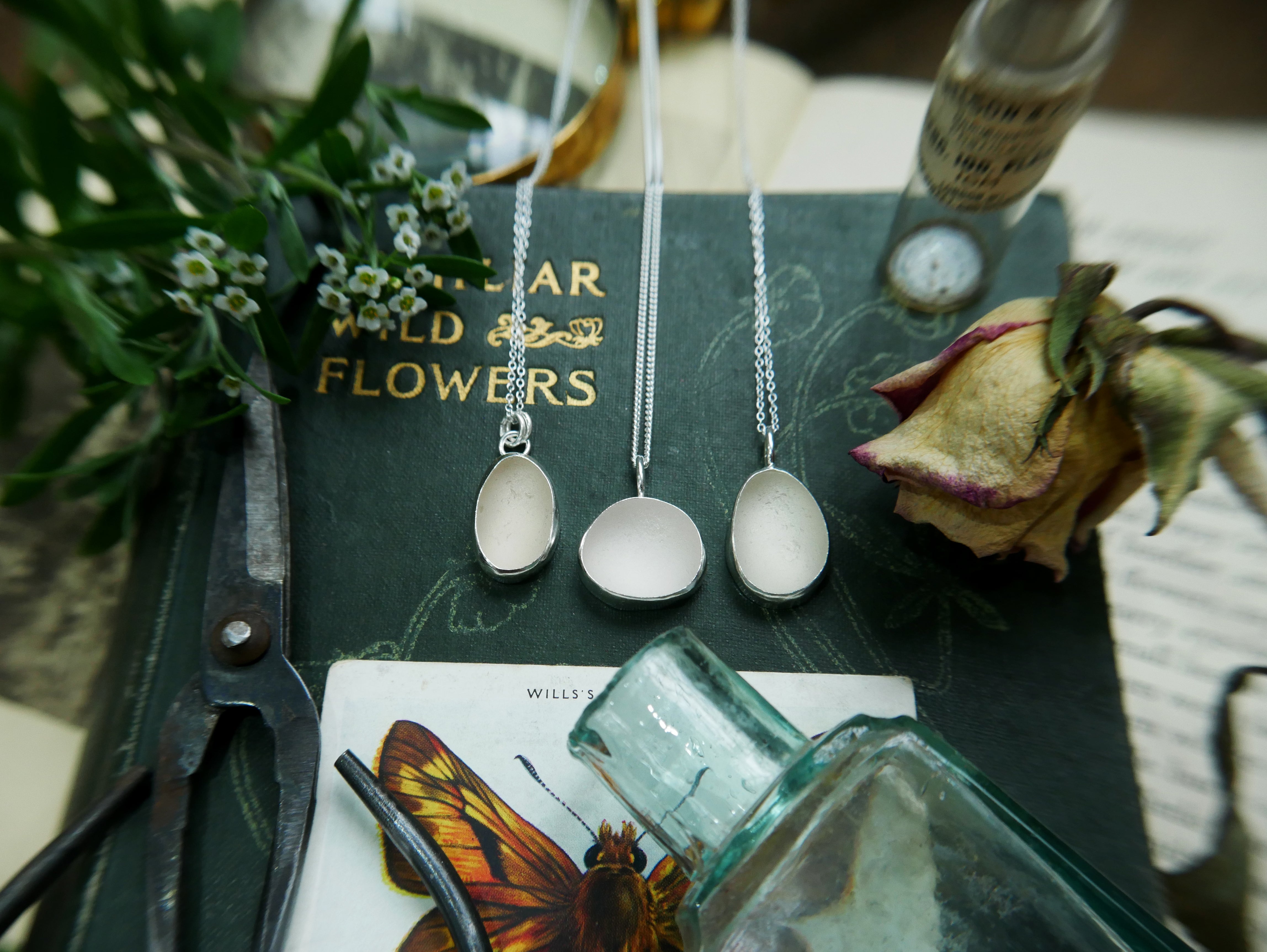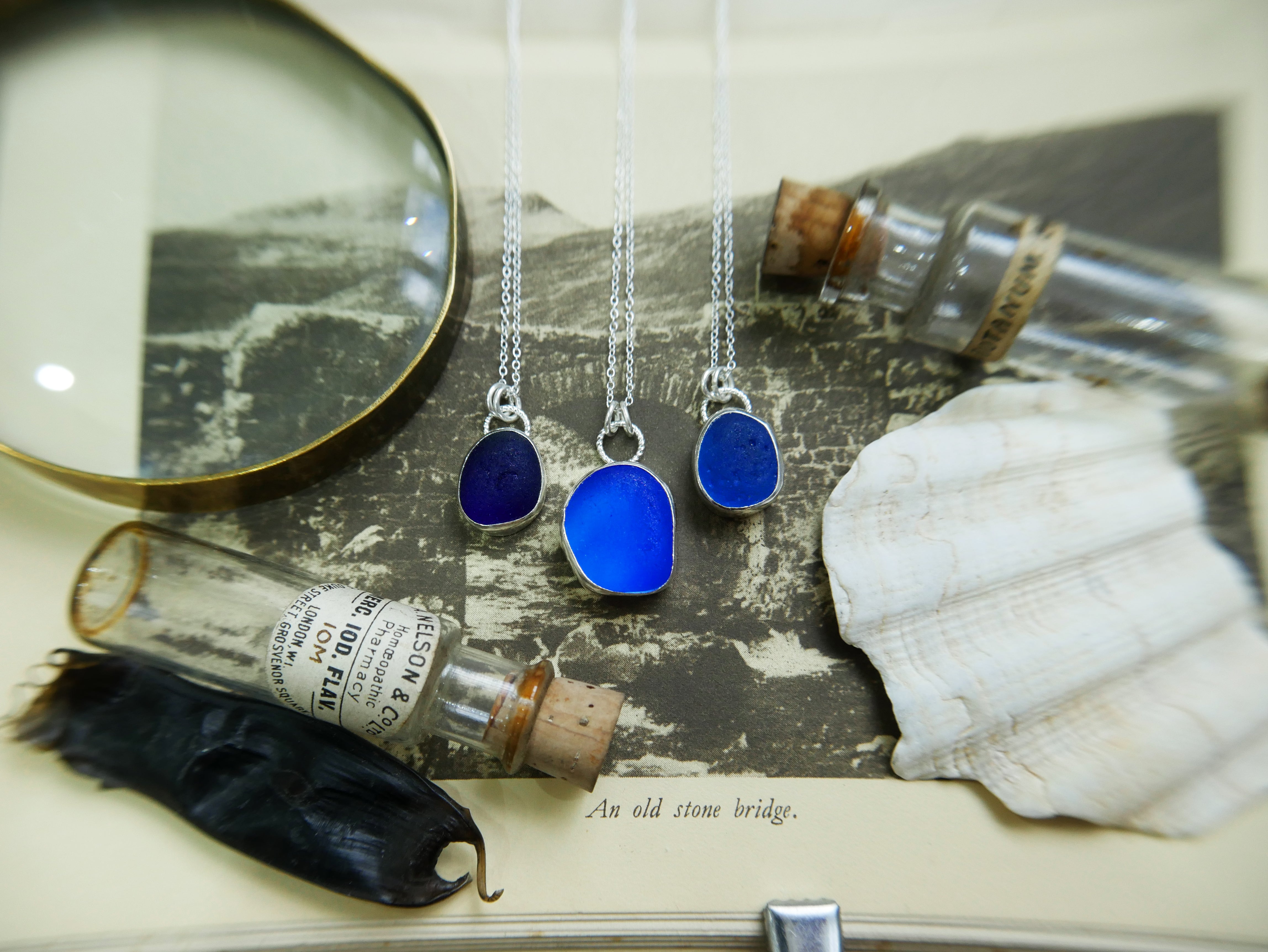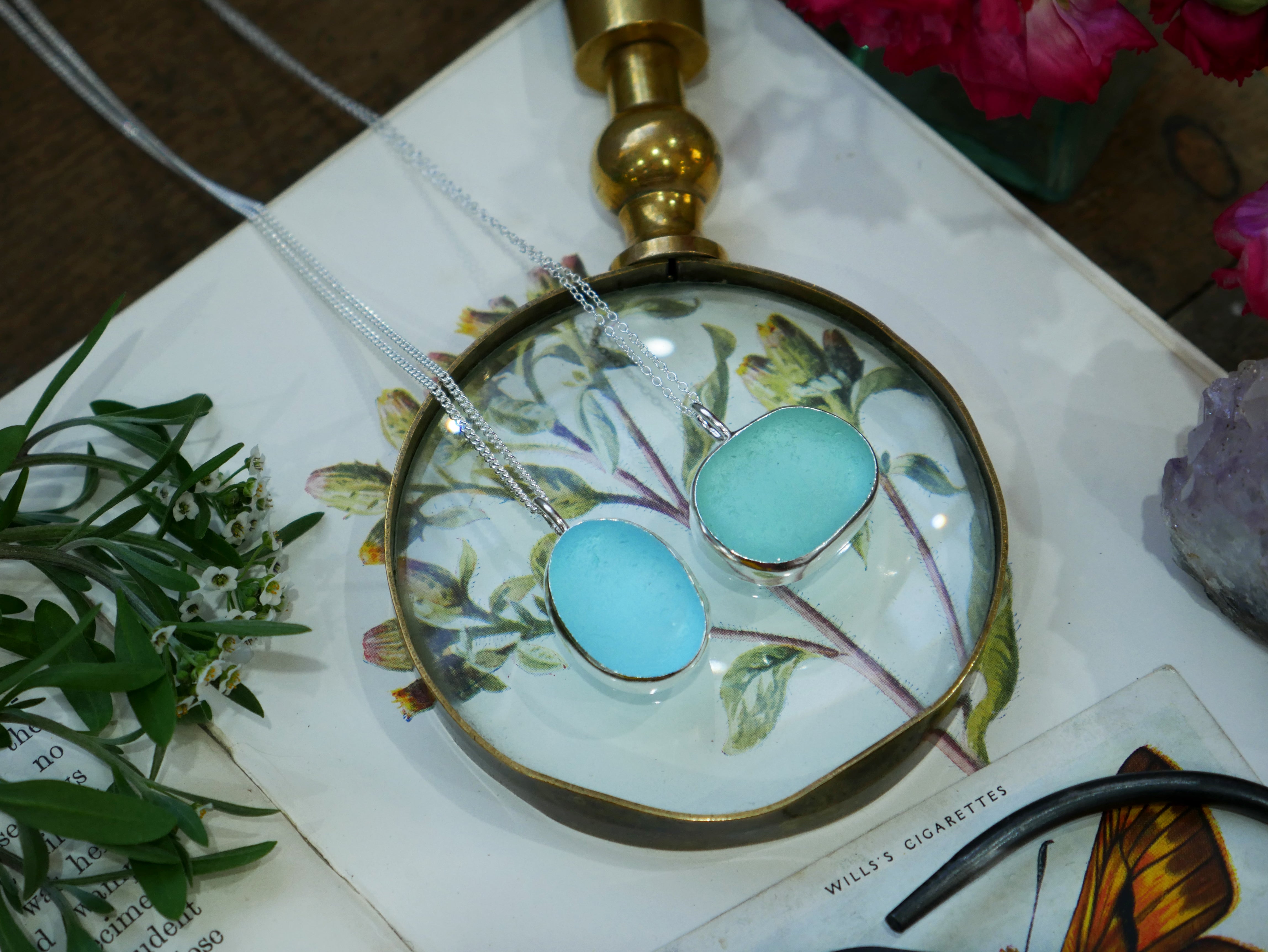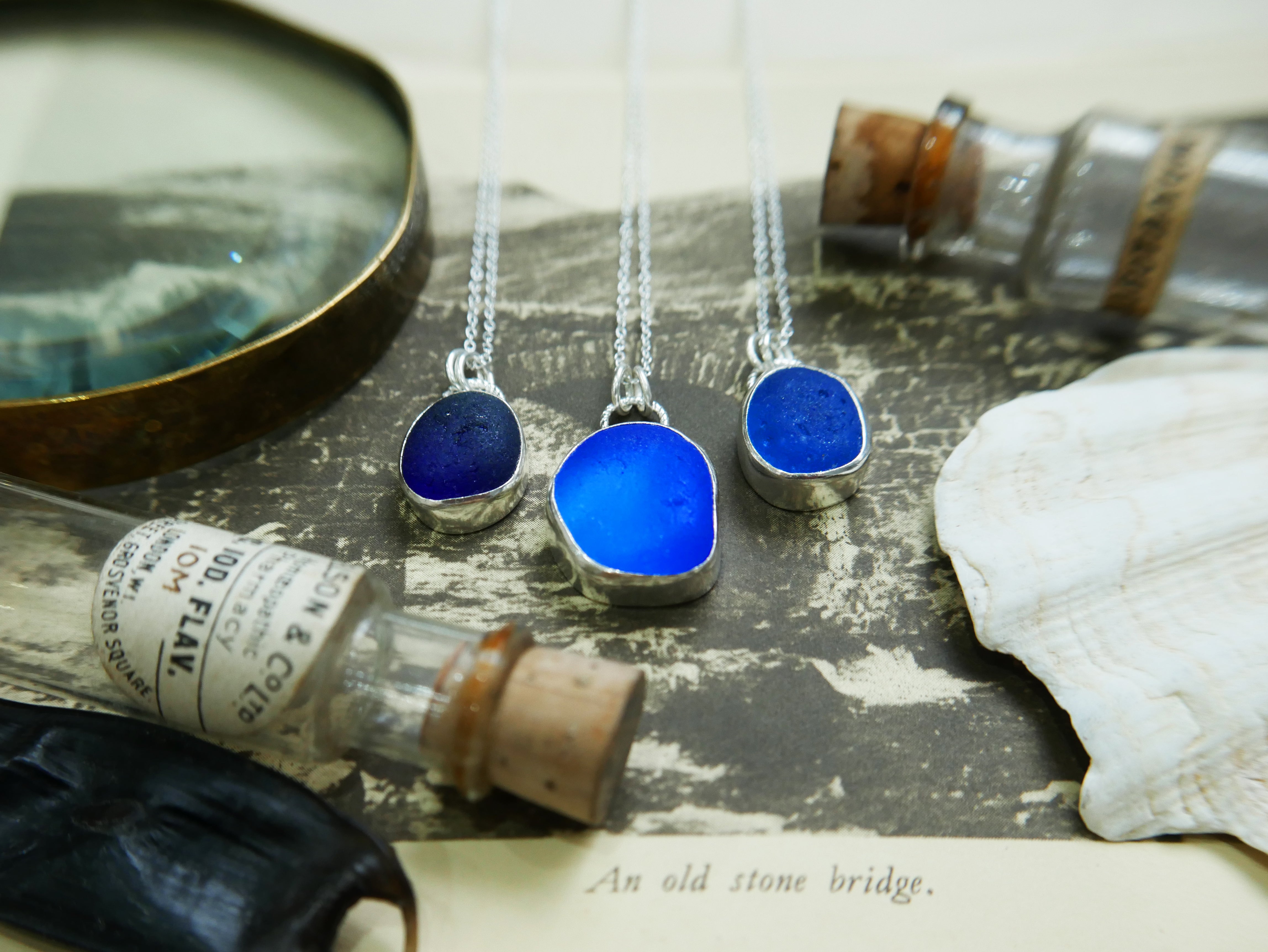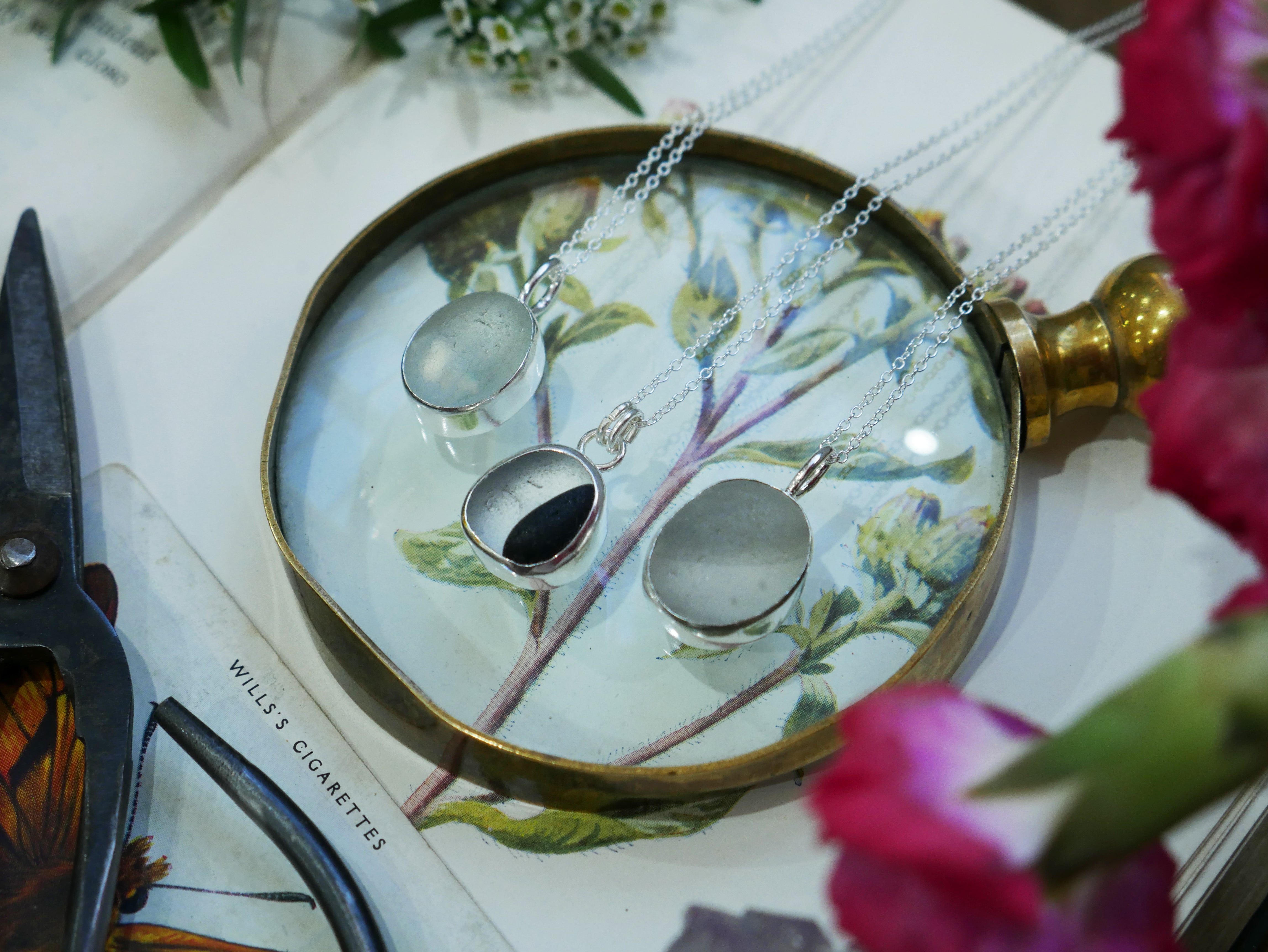 Each of our classic sea glass necklaces are completely unique and come in a wide variety of shapes and colours, all of which have been hand collected and found on shores all over Scotland by us. 100% hand crafted in beautiful, bright sterling silver in our Glasgow shop.