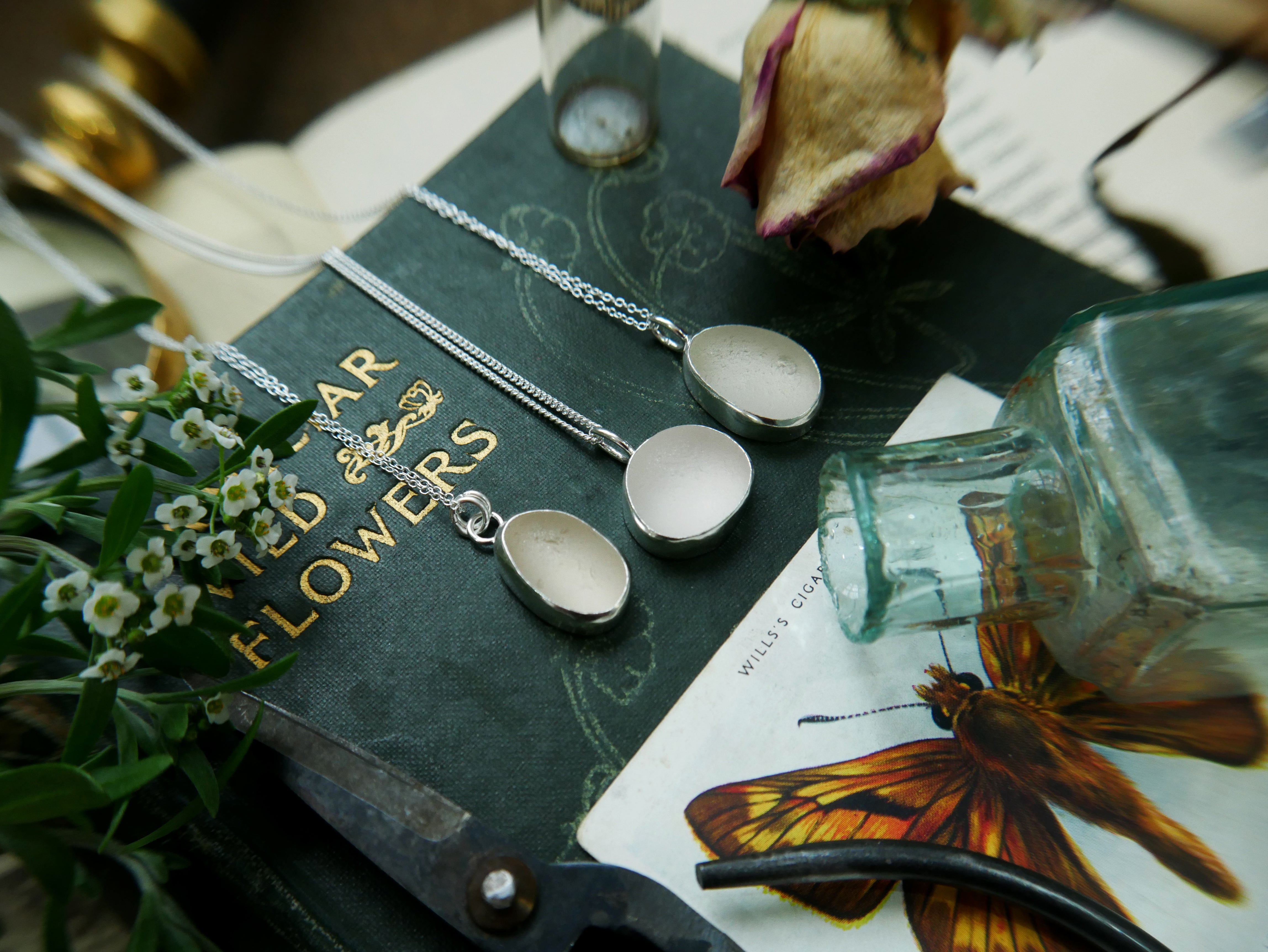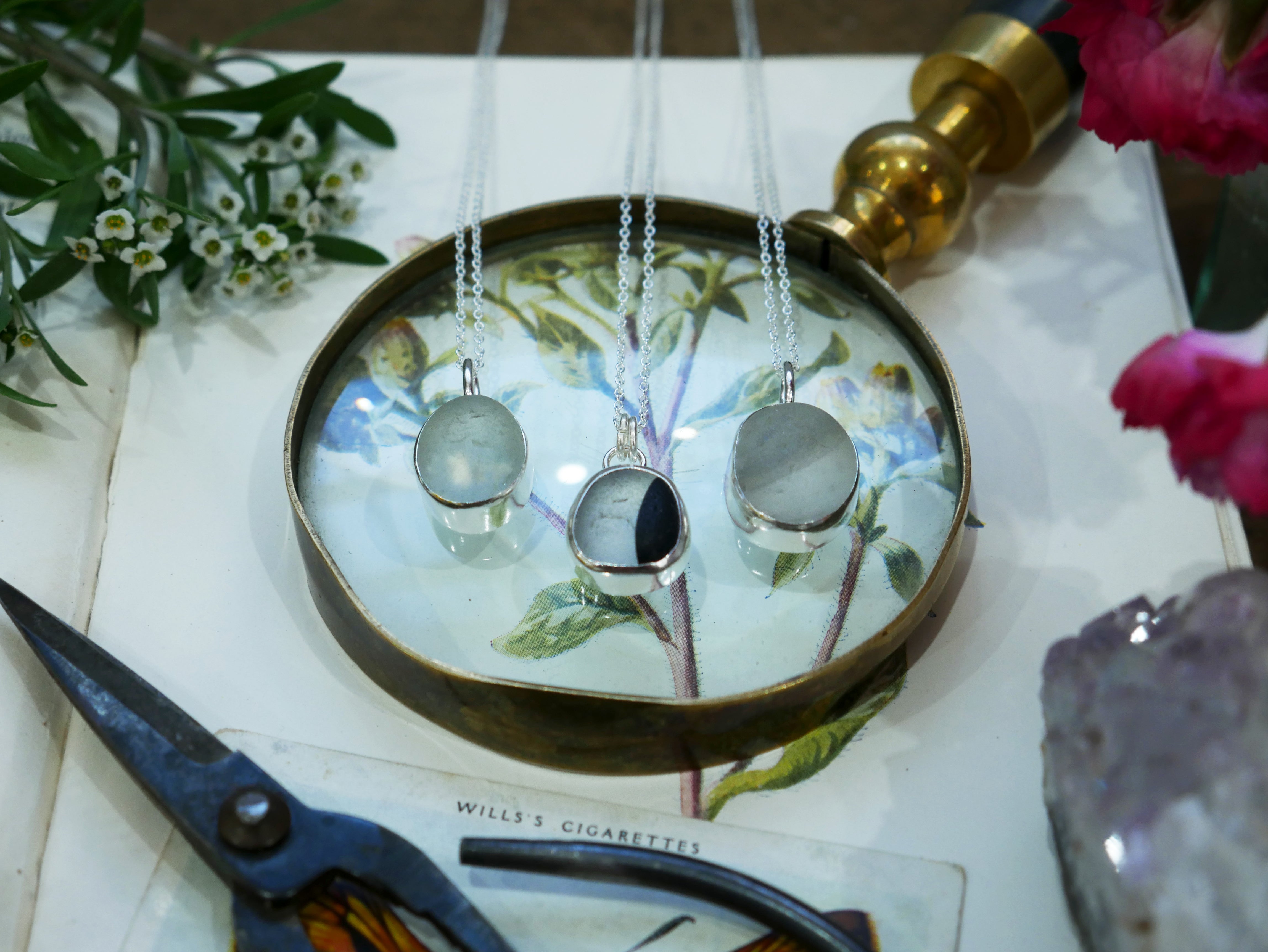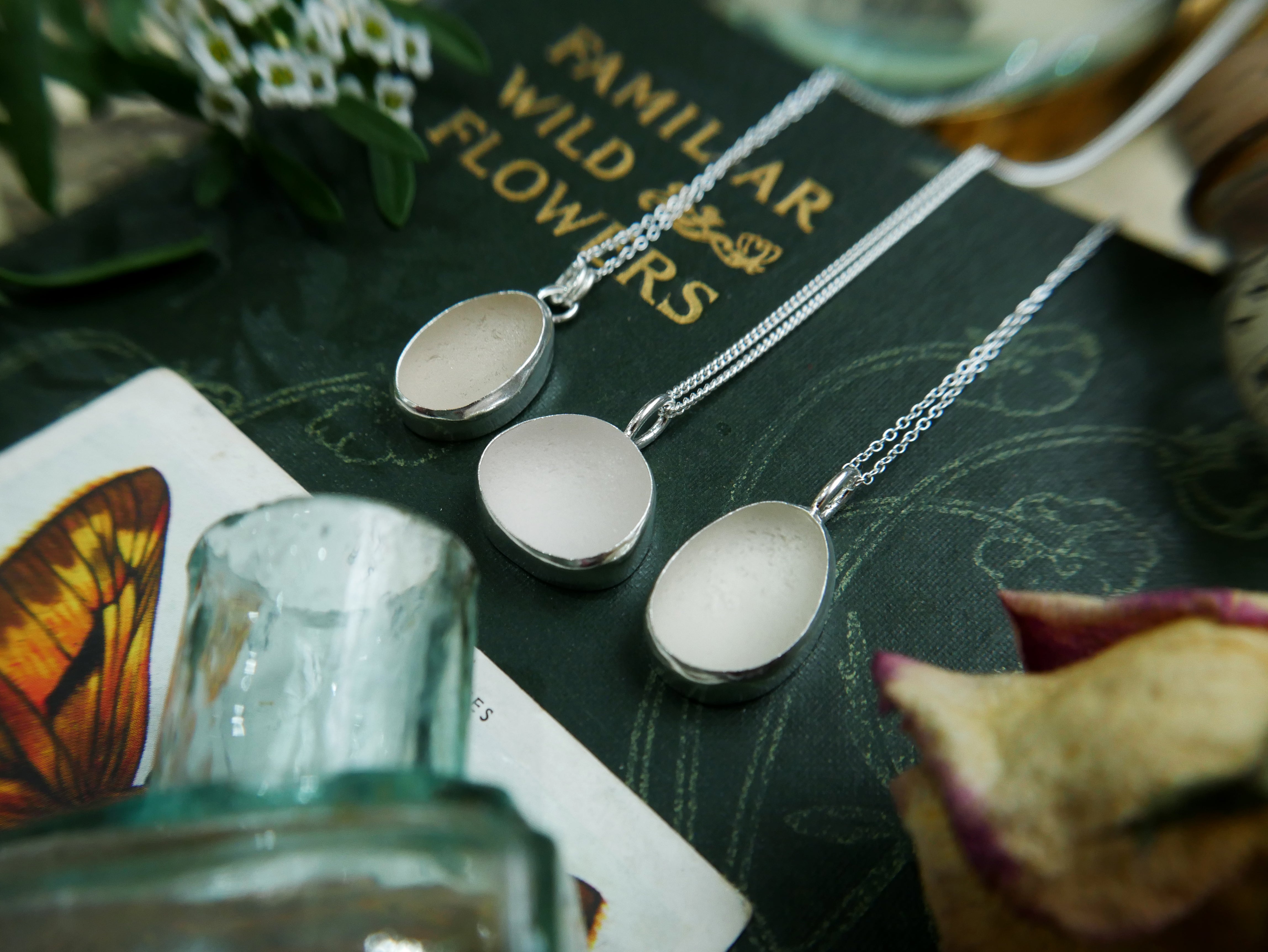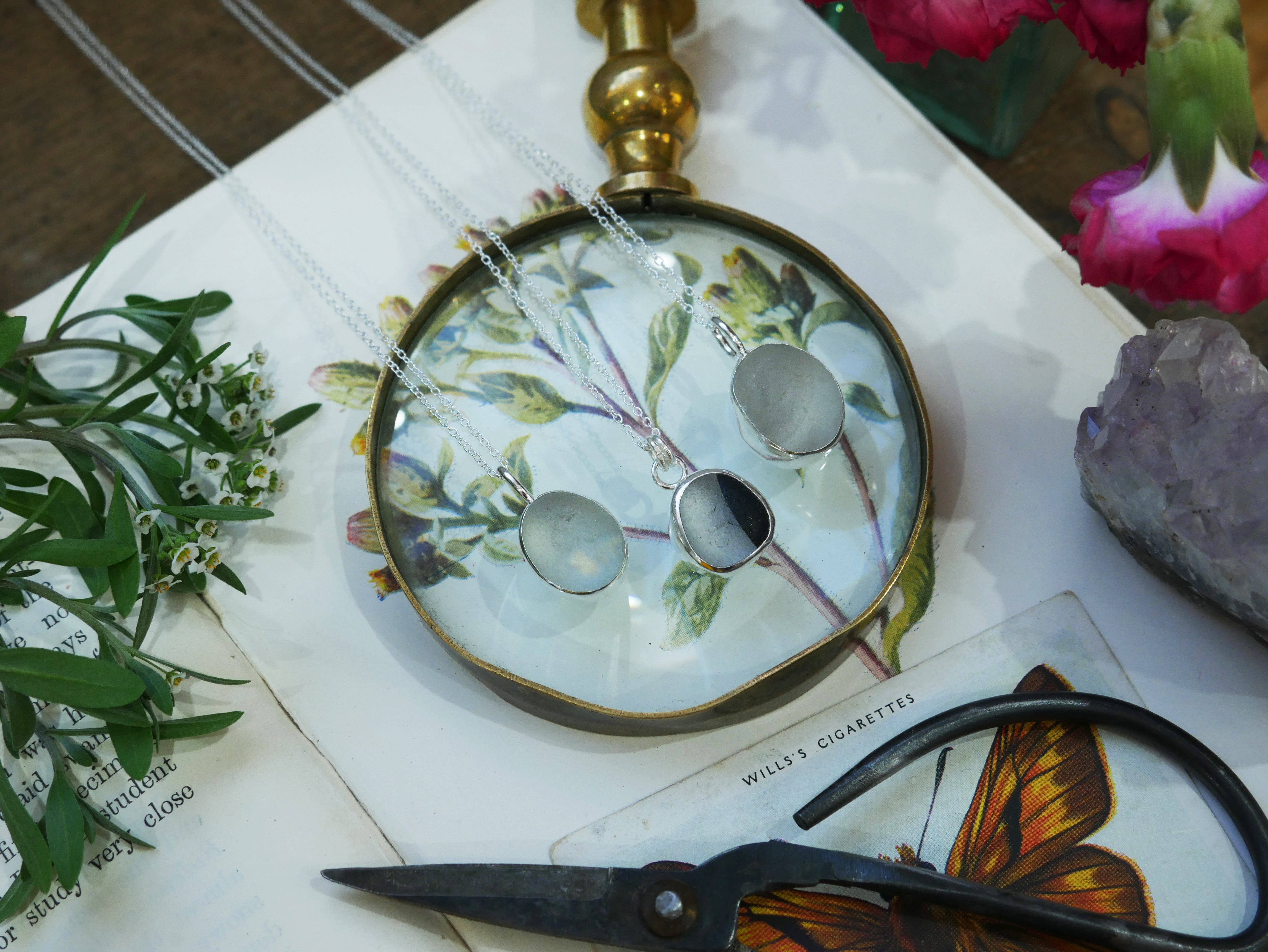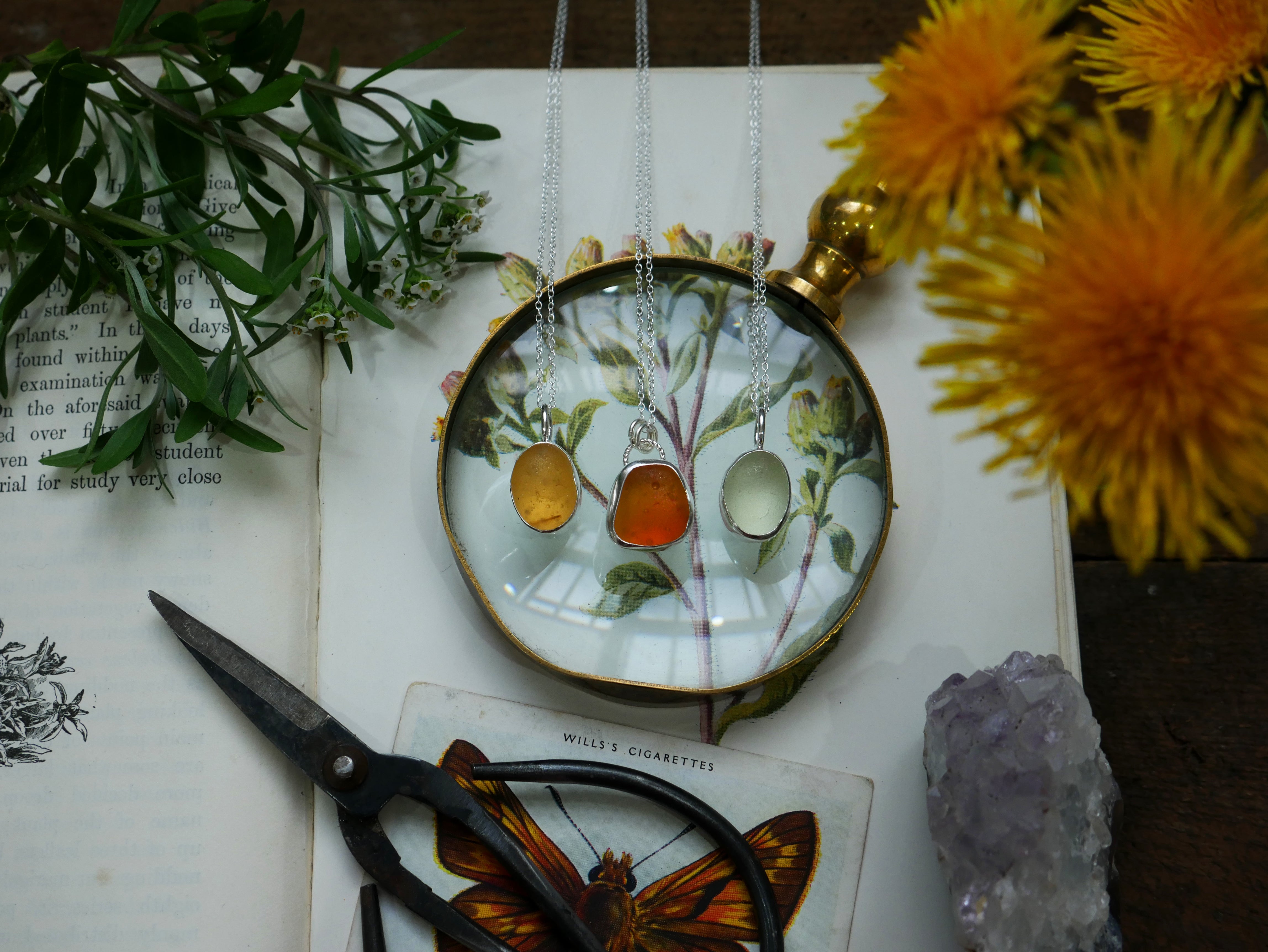 Each of our classic sea glass necklaces are completely unique and come in a wide variety of shapes and colours, all of which have been hand collected and found on shores all over Scotland by us. 100% hand crafted in beautiful, bright sterling silver in our Glasgow shop.