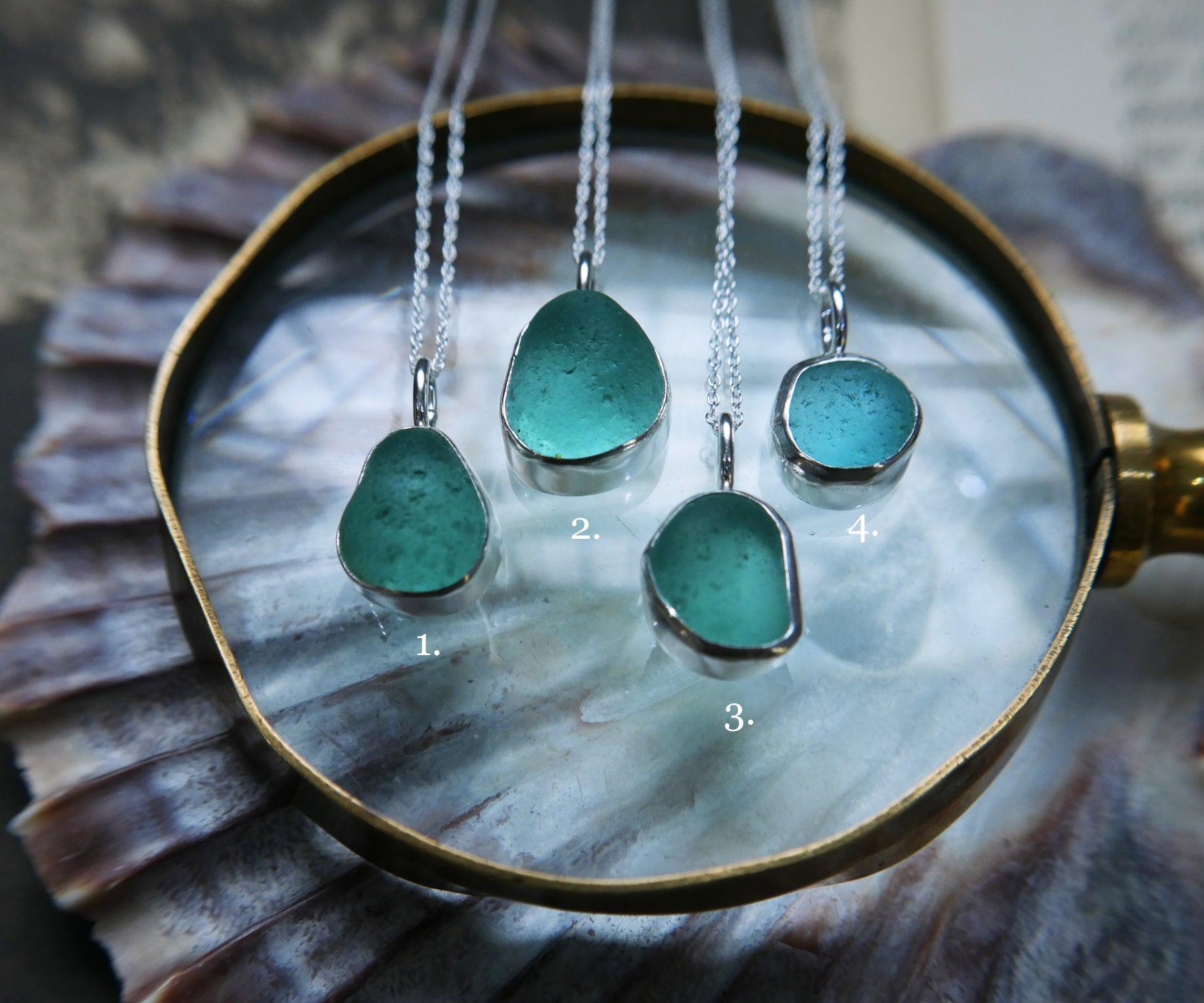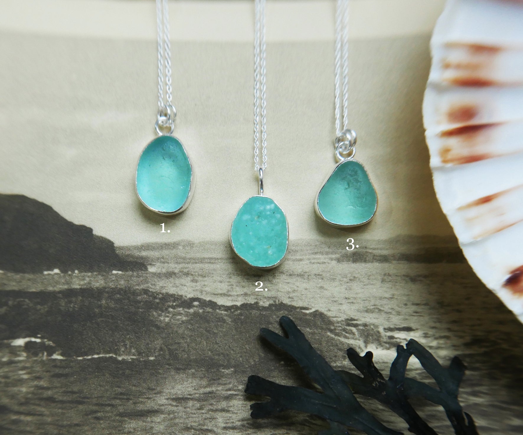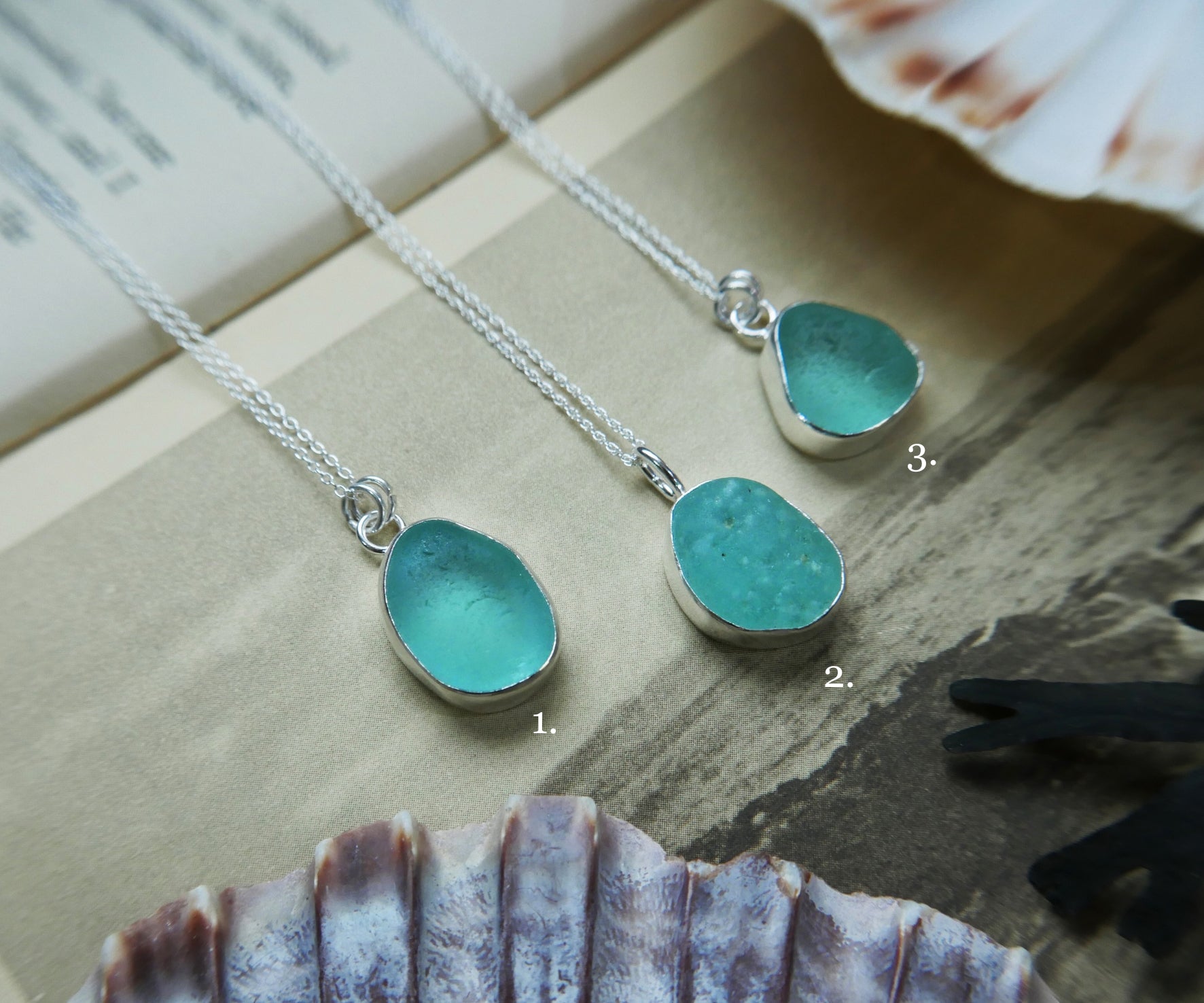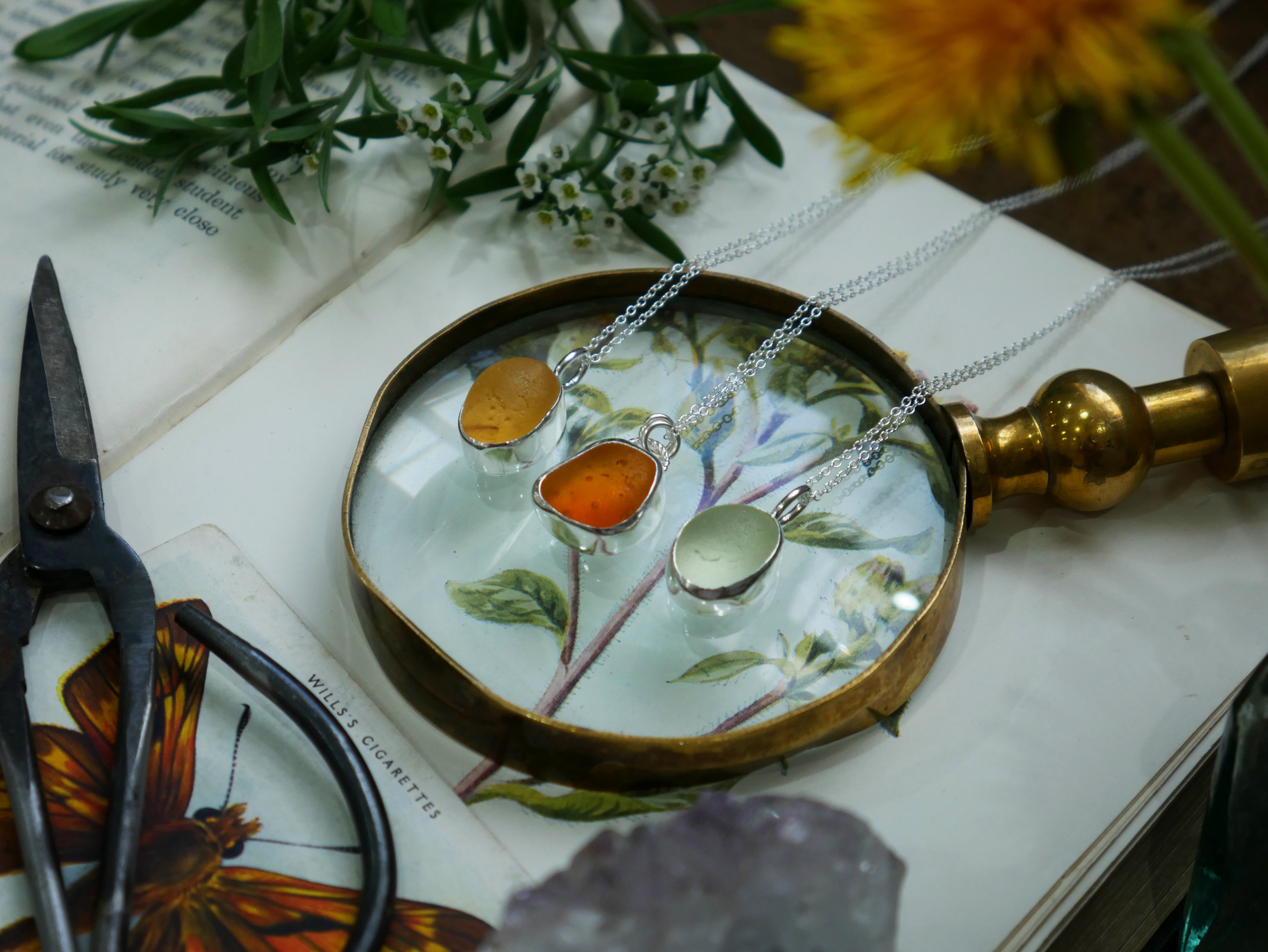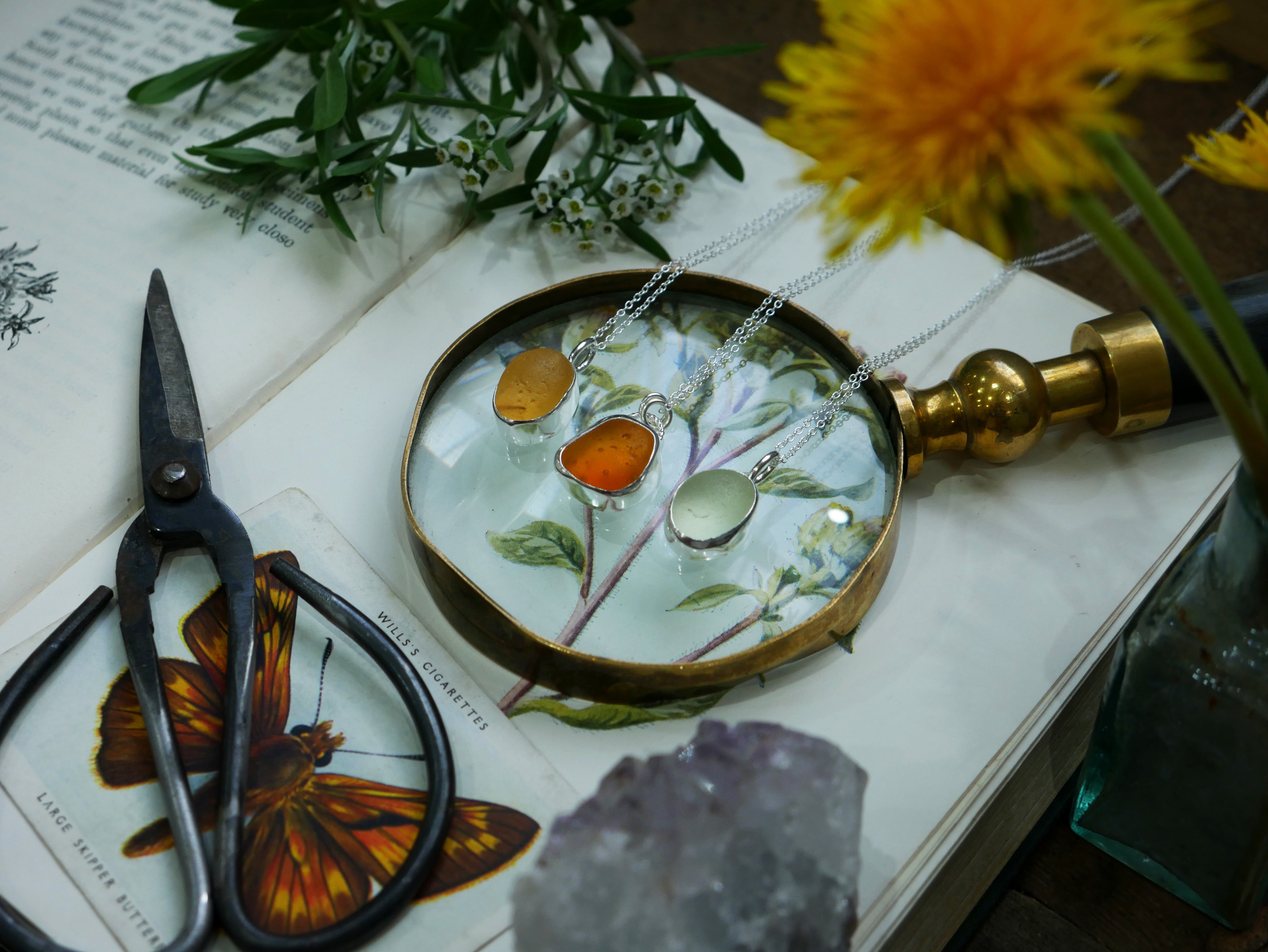 Each of our classic sea glass necklaces are completely unique and come in a wide variety of shapes and colours, all of which have been hand collected and found on shores all over Scotland by us. 100% hand crafted in beautiful, bright sterling silver in our Glasgow shop.