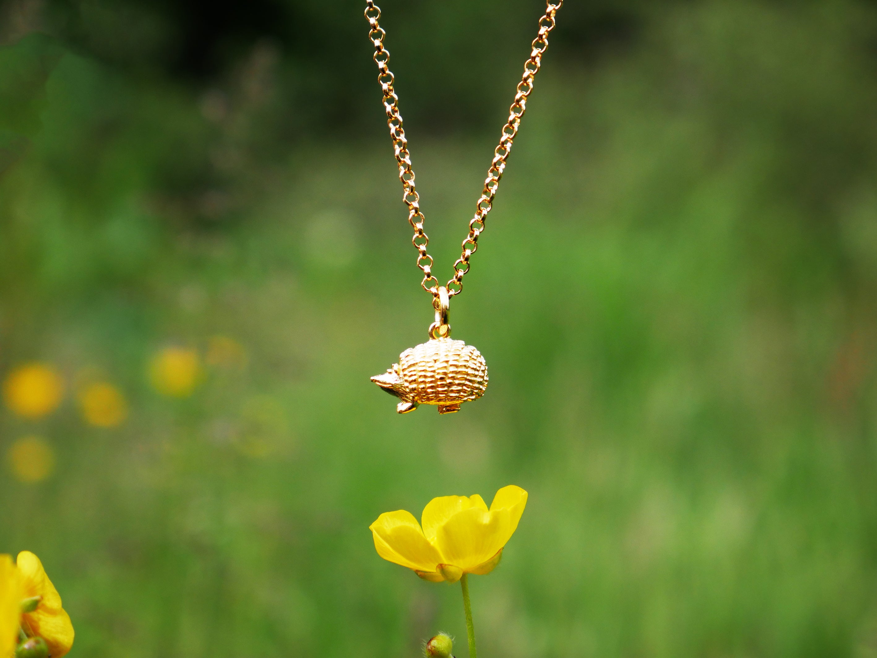 The little hedgehog is cast in solid silver and is not hollow, it is a 3D replica of a sweet, snuffling little hedgehog which was then plated in a generous layer of gold.