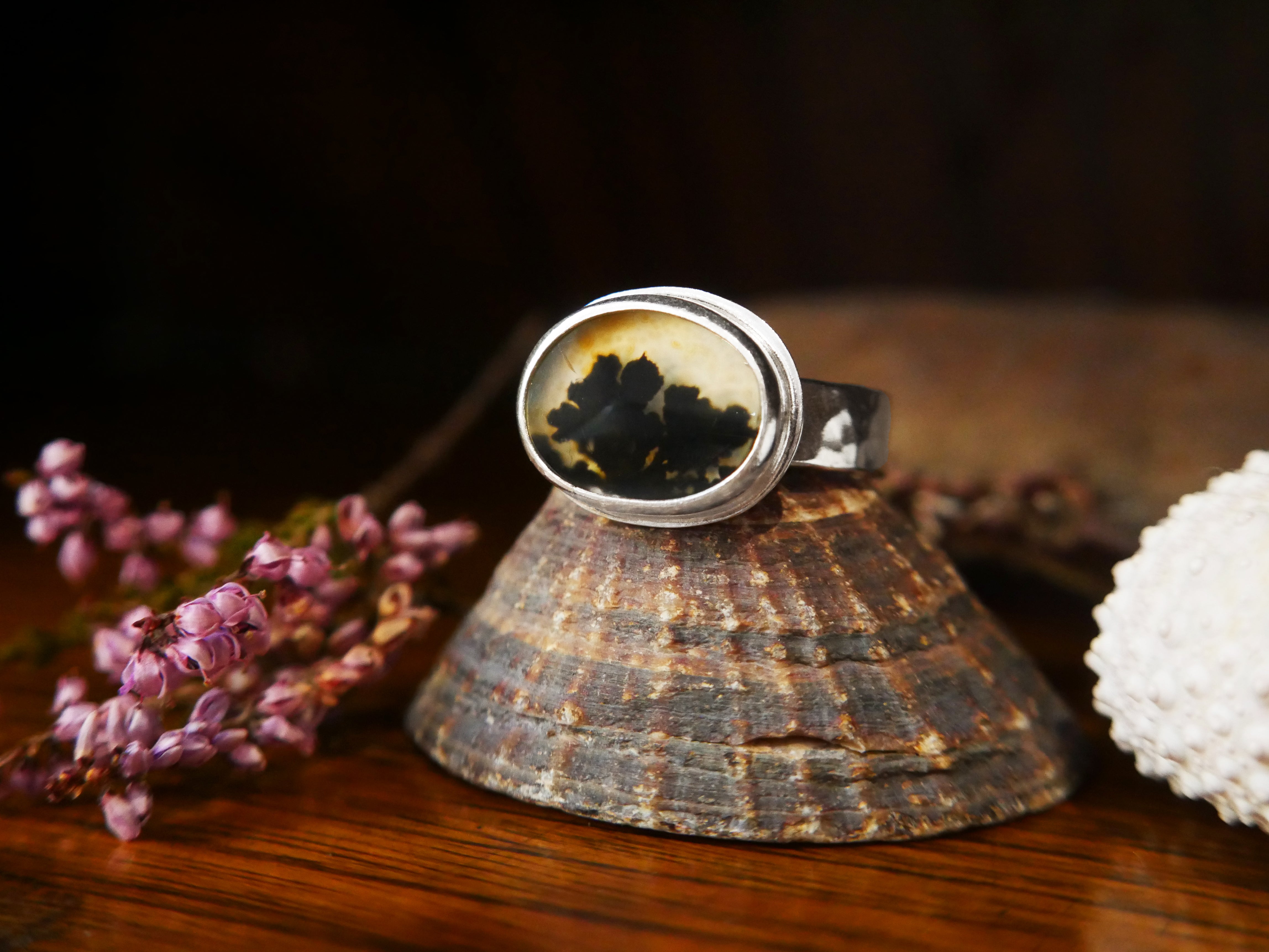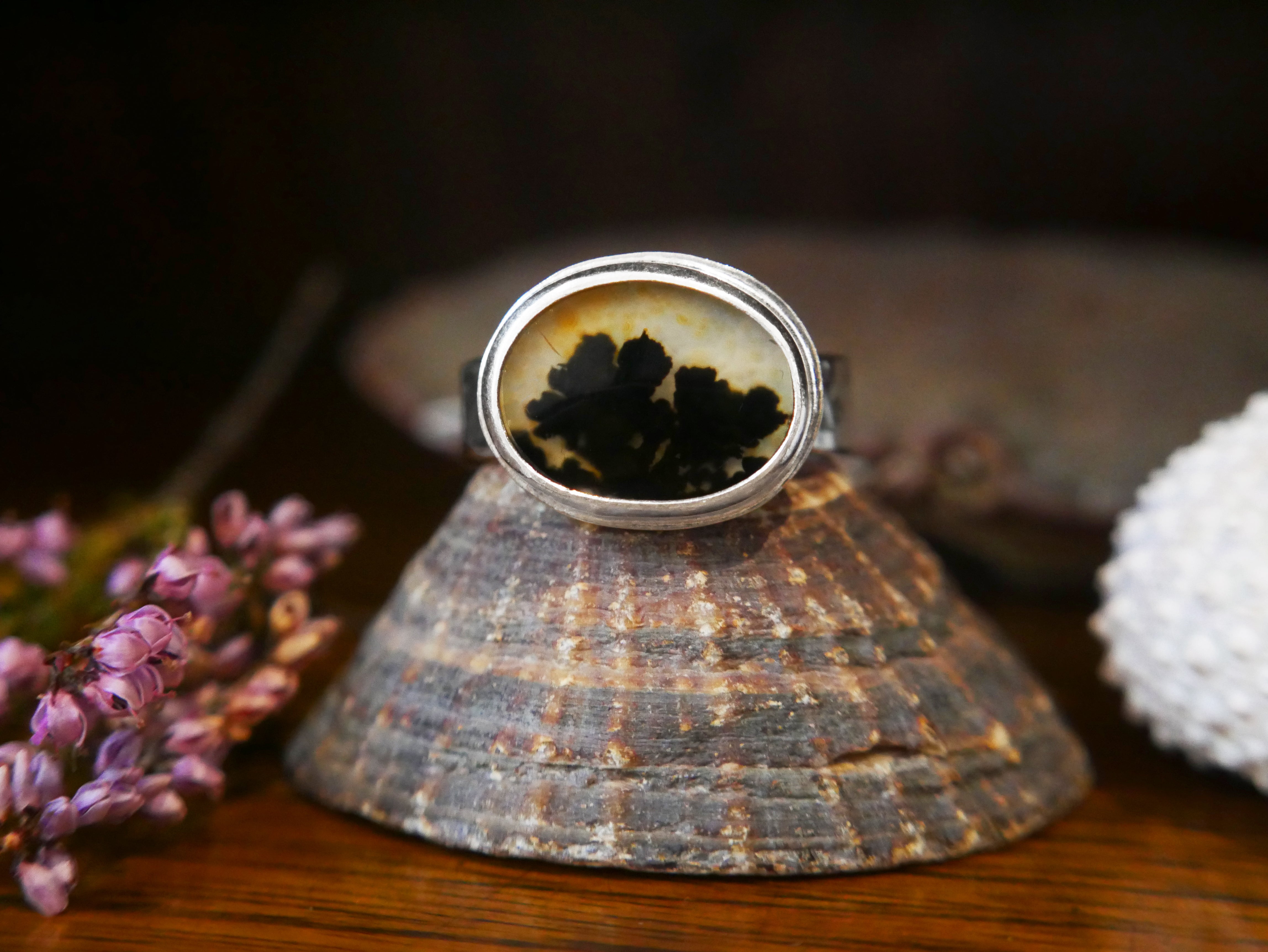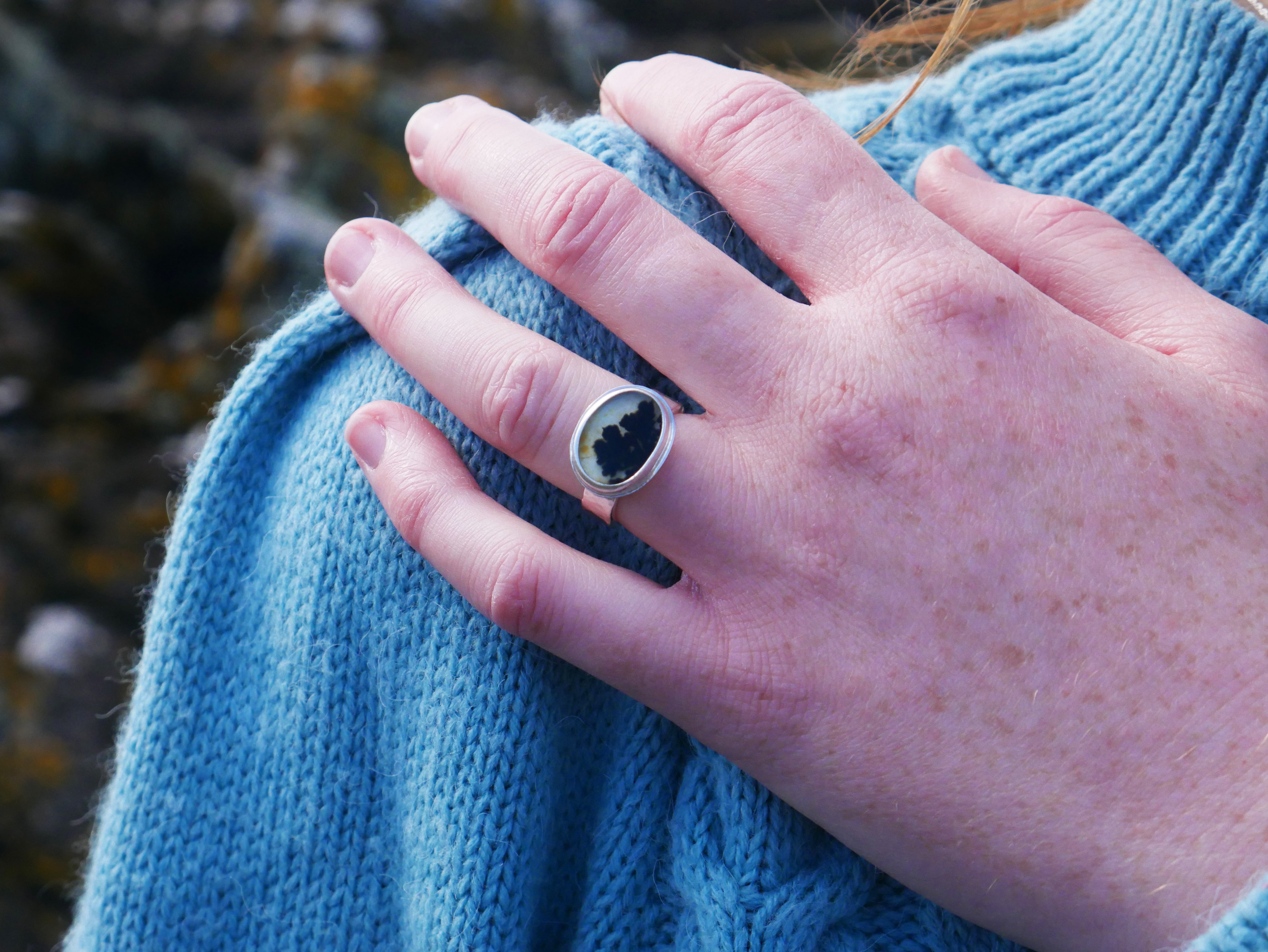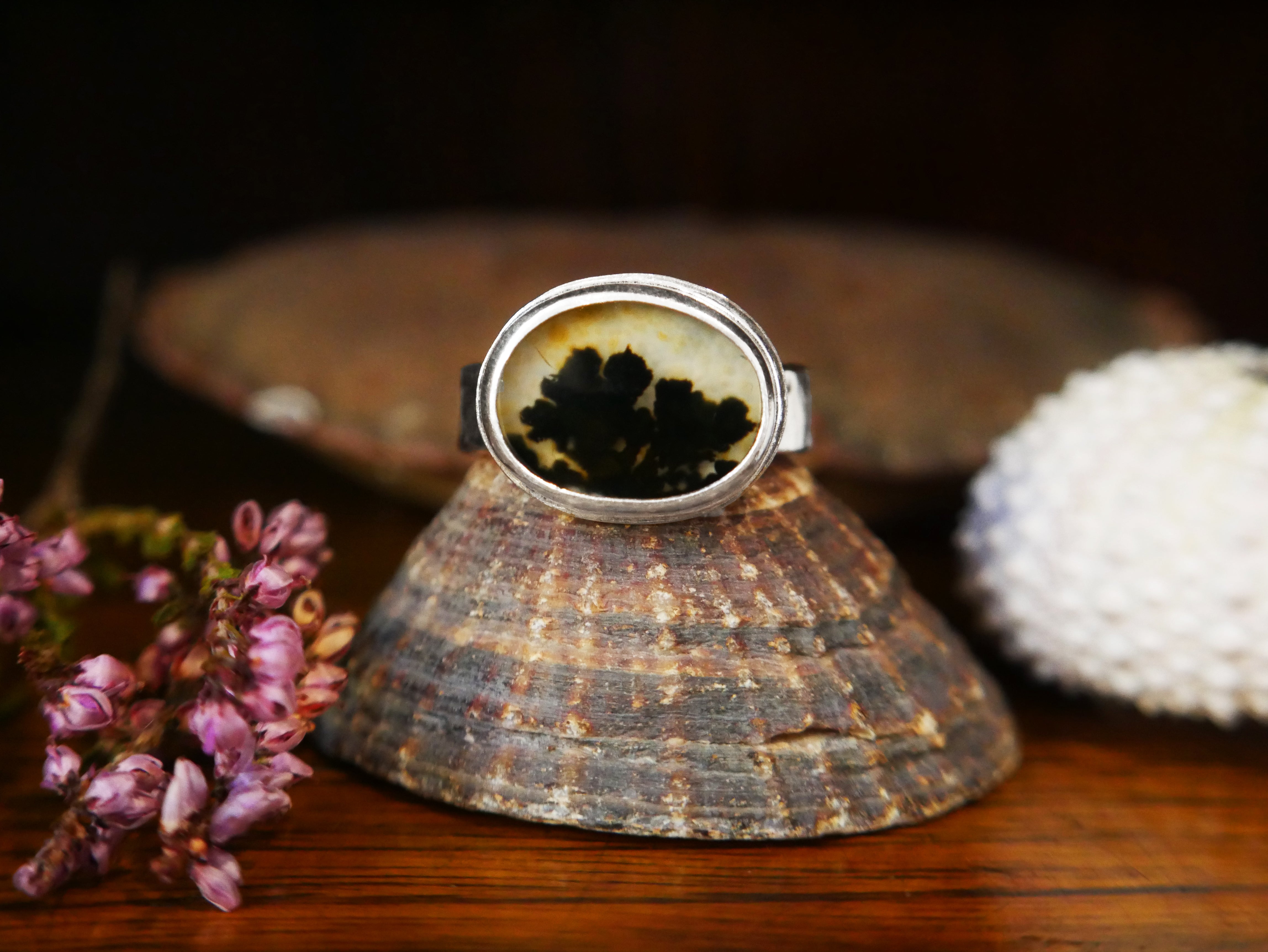 Set in this ring is a dendritic agate, a rare, one of a kind gemstone with a natural pattern resembling that of enchanting Scottish seaweed. This gemstone was cut by a Glasgow based lapidary expert and chosen, set and designed by us.