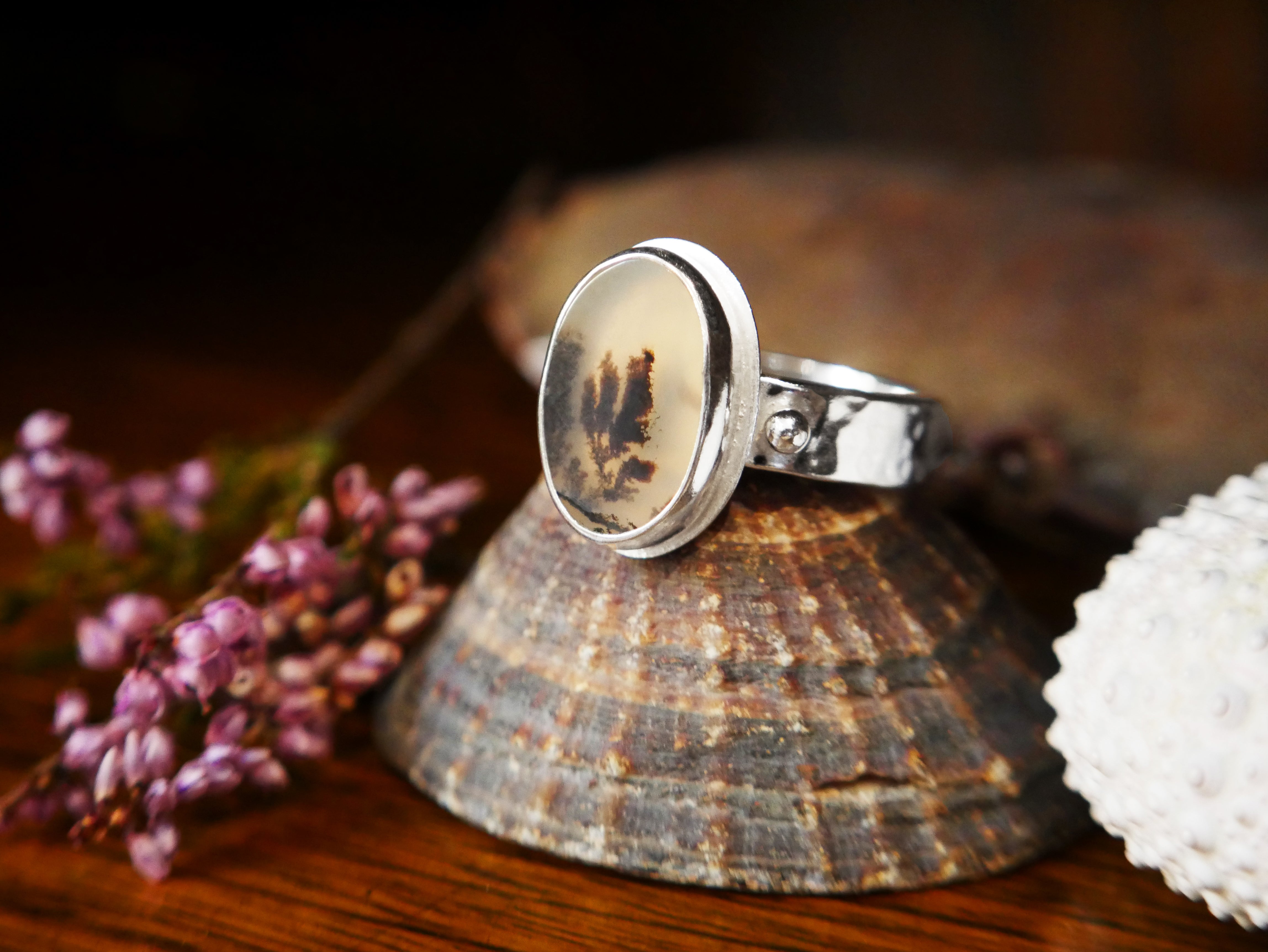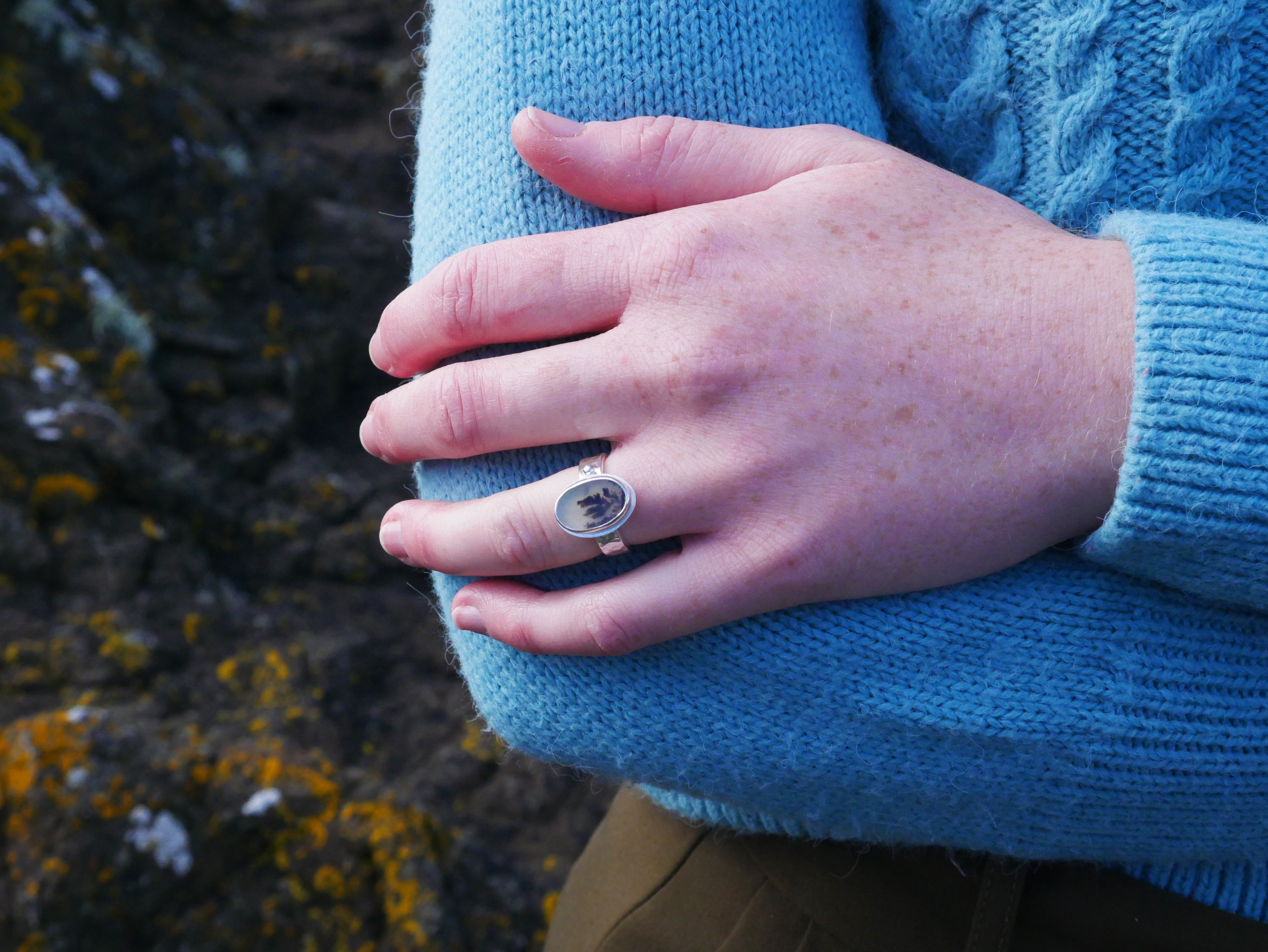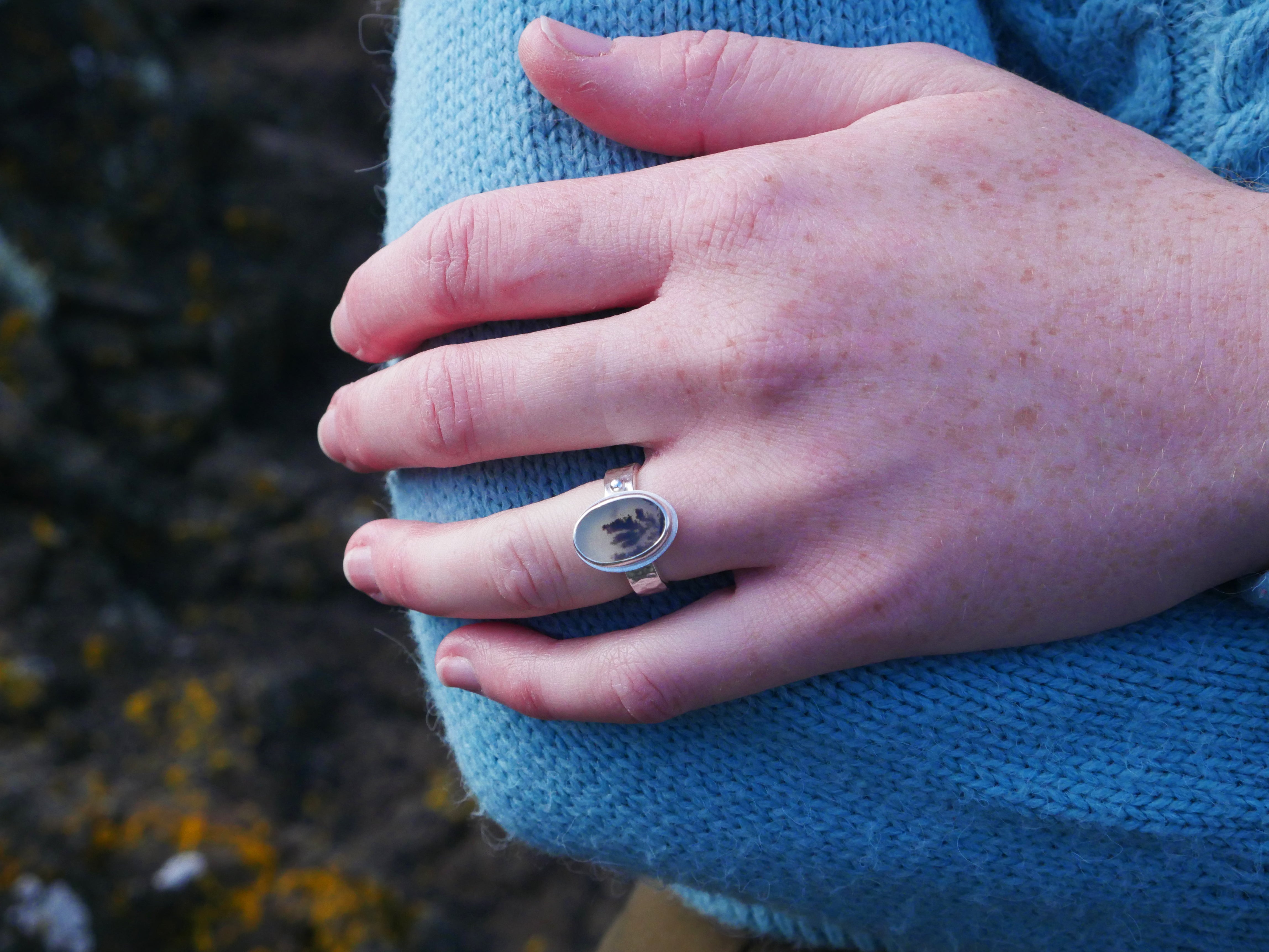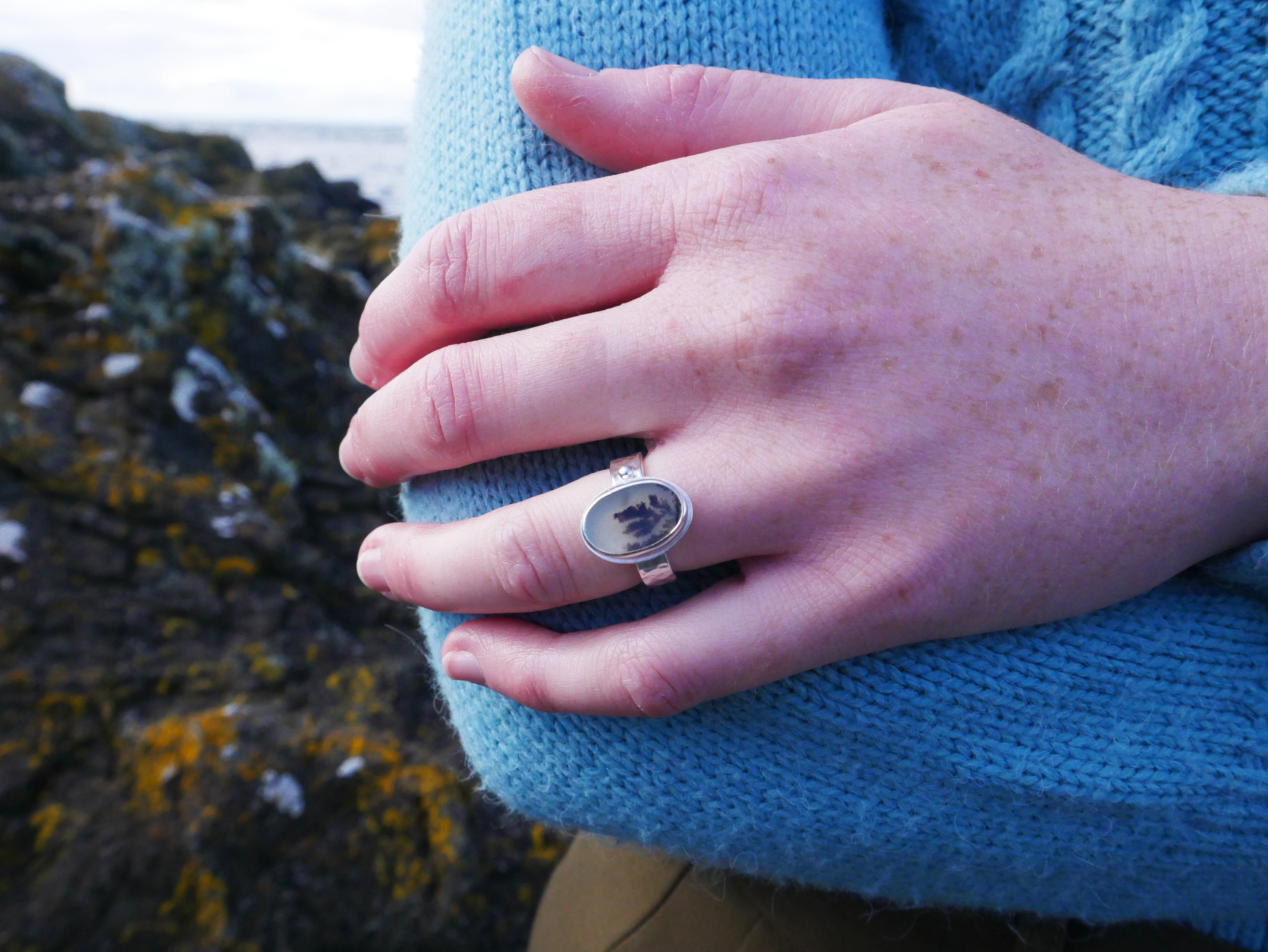 Set in this ring is a dendritic agate, a rare, one of a kind gemstone with a natural pattern resembling that of enchanting Scottish seaweed. This gemstone was cut by a Glasgow based lapidary expert and chosen, set and designed by us.