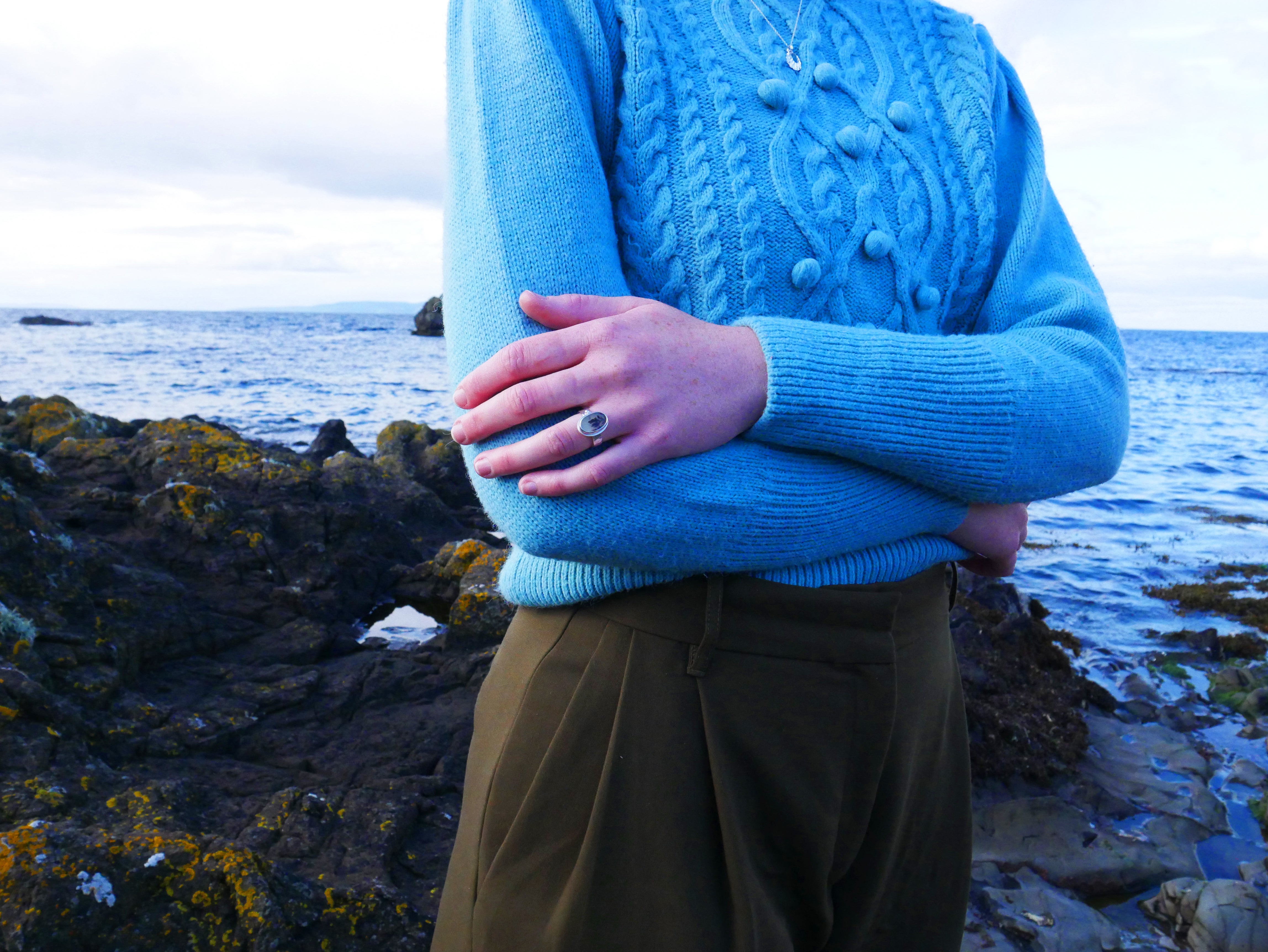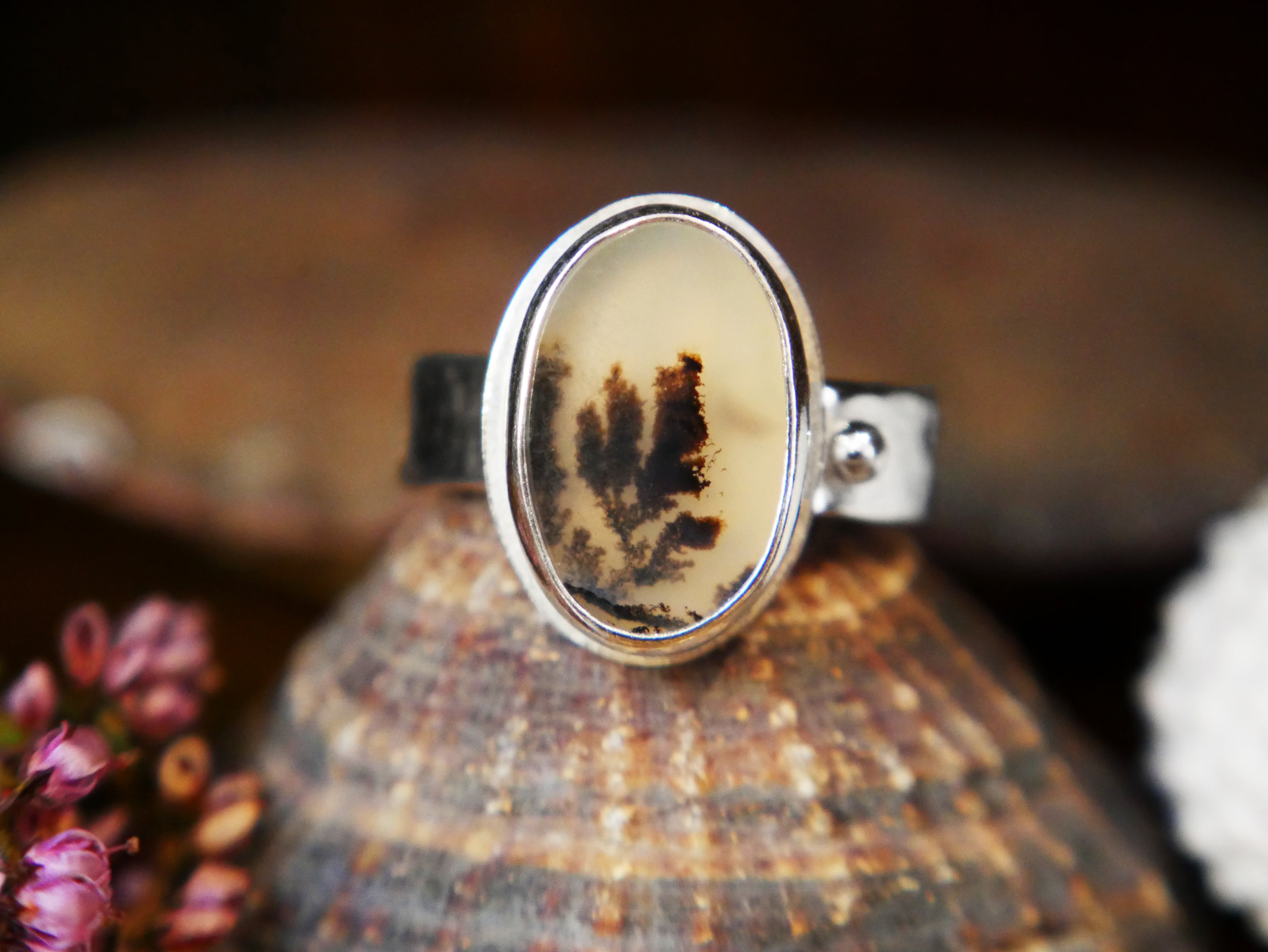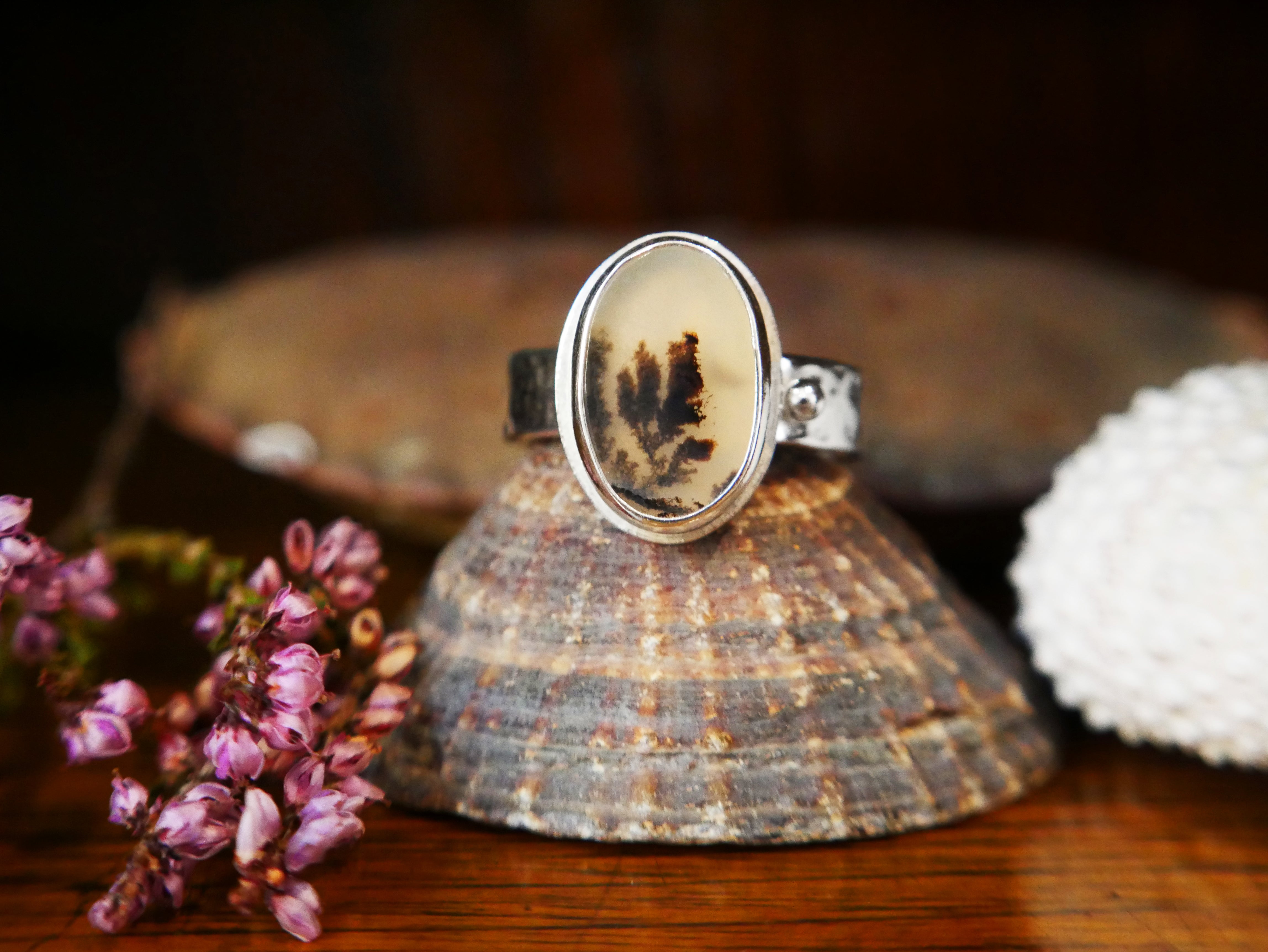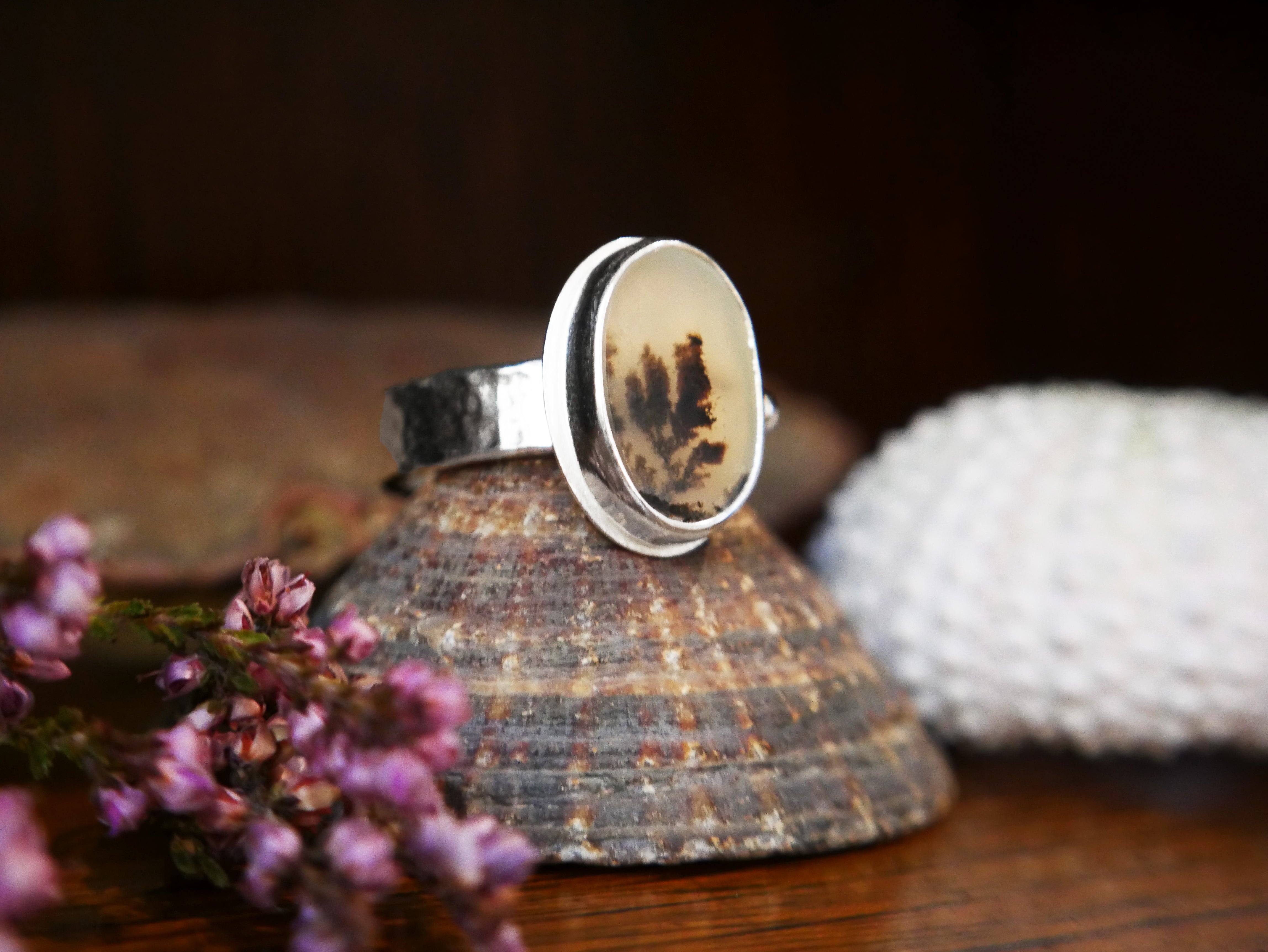 Set in this ring is a dendritic agate, a rare, one of a kind gemstone with a natural pattern resembling that of enchanting Scottish seaweed. This gemstone was cut by a Glasgow based lapidary expert and chosen, set and designed by us.