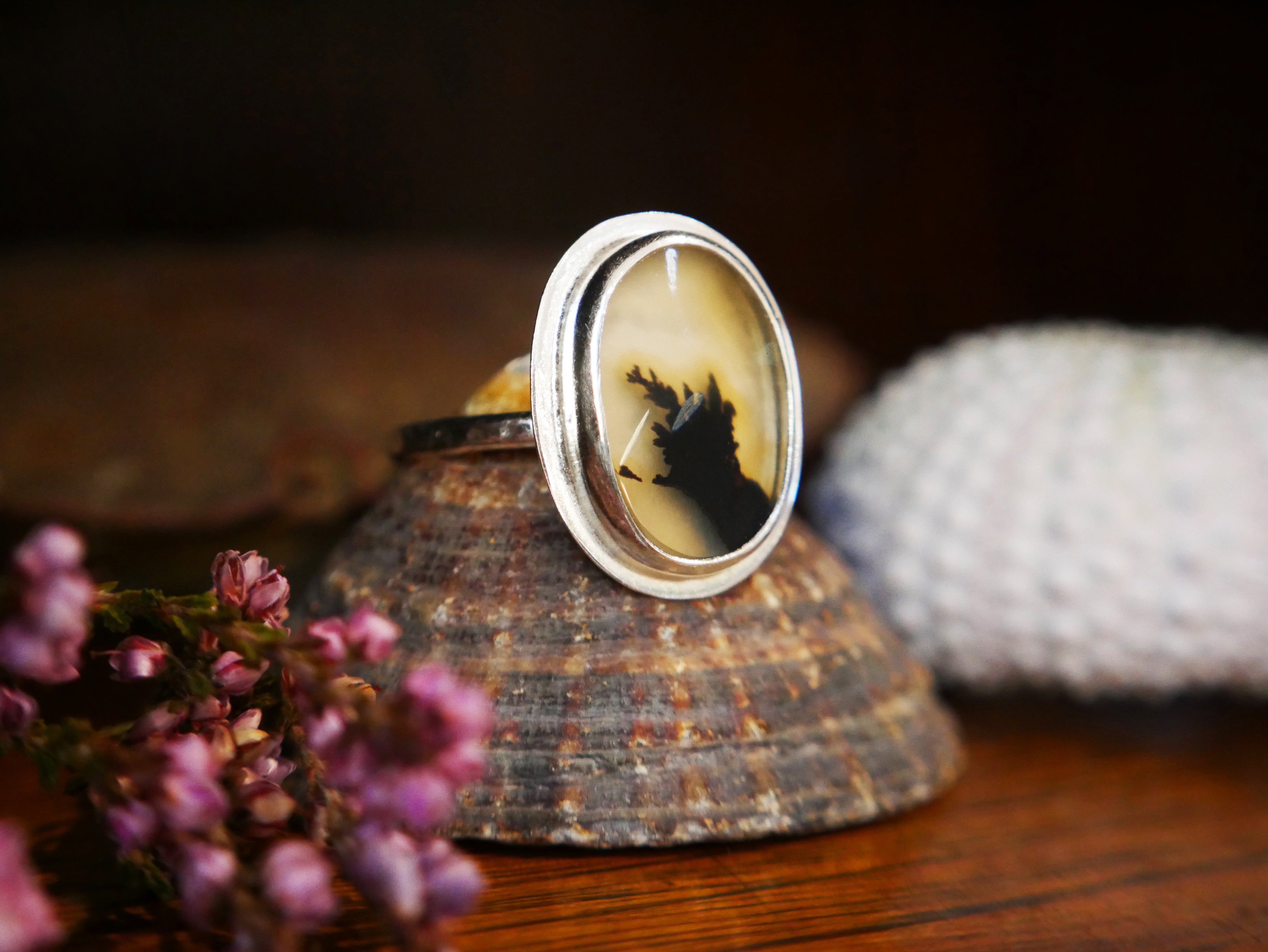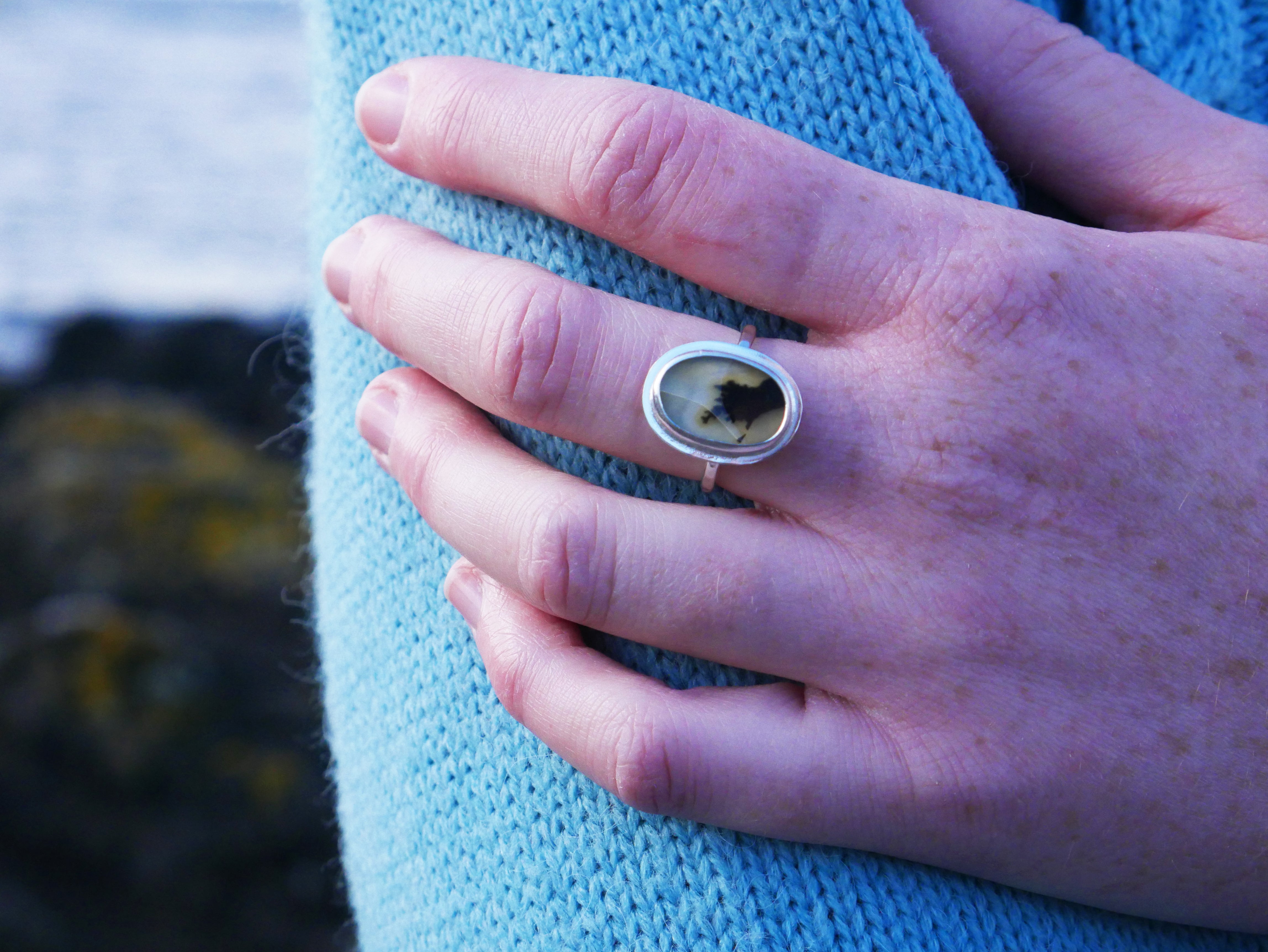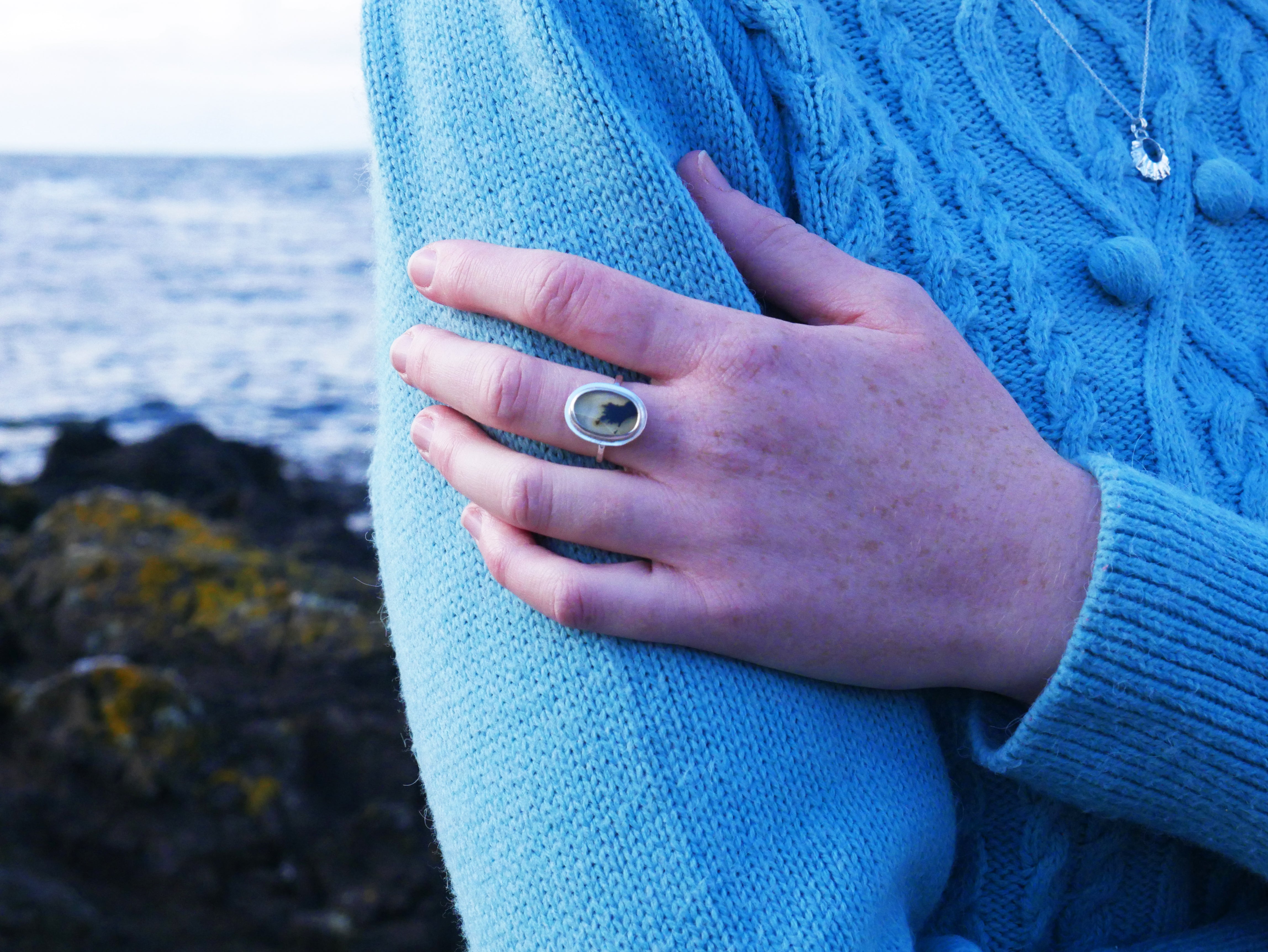 Set in this ring is a dendritic agate, a rare, one of a kind gemstone with a natural pattern resembling that of enchanting Scottish seaweed. This gemstone was cut by a Glasgow based lapidary expert and chosen, set and designed by us.