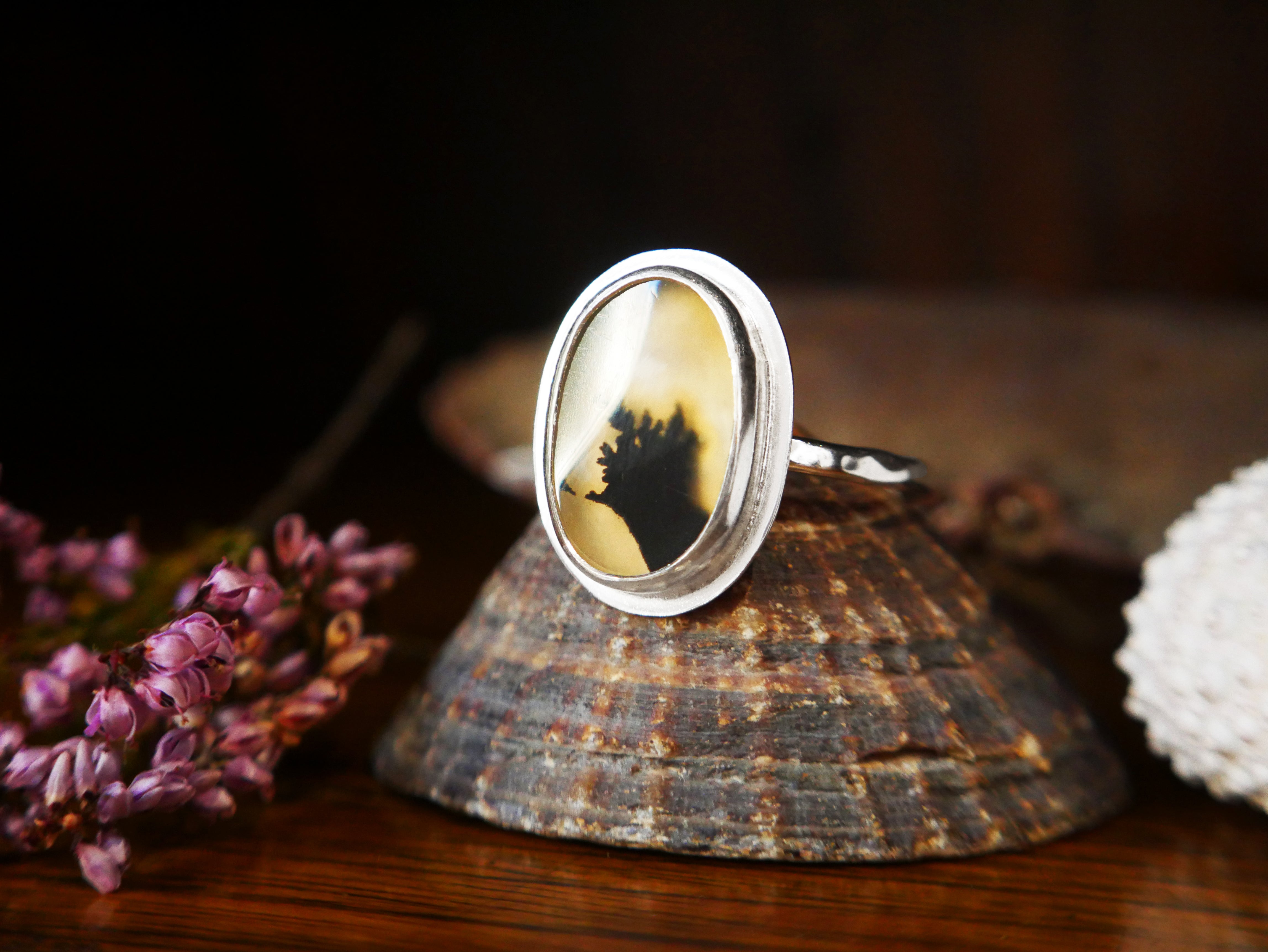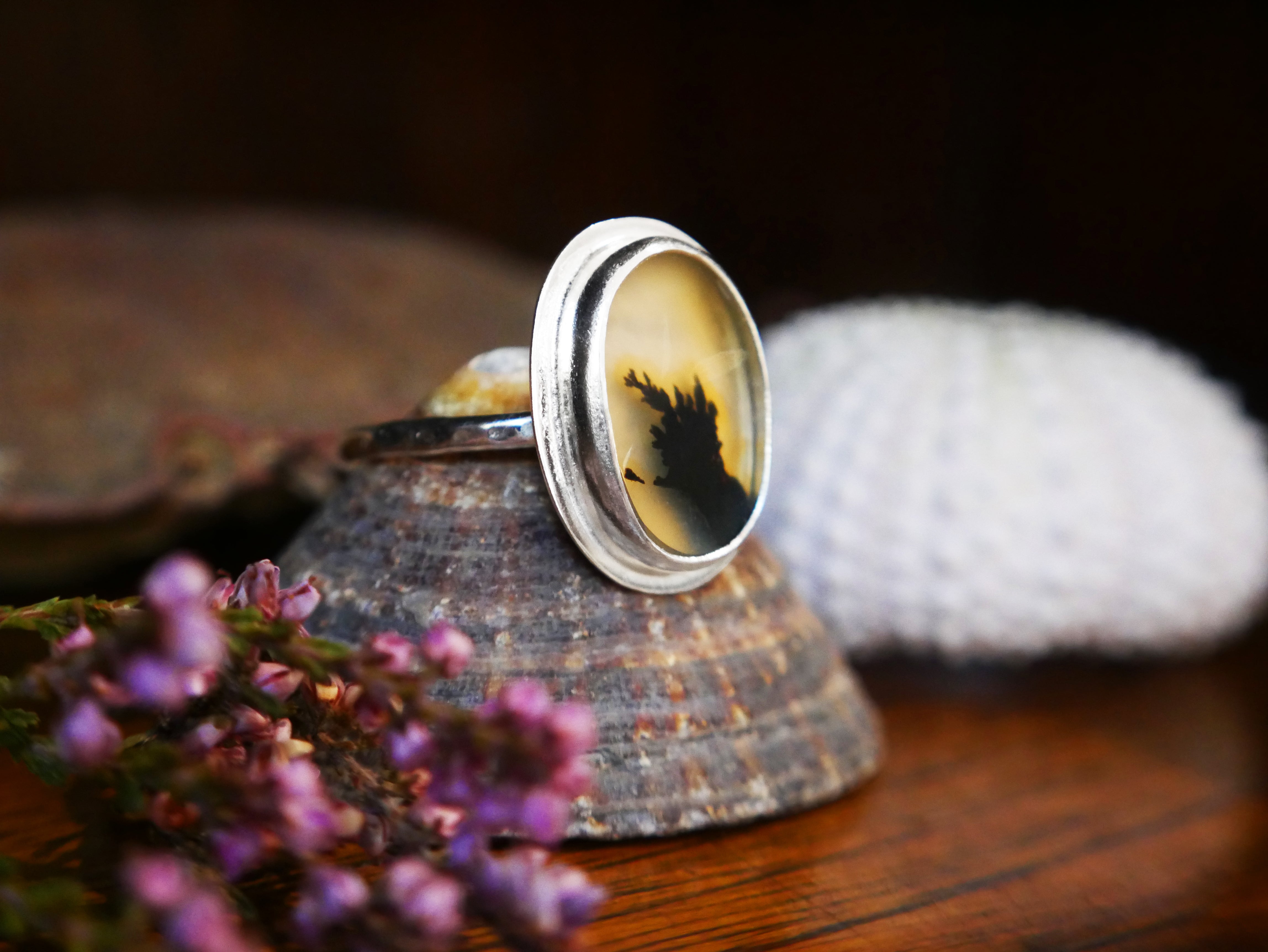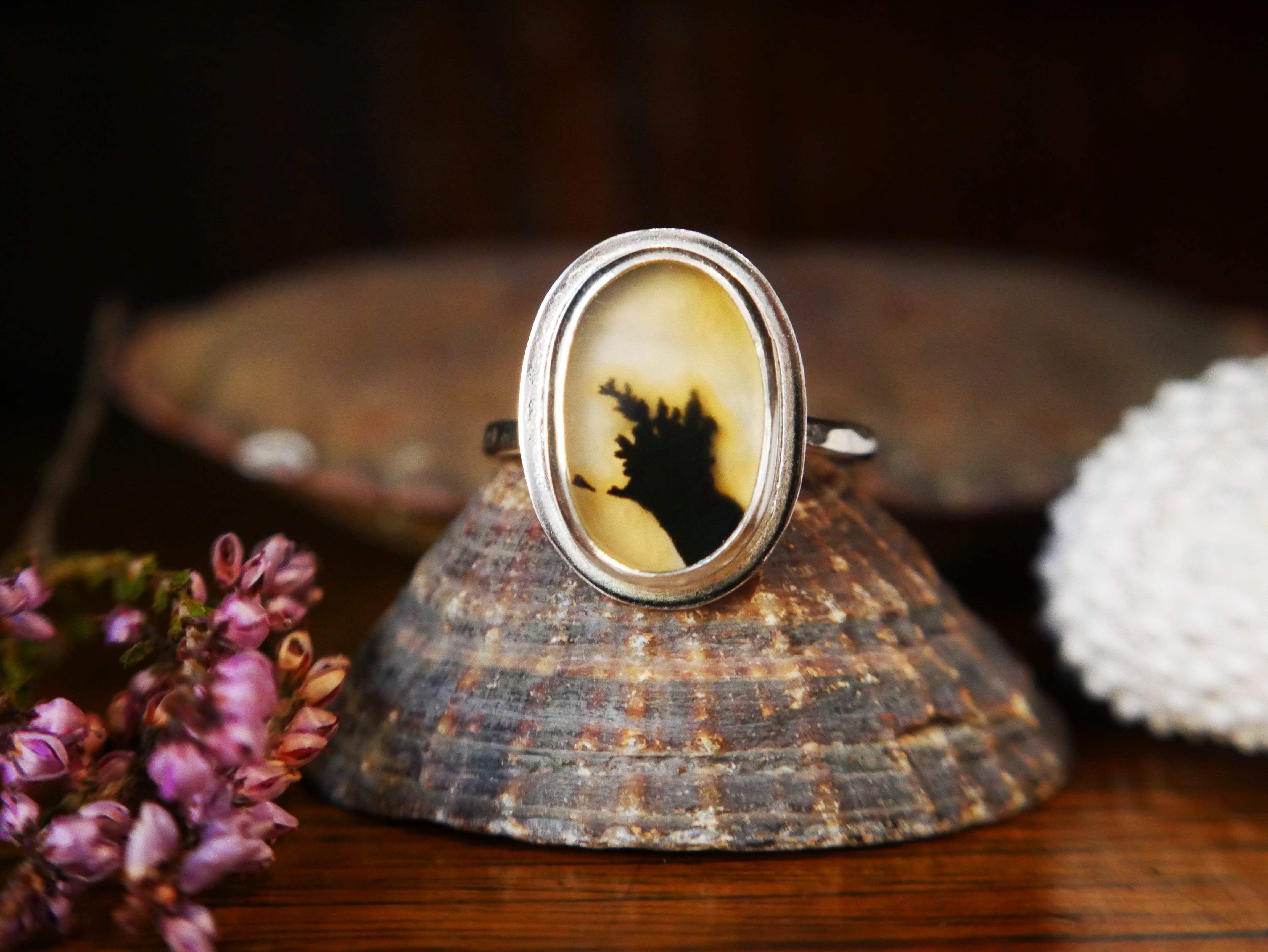Set in this ring is a dendritic agate, a rare, one of a kind gemstone with a natural pattern resembling that of enchanting Scottish seaweed. This gemstone was cut by a Glasgow based lapidary expert and chosen, set and designed by us.