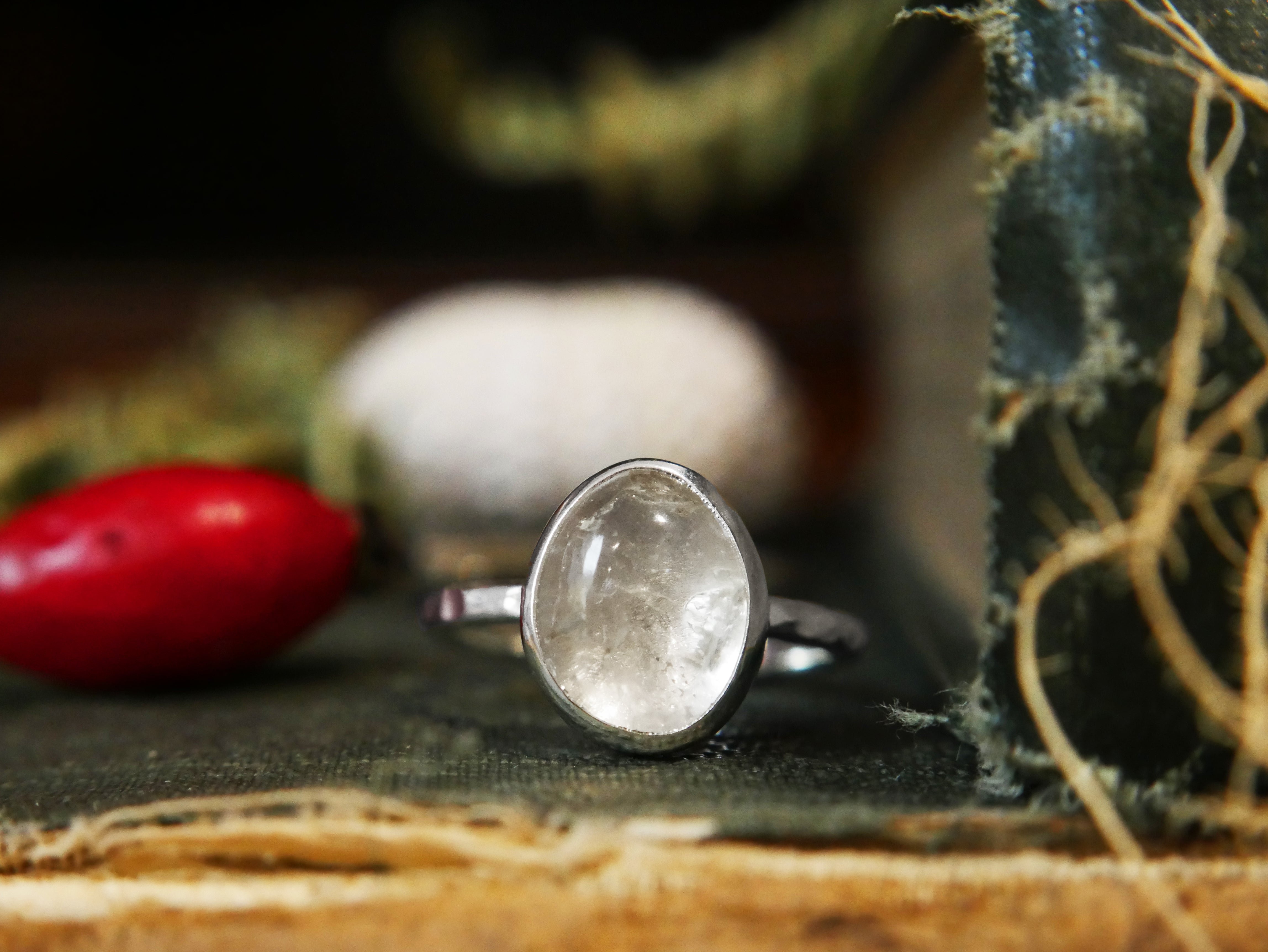 Inspired by the snow and ice which blankets Glencoe every Winter, this ring was made with a beautiful, hand chosen Herkimer diamond slice. The inclusions inside the stone mimic falling snow and is truly a wonder to wear.