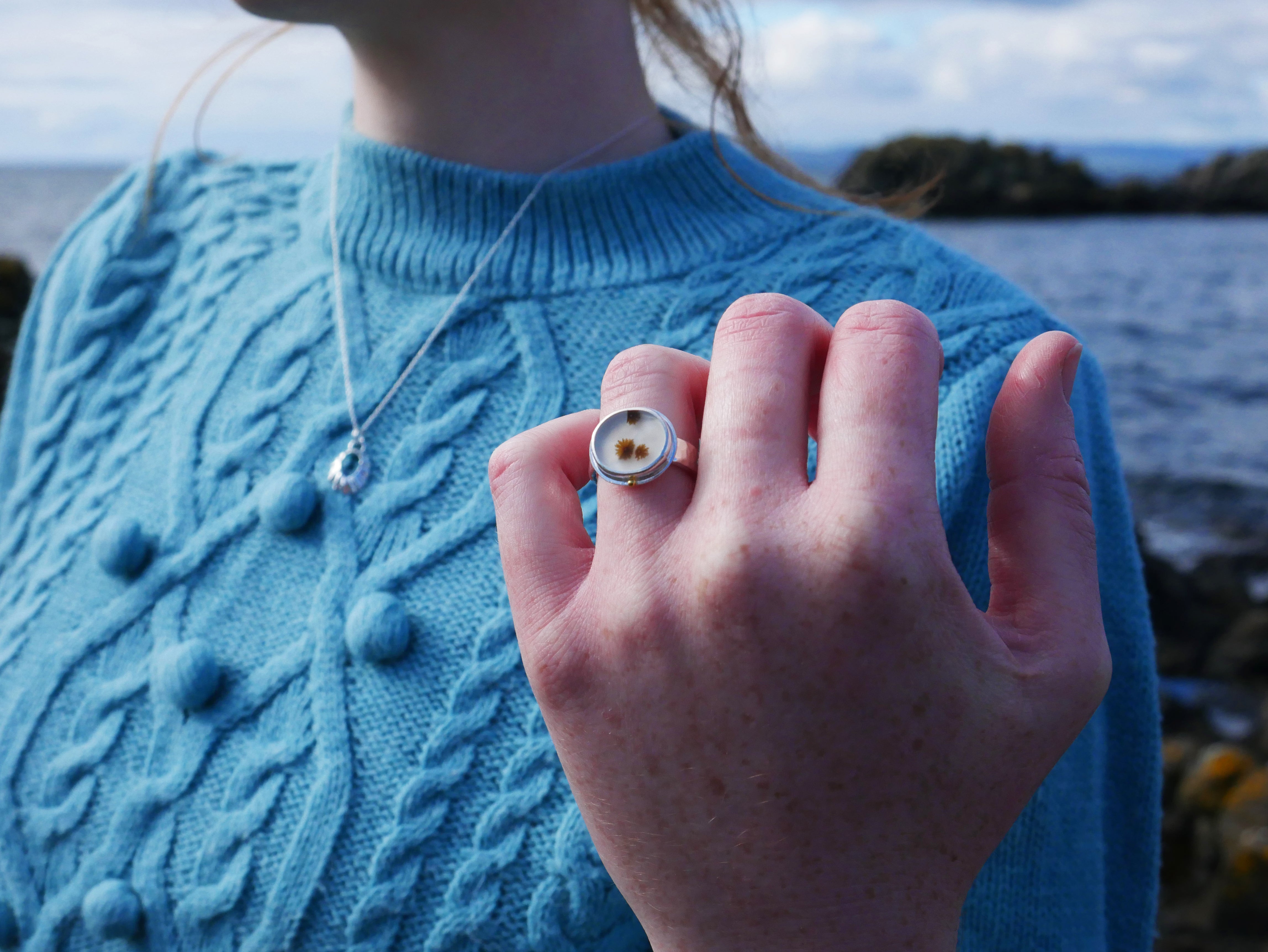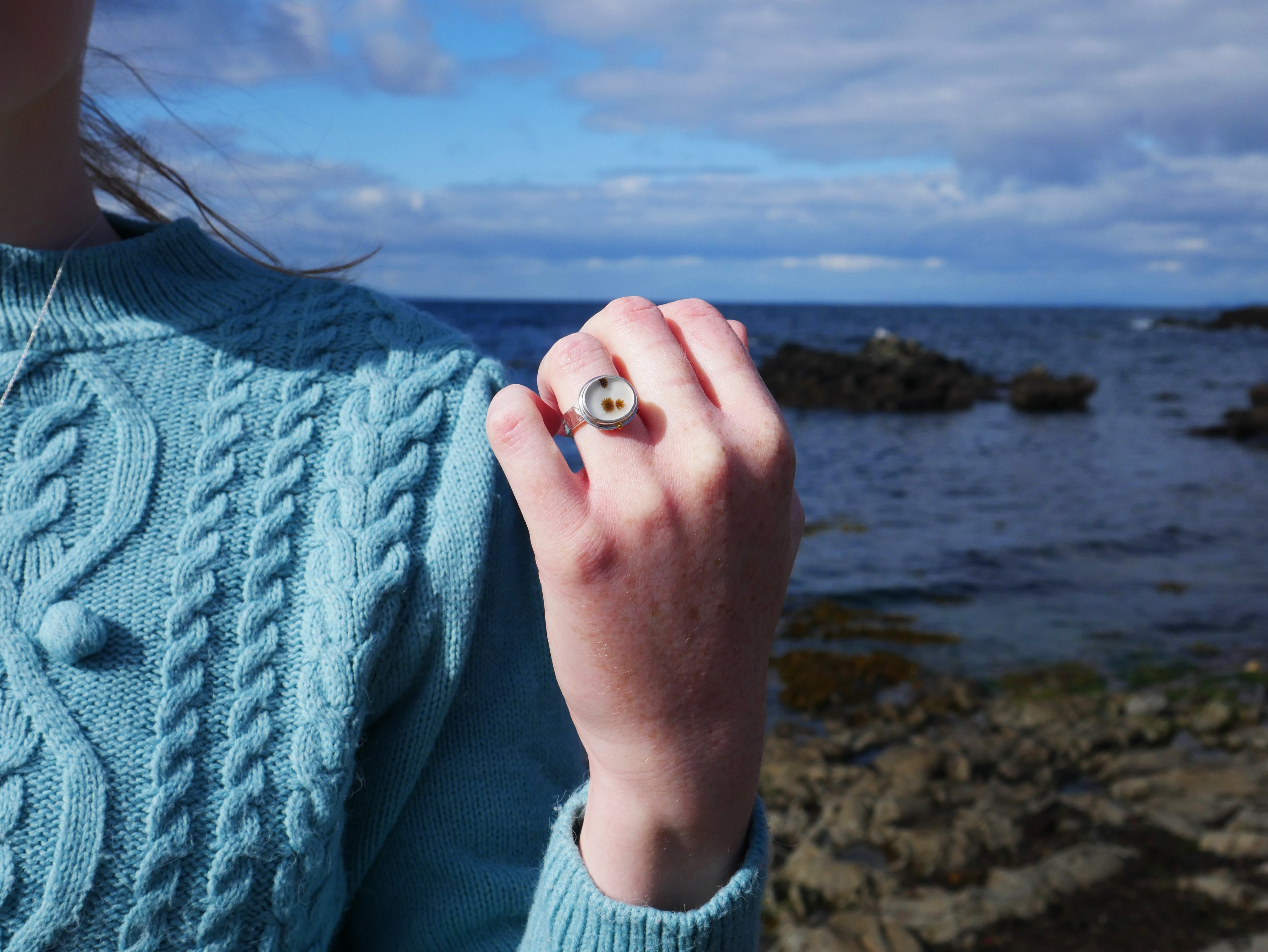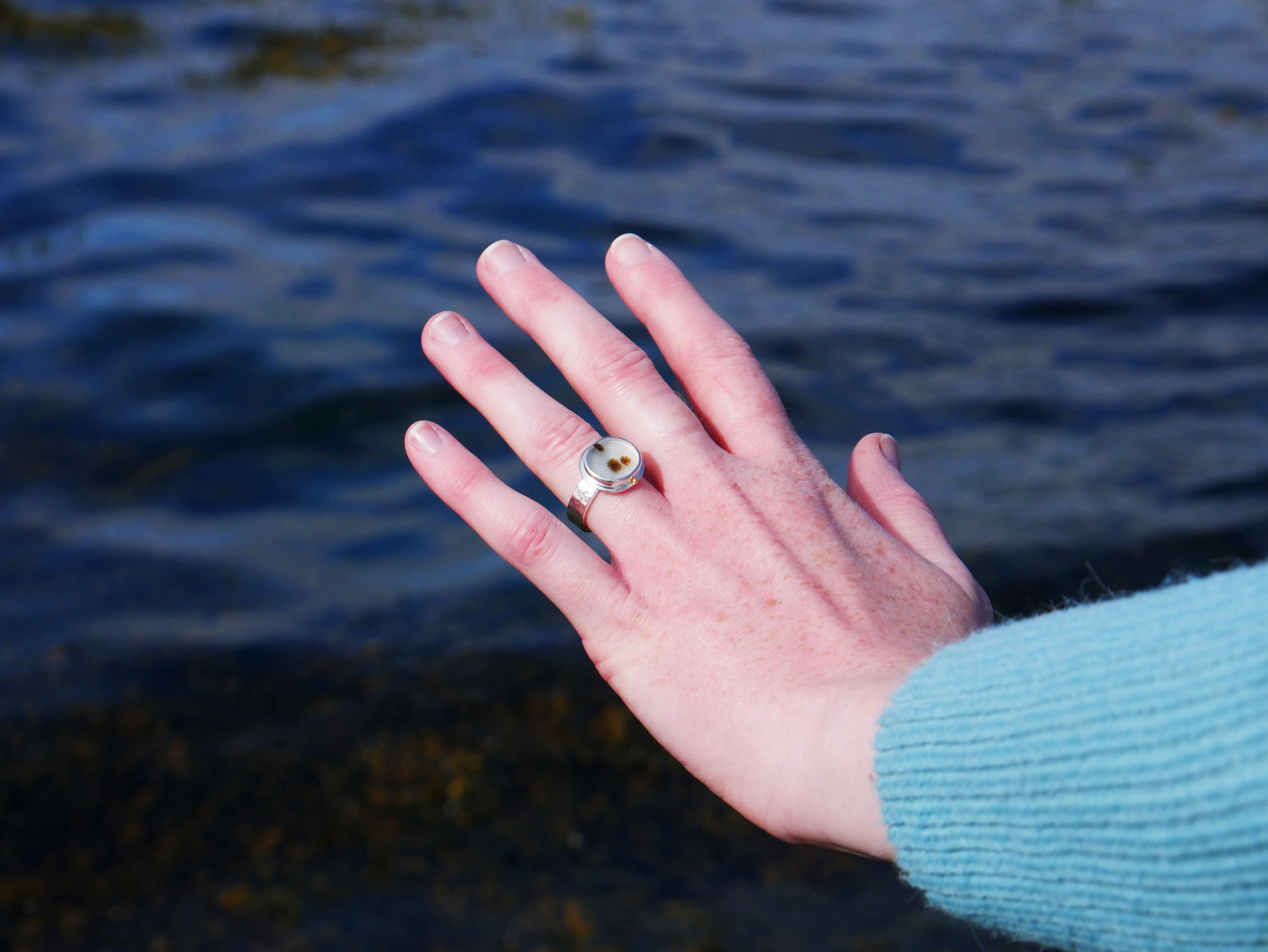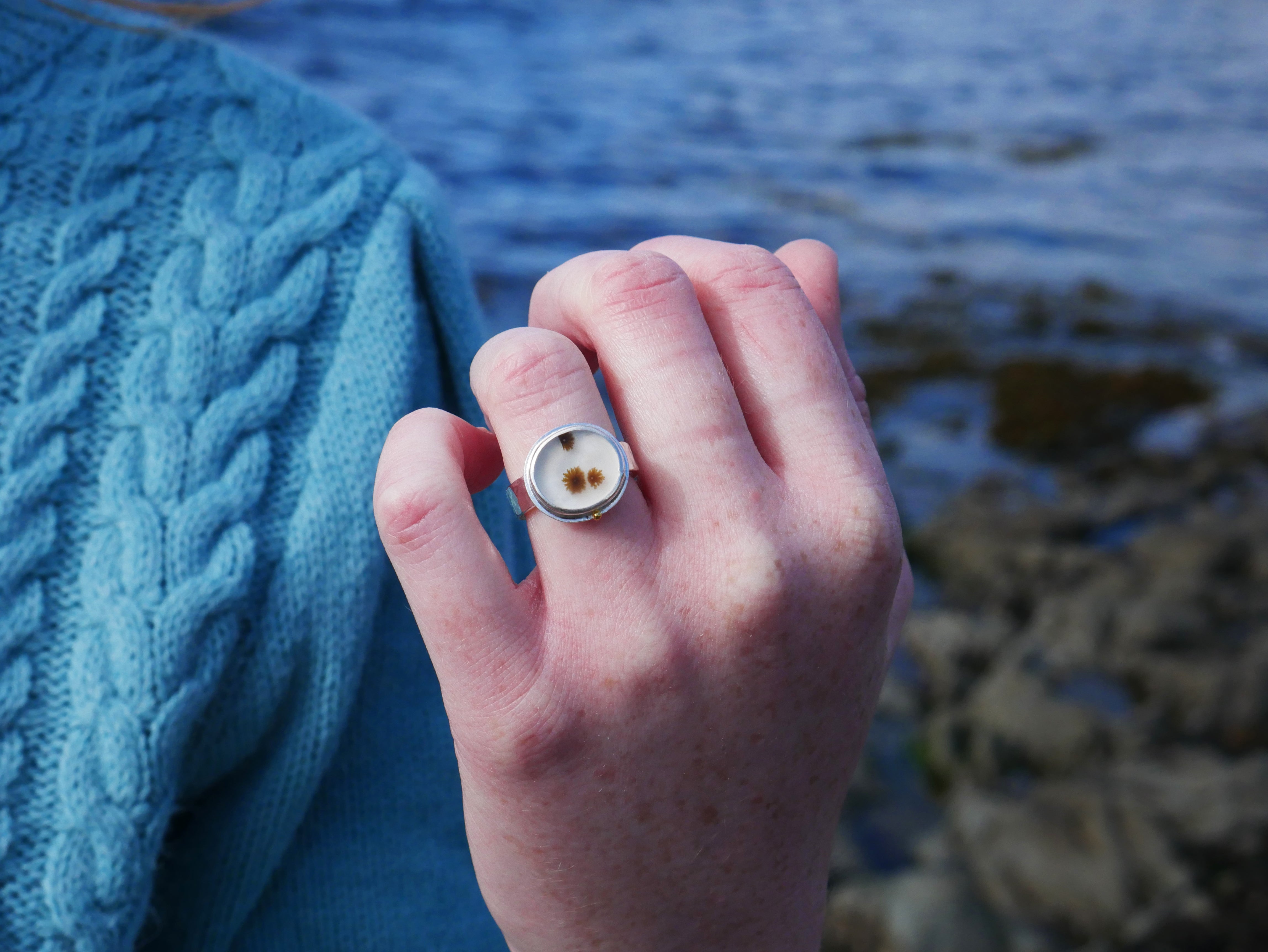 Set in this ring is a dendritic agate, a rare, one of a kind gemstone with a natural pattern resembling that of enchanting Scottish seaweed. This gemstone was cut by a Glasgow based lapidary expert and chosen, set and designed by us.