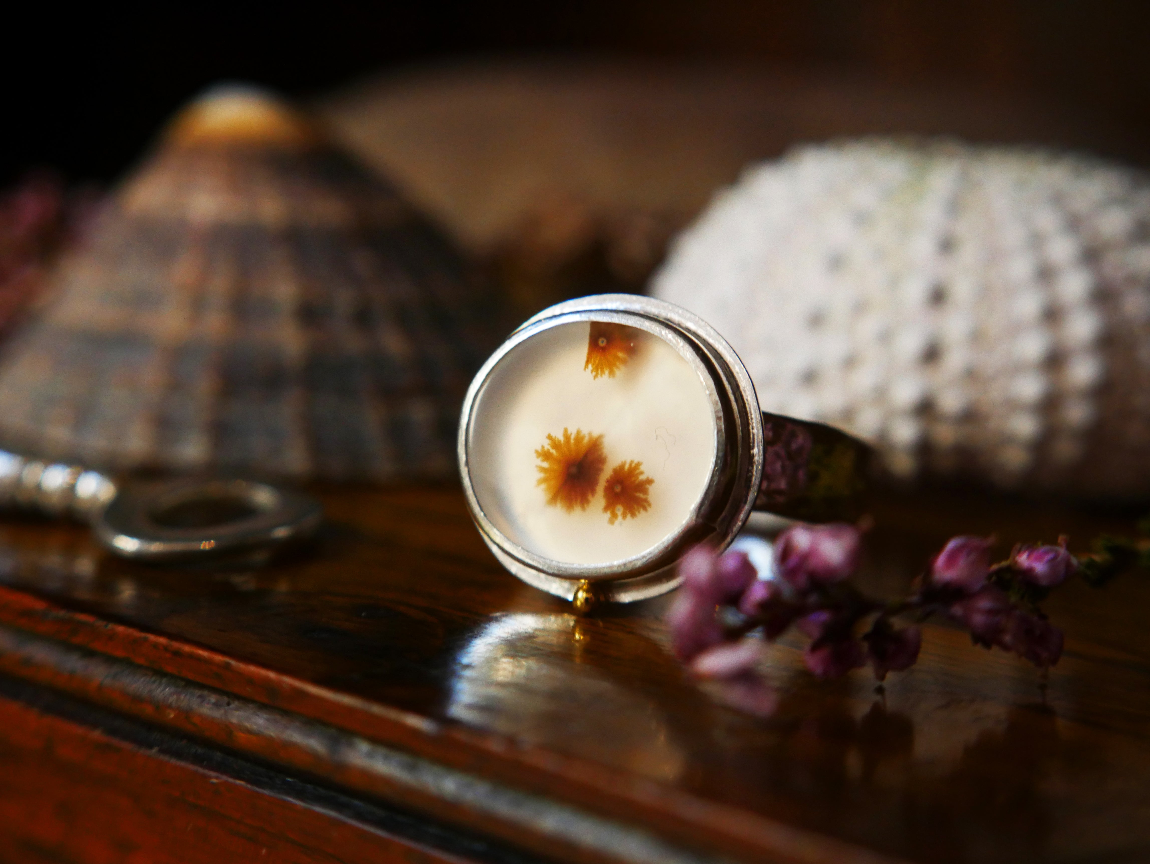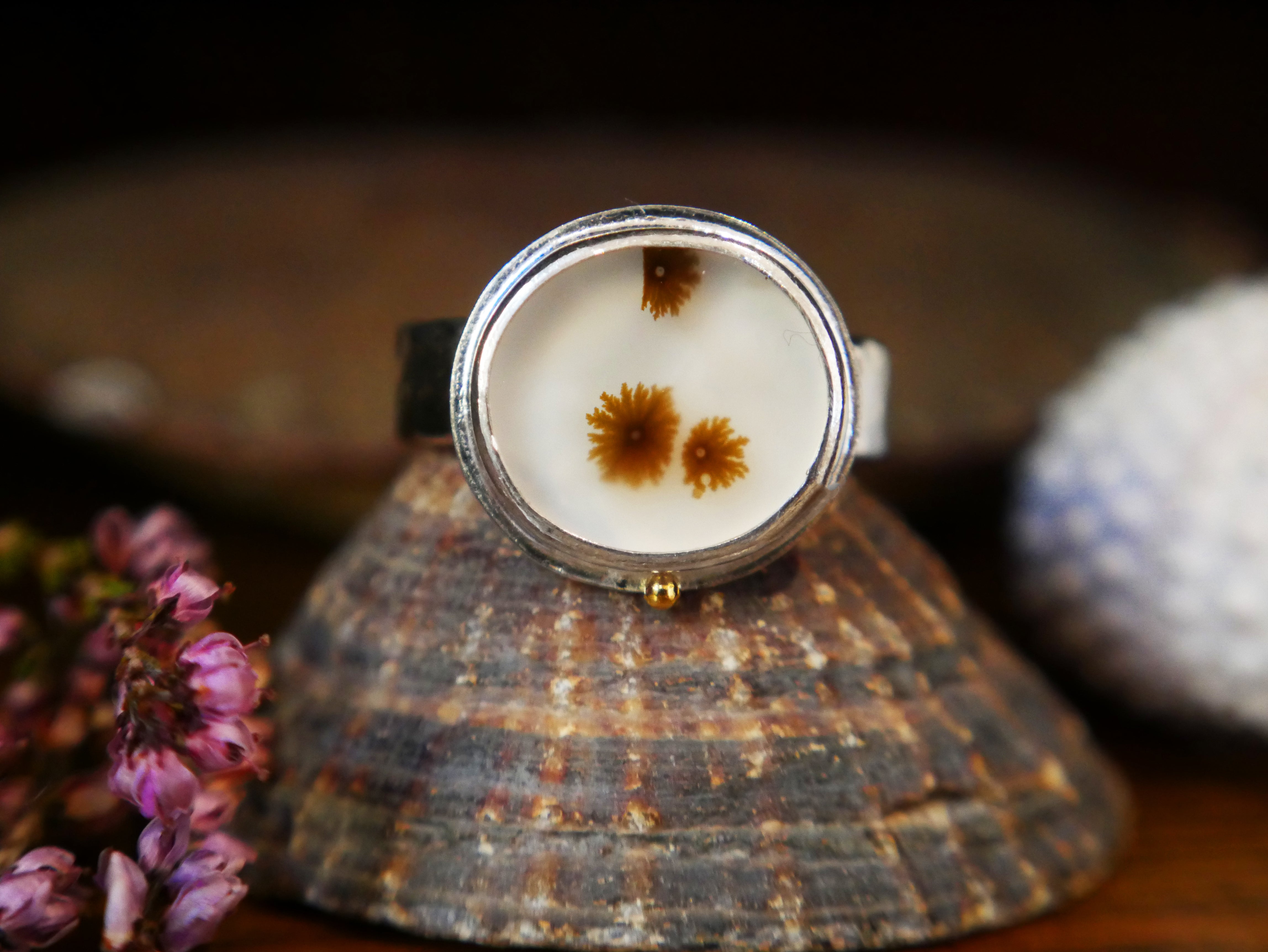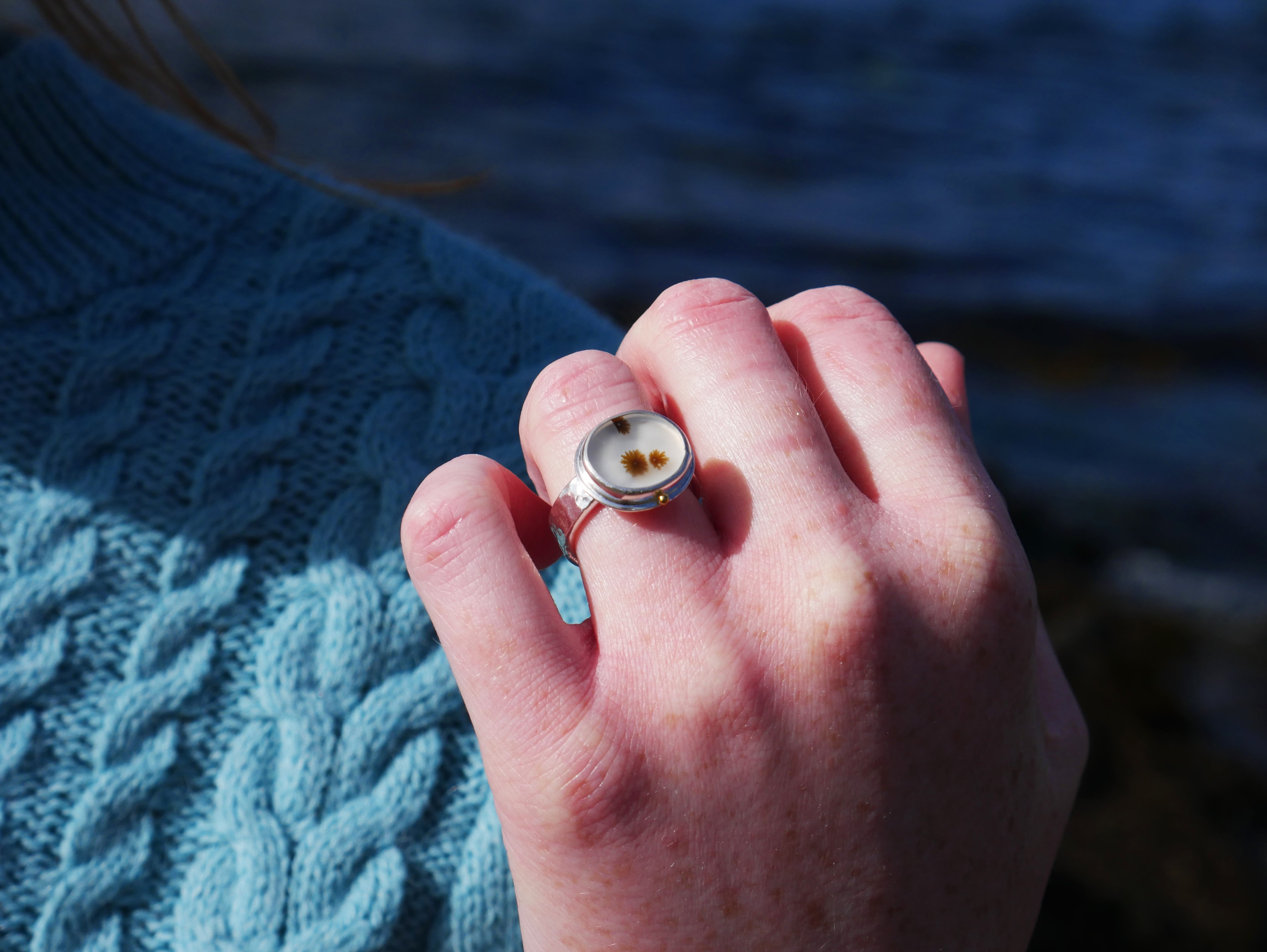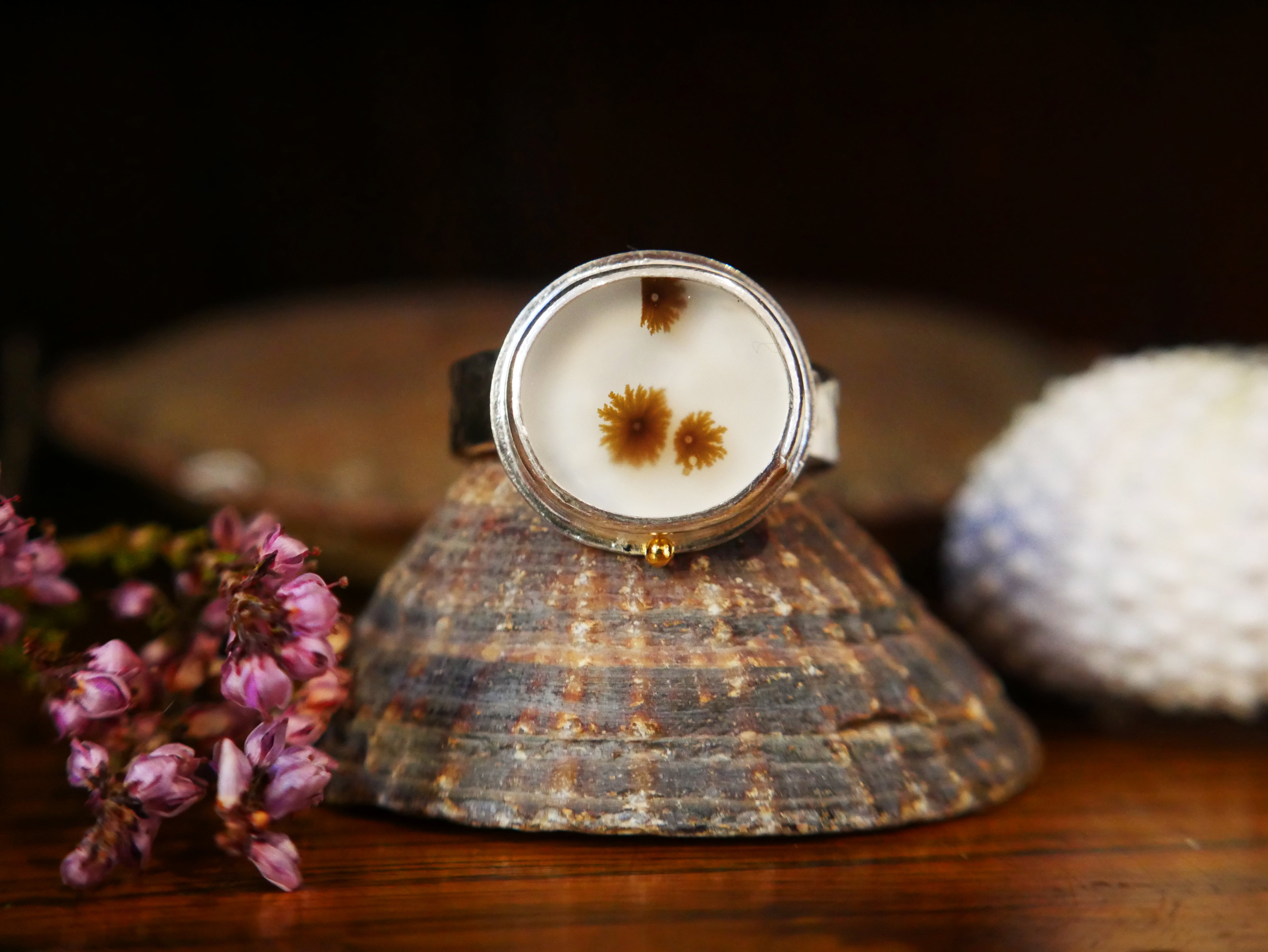 Set in this ring is a dendritic agate, a rare, one of a kind gemstone with a natural pattern resembling that of enchanting Scottish seaweed. This gemstone was cut by a Glasgow based lapidary expert and chosen, set and designed by us.