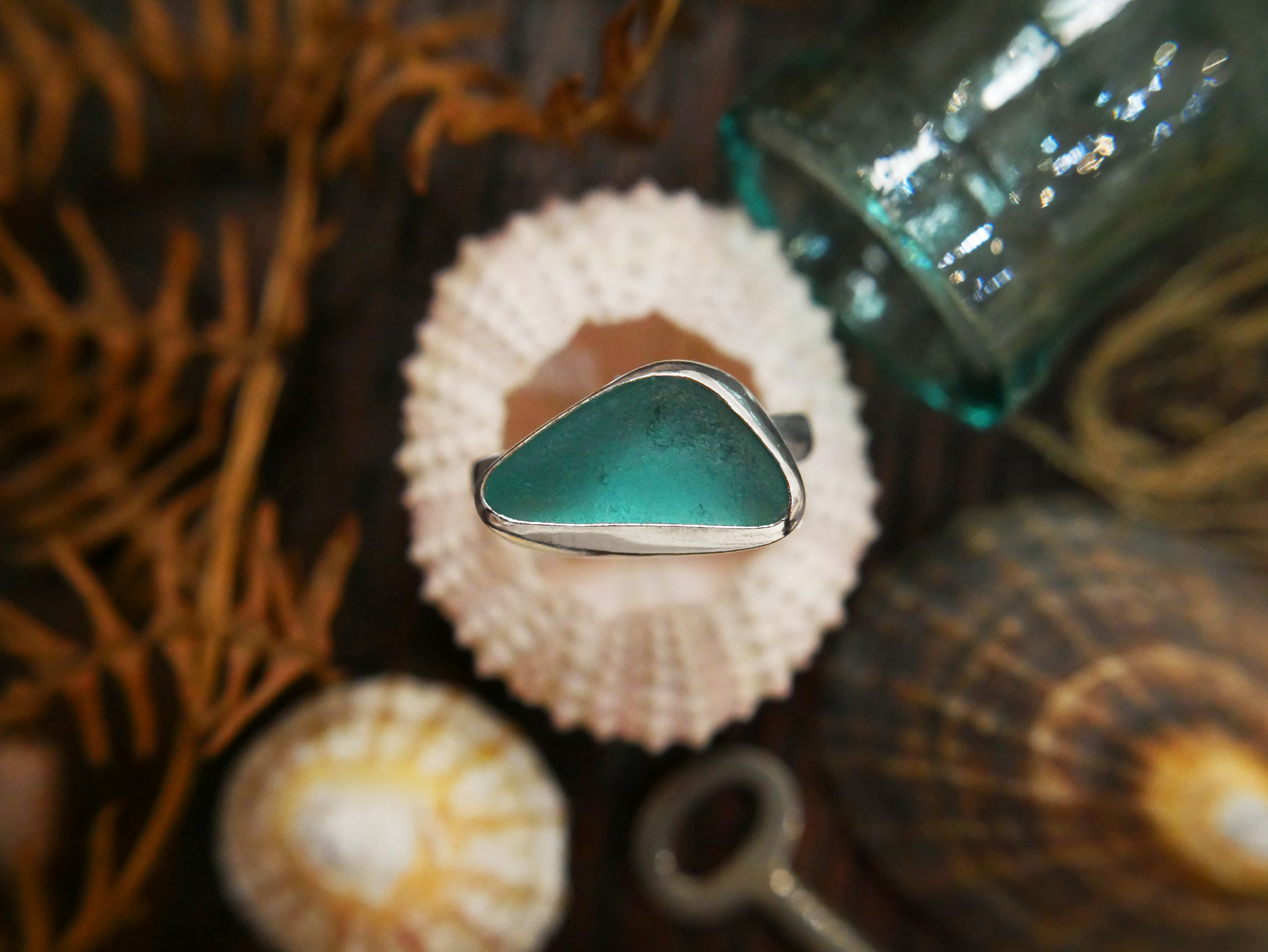 The aqua sea glass in this ring likely originates from 1837 - 1900 and was most likely from decorative Victorian tableware or seltzer bottles. It has a fascinating tone that changes in different lighting.