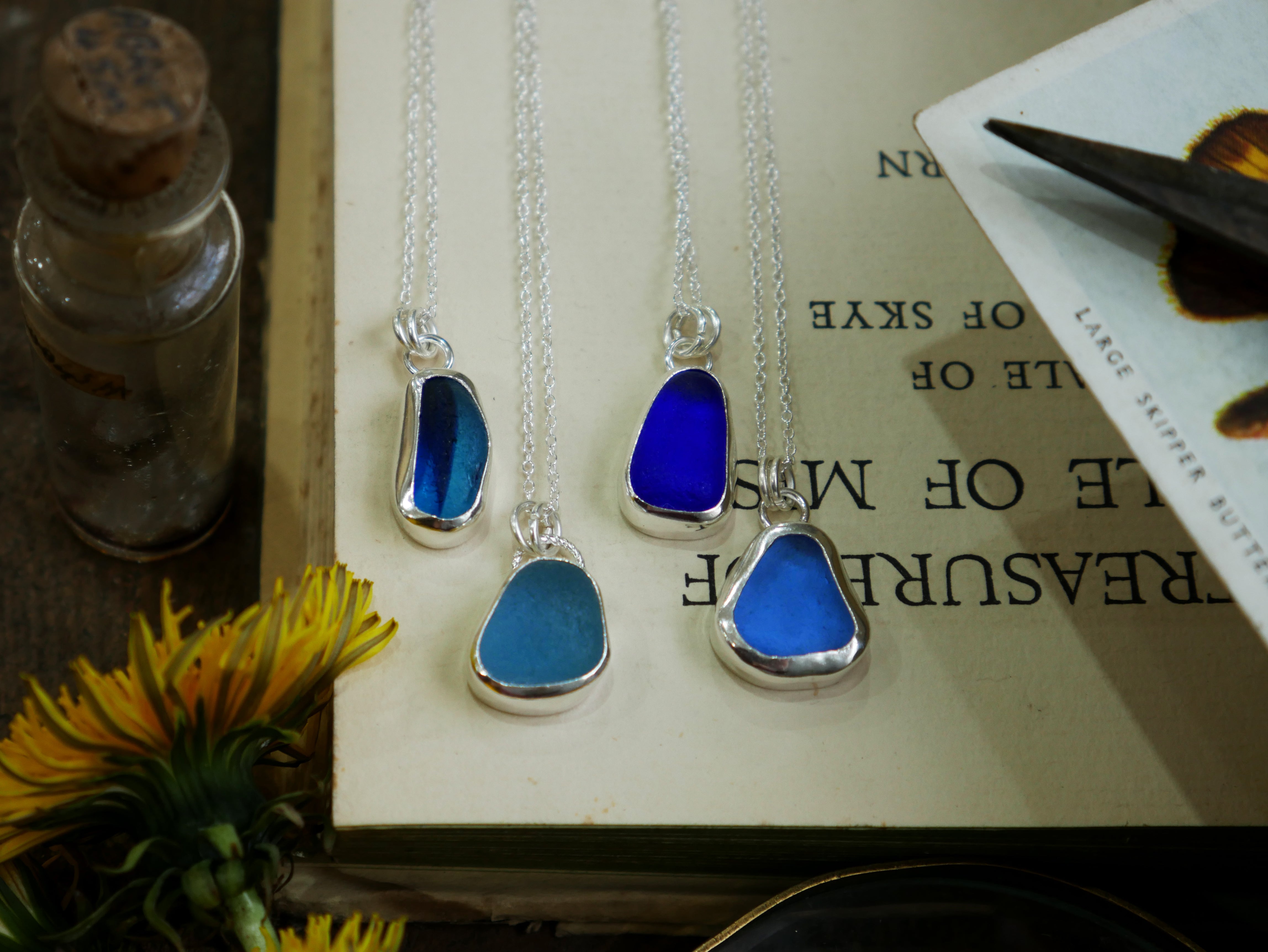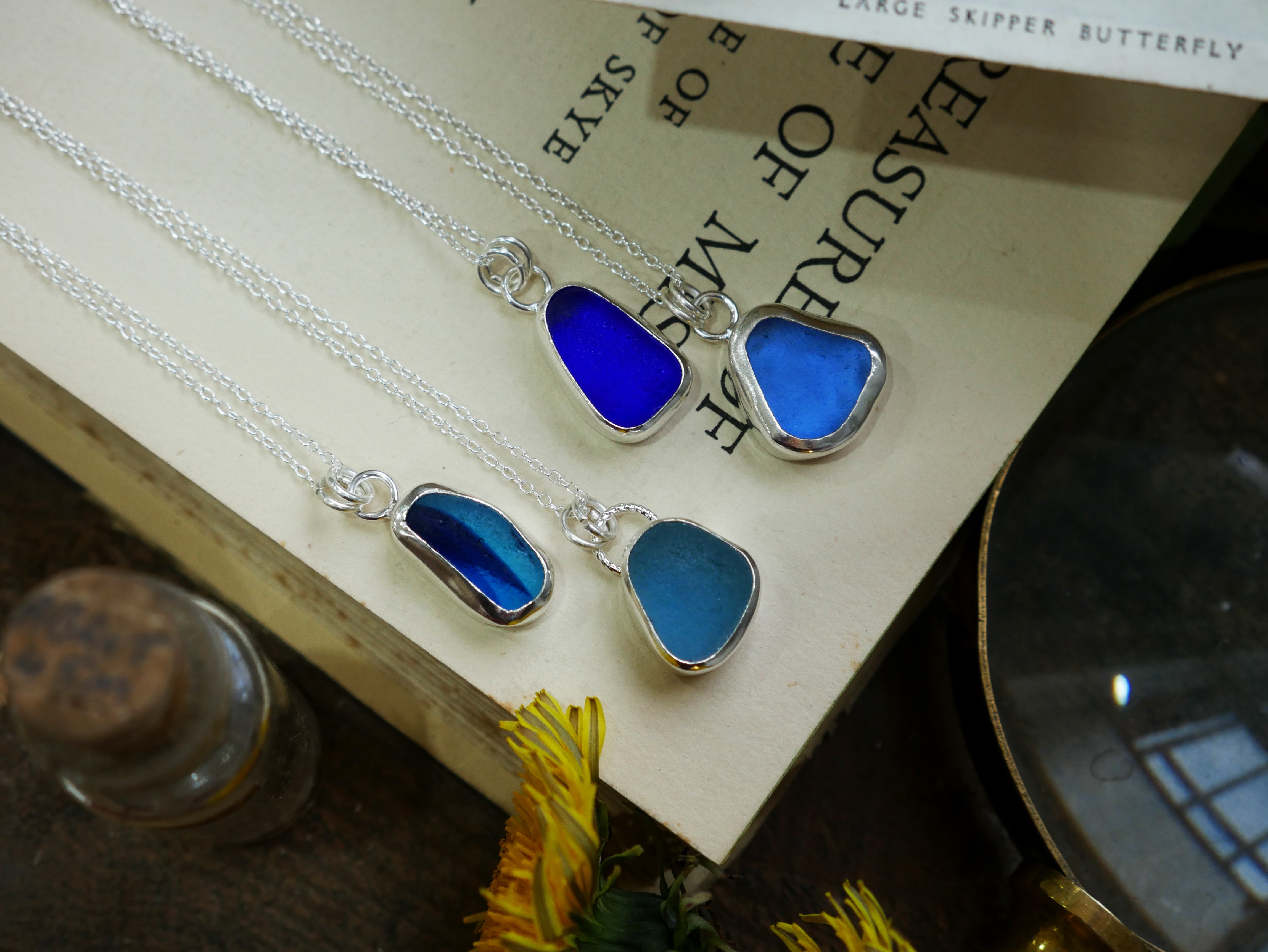 The bluebells are starting to spring up in the ancient woodlands here in Scotland and at the same time, new storms bring up treasures that have been tumbling in the sea for over a century. These fascinating blue sea glass pendants represent the very finest colours that can be found on our shores.