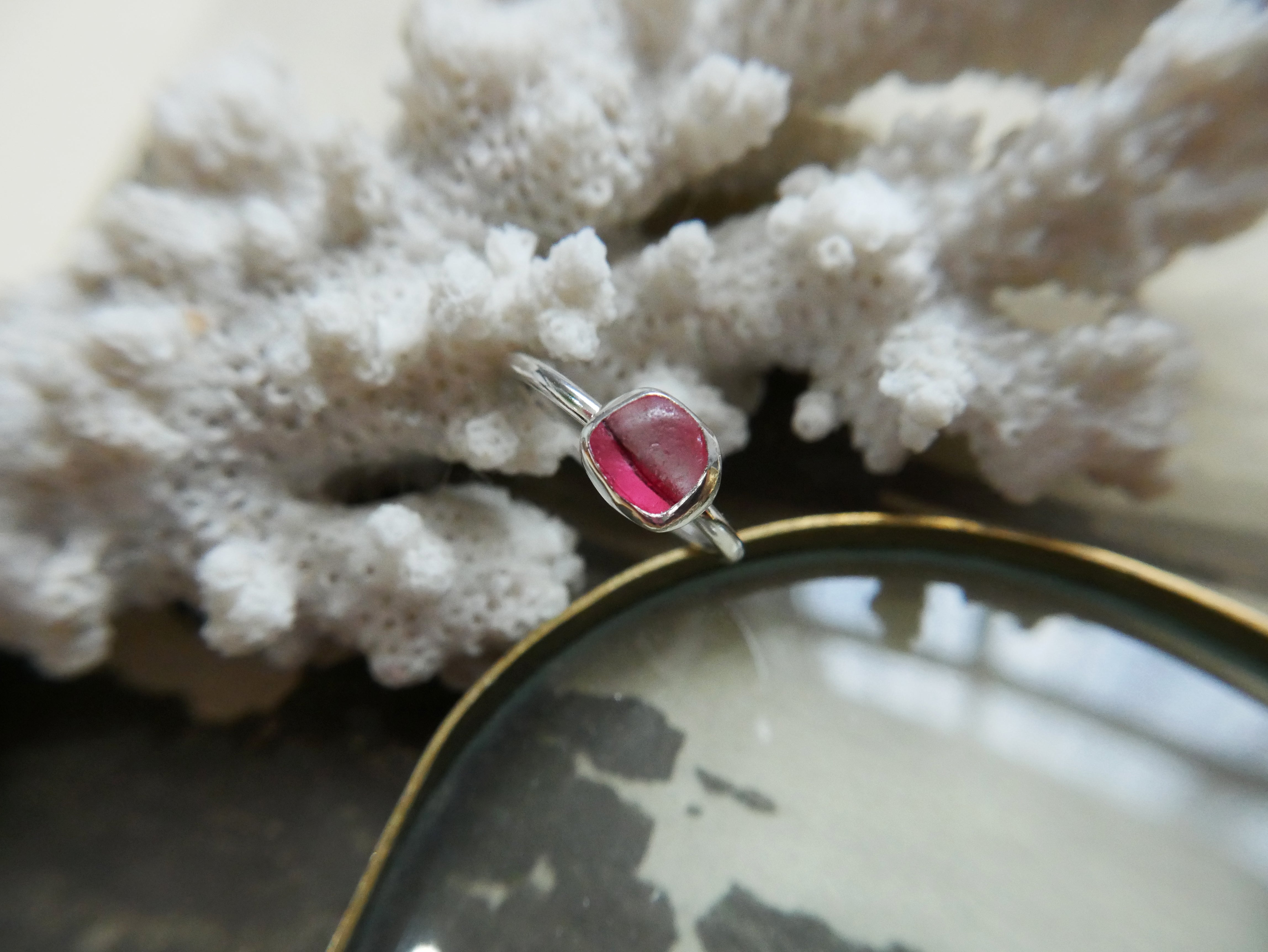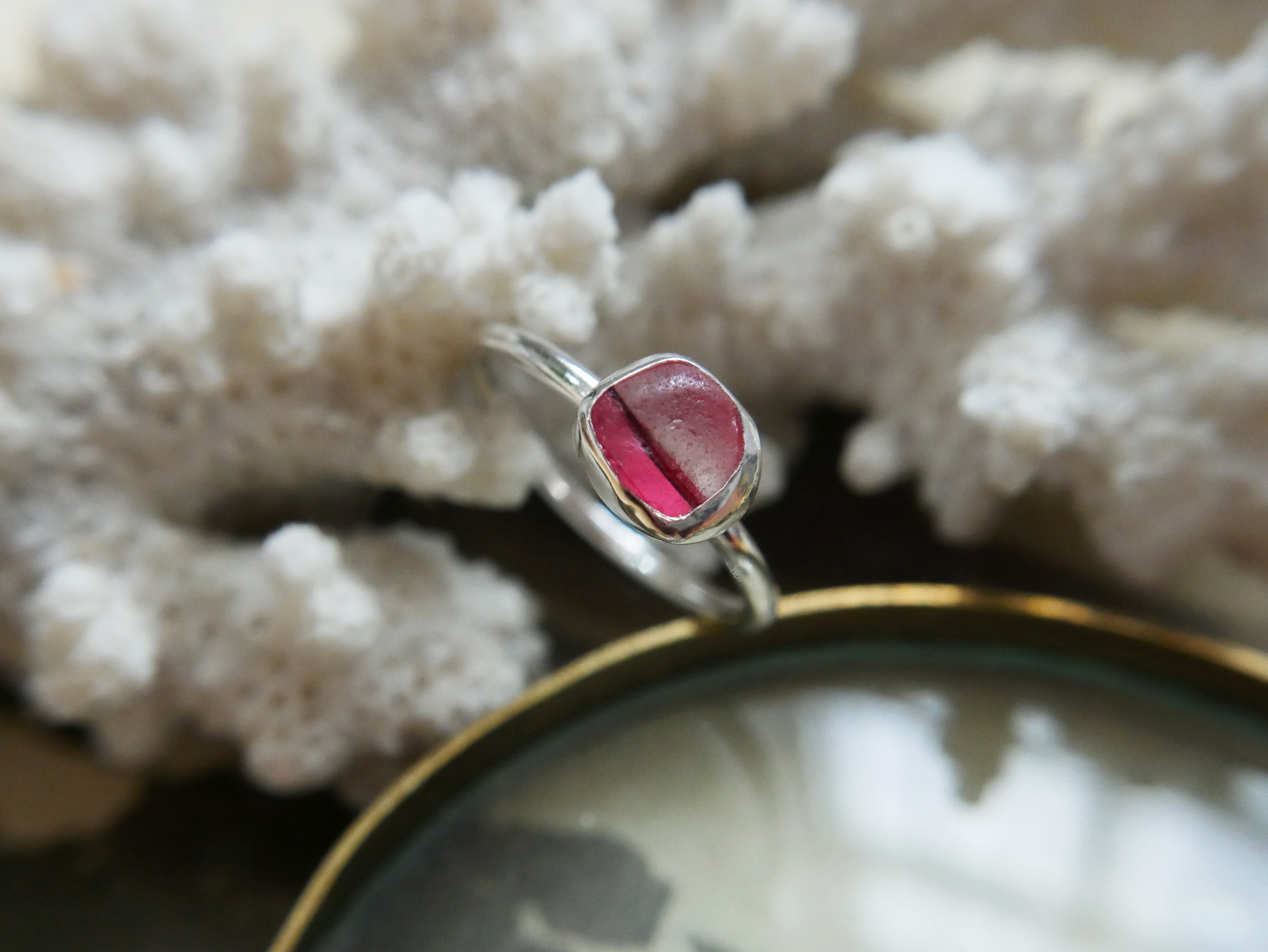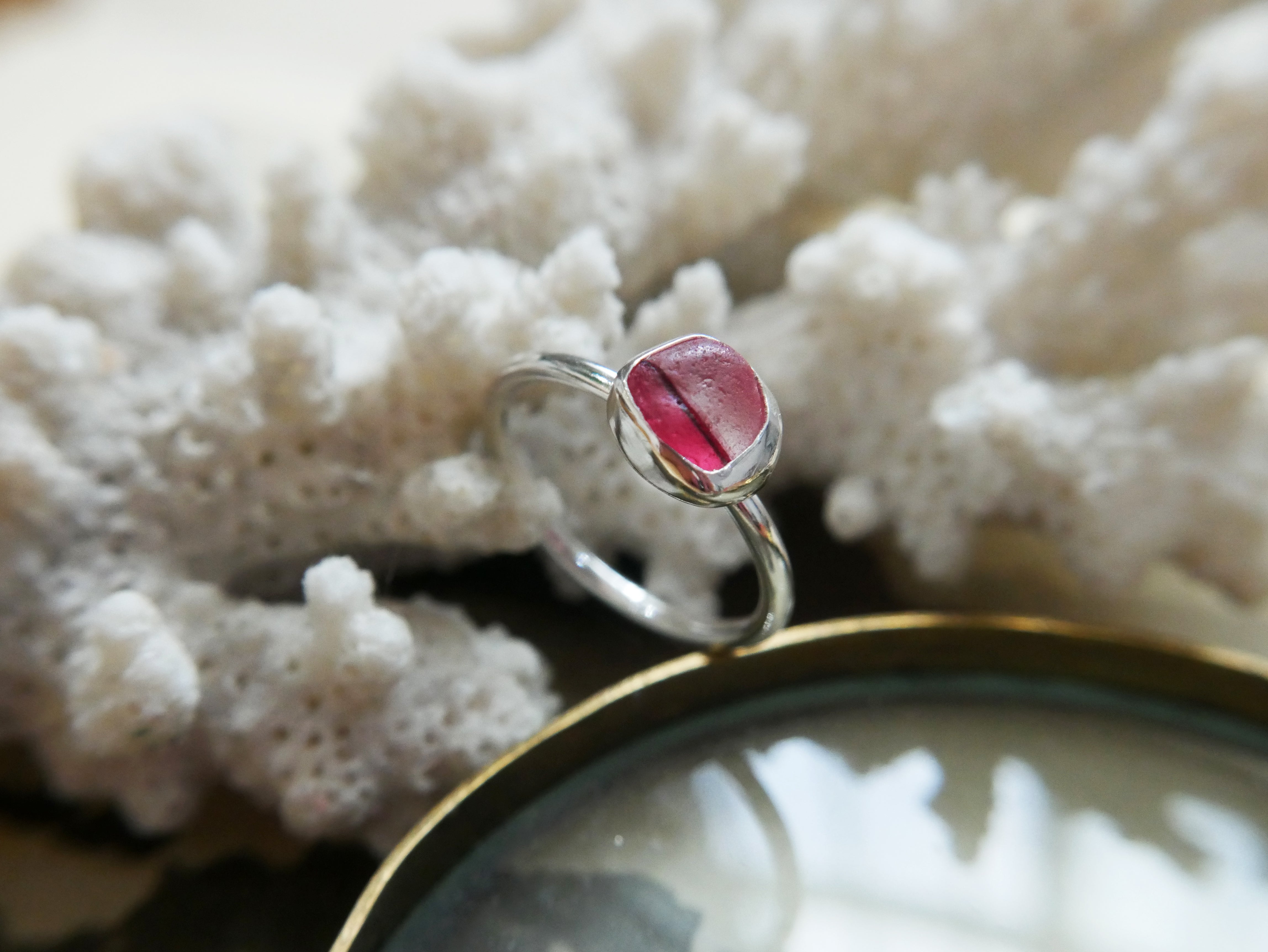 Seaham (in Northern England) once had several ornamental Victorian glass factories lining its coasts. Nowadays these precious pieces of sea glass in multi colours wash up on the shores. Laura was delighted to find this piece on one of her travels there and has kept it to design into a one of a kind, very special ring.