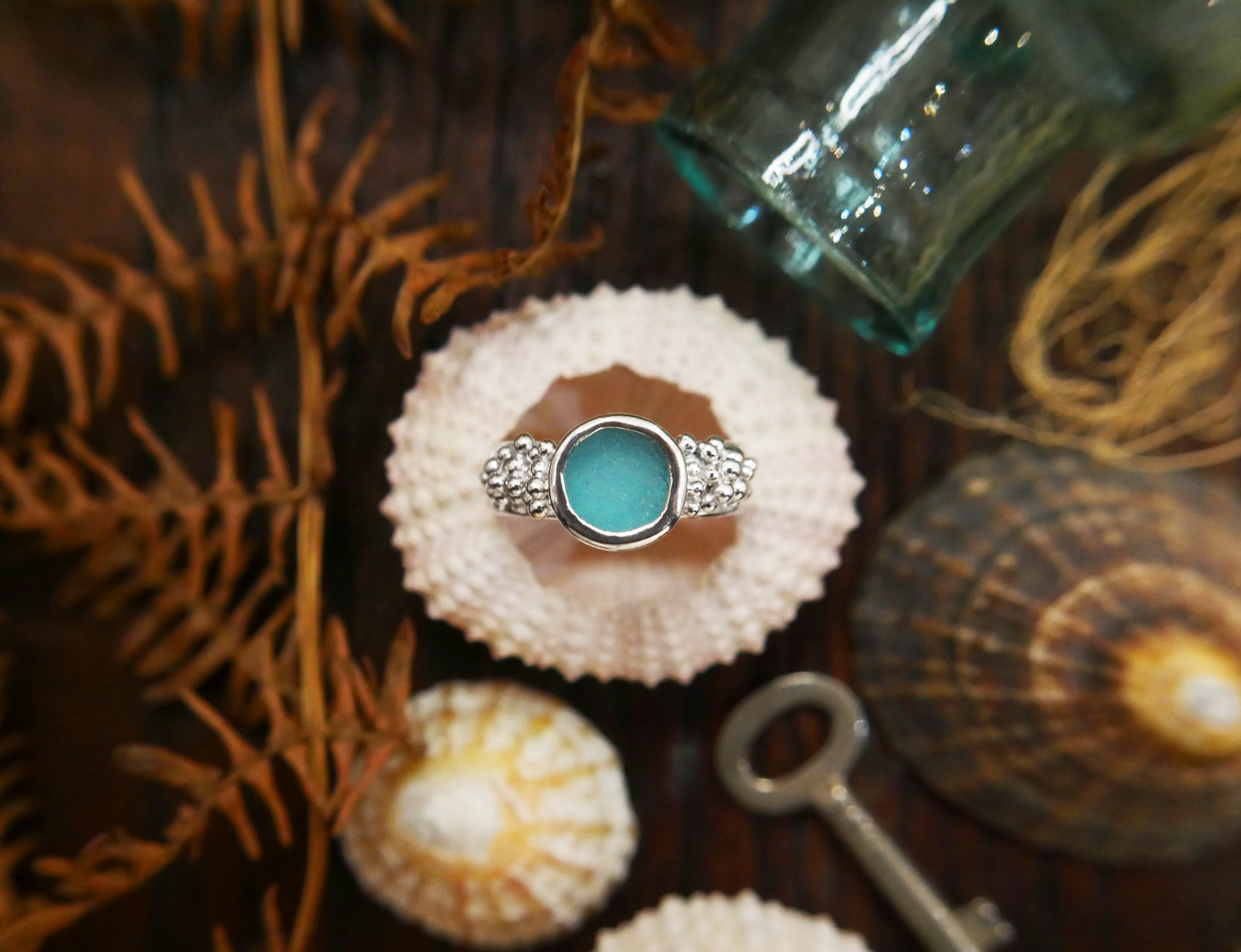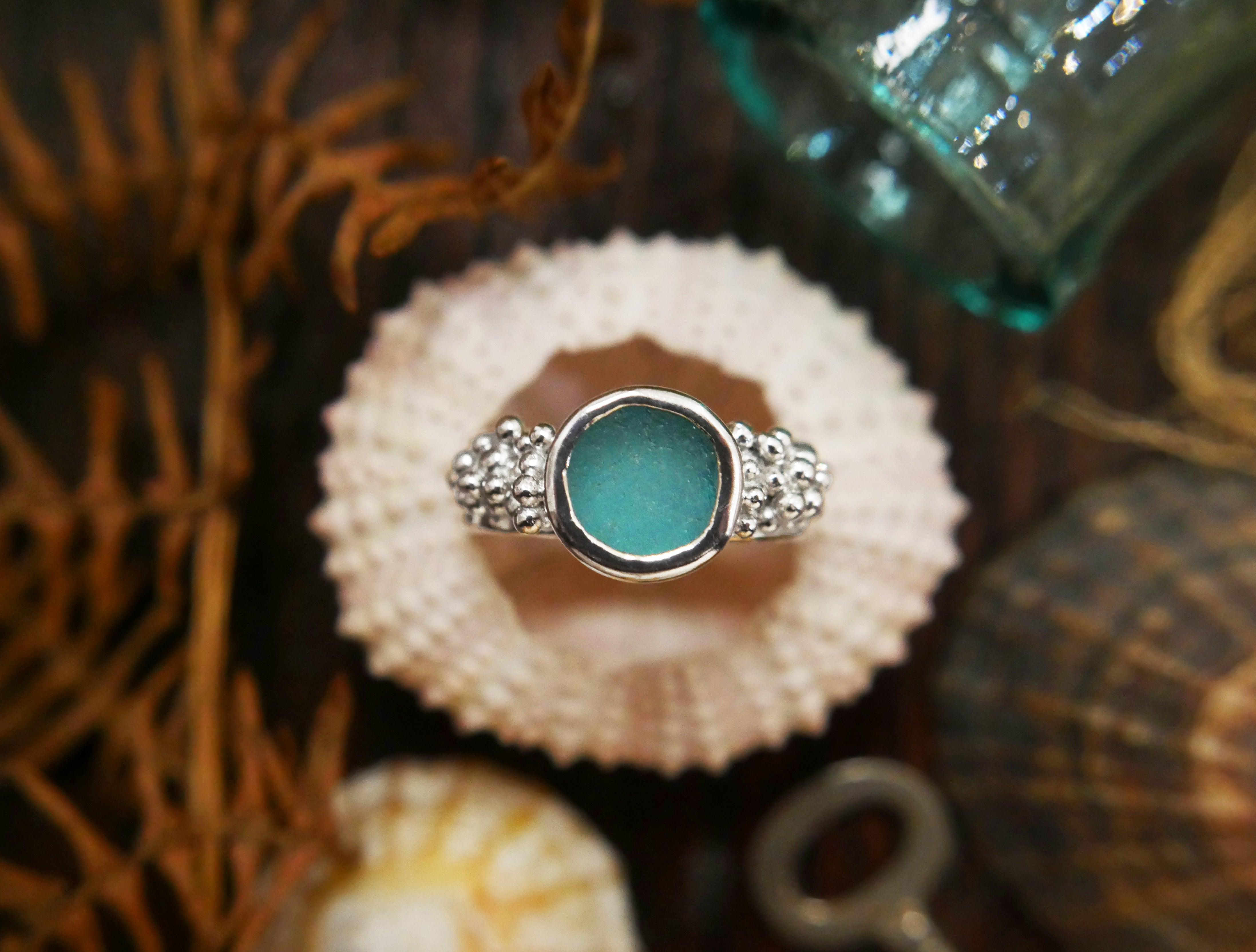 The selkie aqua Scottish sea glass granulation ring in sterling silver - Size P (UK), Size 7.5 (US)