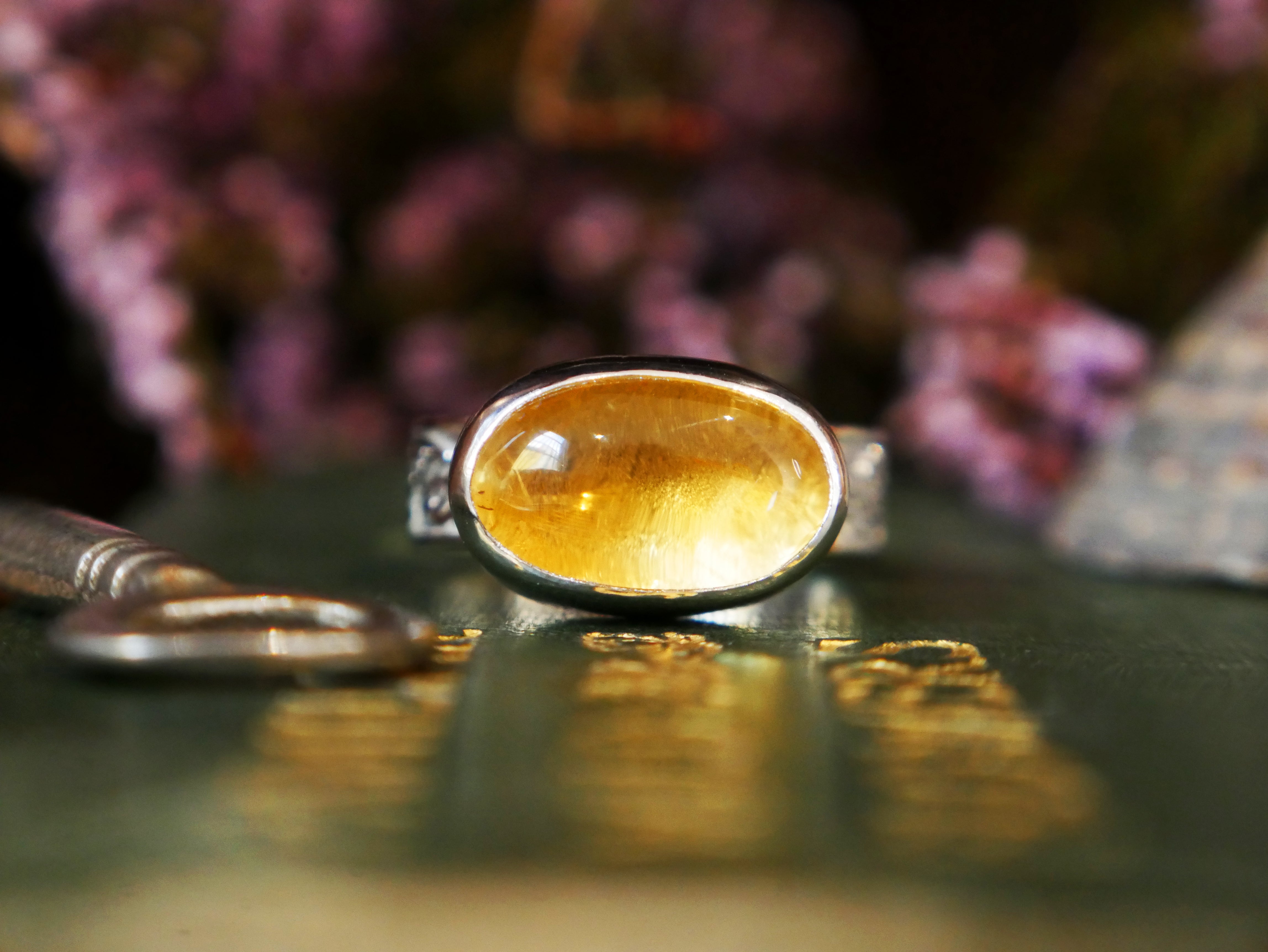 Inspired by the spectacular Autumn colours of the Hermitage at Dunkeld, this ring is the very embodiment of Autumnal creativity and splendour. Featuring a large cabochon citrine as a focal point and a band detailed with stunning oak leaves.