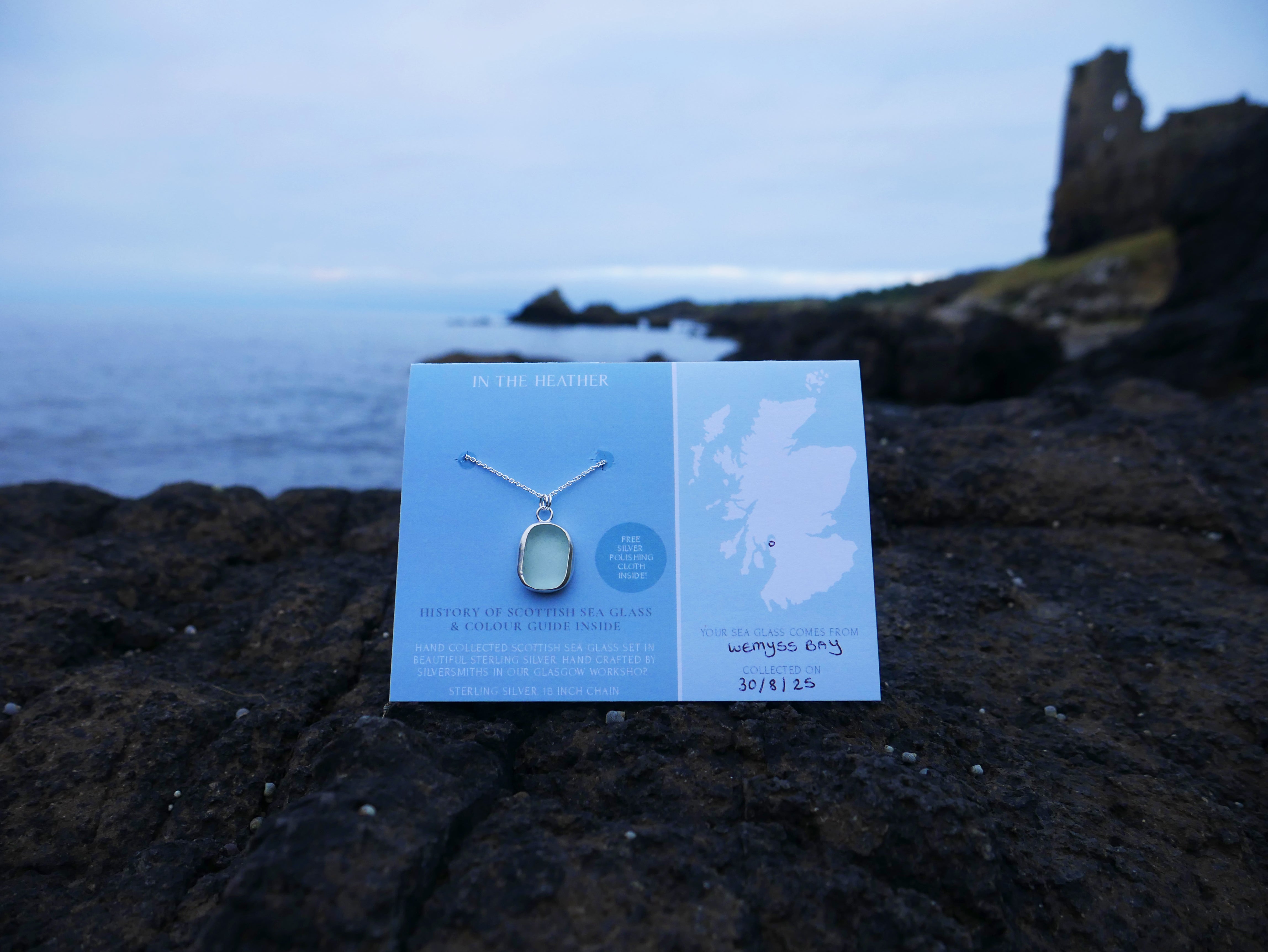 Included is a map of Scotland showing you exactly where your sea glass piece came from, the date it was collected, a colour rarity guide (explaining the age of the sea glass and how the colour was formed in the original glass making process), the history of Scottish sea glass and a complimentary silver polishing cloth inside.