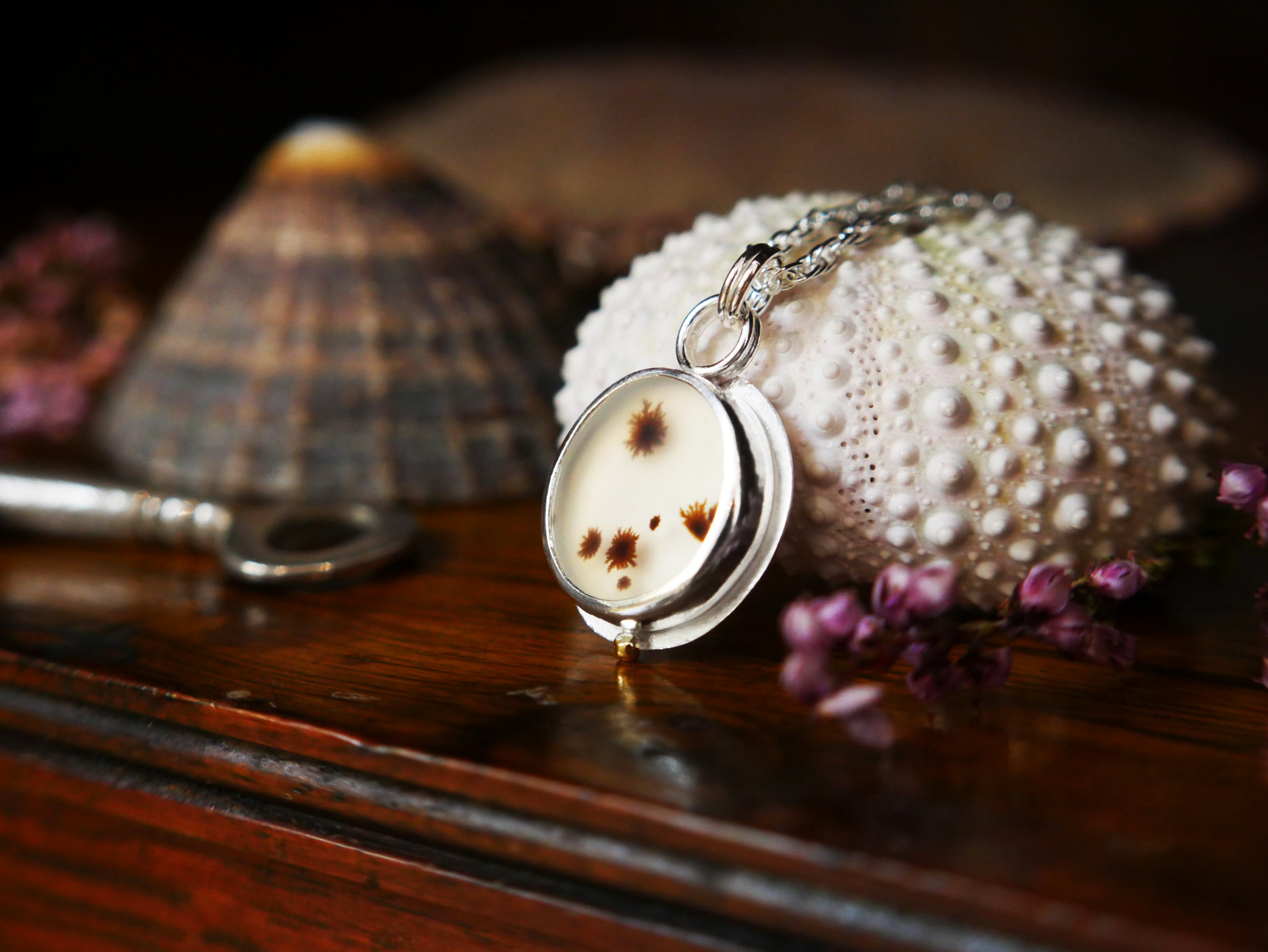 Beautifully set in a modern bezel, this one of a kind Scottish seaweed necklace is a treasure for anyone whose heart belongs to the sea.