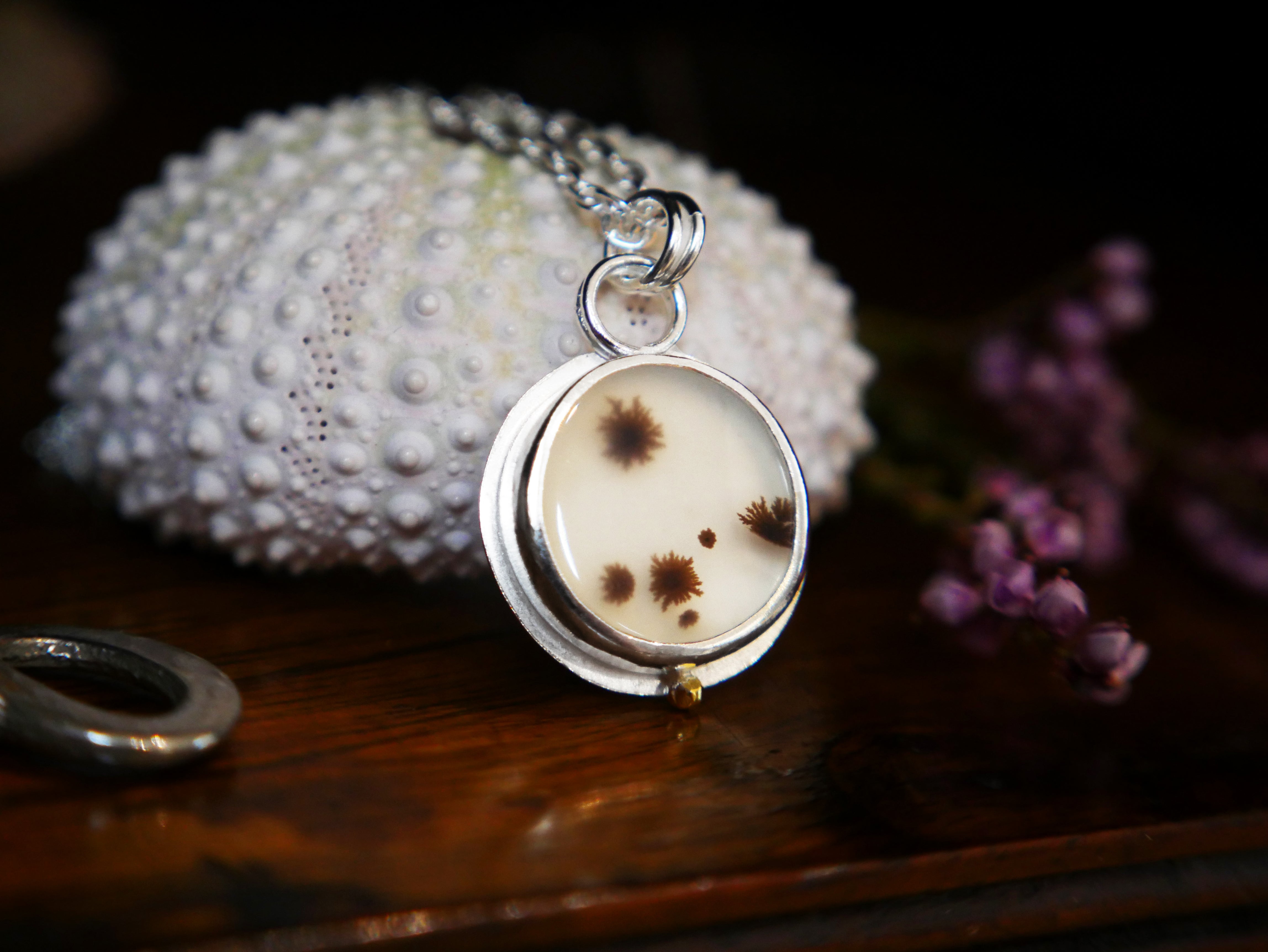 Set in this pendant is a dendritic agate, a rare, one of a kind gemstone with natural inclusions resembling enchanting Scottish seaweed, gracefully attached to rocks at the bottom of the sea. This gemstone was cut by a Glasgow based lapidary expert and chosen, set and designed by us.